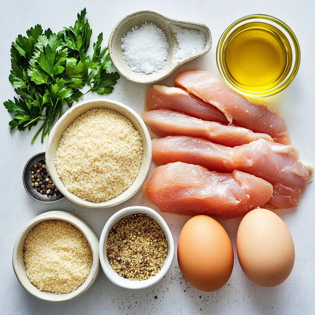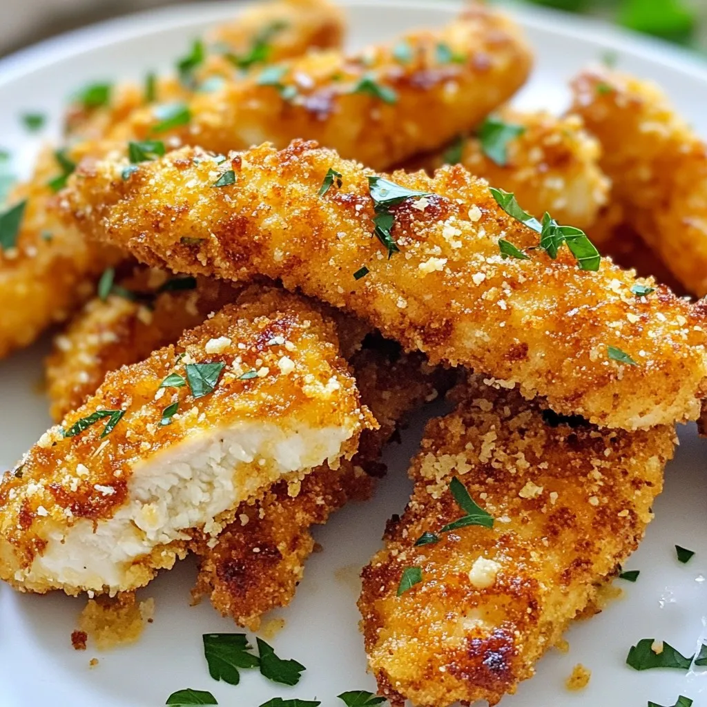 To make Air Fryer Garlic Parmesan Chicken Tenders, gather these ingredients: - Chicken breast and preparation - 1 lb chicken breast, cut into strips - Breadcrumbs and cheese - 1 cup breadcrumbs (panko preferred) - 1/2 cup grated Parmesan cheese - Seasoning ingredients - 1 teaspoon garlic powder - 1 teaspoon onion powder - 1 teaspoon Italian seasoning - 1/2 teaspoon black pepper - 1/2 teaspoon salt - Additional items for garnishing - 2 large eggs - 2 tablespoons olive oil - Fresh parsley, chopped (for garnish) Each ingredient plays a key role in making the tenders flavorful and crispy. The chicken breast provides a lean protein base. Panko breadcrumbs give a light and crunchy coating. Parmesan cheese enhances the savory taste. The seasonings add depth and warmth. Olive oil helps the coating crisp up in the air fryer. Finally, fresh parsley adds a pop of color and freshness when serving. {{ingredient_image_1}} First, cut 1 pound of chicken breast into strips. Try to make them even. This helps them cook well. Next, preheat your air fryer to 400°F (200°C). This takes about 5 minutes. Preheating makes the chicken tenders crispy. In a shallow bowl, whisk together 2 large eggs and 2 tablespoons of olive oil. Mix until smooth. Then, take another bowl and combine 1 cup of breadcrumbs, 1/2 cup of grated Parmesan cheese, 1 teaspoon of garlic powder, 1 teaspoon of onion powder, 1 teaspoon of Italian seasoning, 1/2 teaspoon of black pepper, and 1/2 teaspoon of salt. Stir until all the ingredients blend well. Now, dip each chicken strip into the egg mixture. Let the extra egg drip off. Then, coat it in the breadcrumb mix. Press gently to help it stick. Place the coated chicken tenders in a single layer in the air fryer basket. Make sure they do not touch. Cook in the air fryer for 10 to 12 minutes. Flip them halfway through. They are done when they are golden brown. The internal temperature should be 165°F (74°C). Once cooked, take them out and let them rest for a few minutes. Garnish with chopped fresh parsley before serving. Enjoy your tasty chicken tenders! To get the crispiest tenders, here are some great tips: - Avoid soggy tenders: Make sure to pat the chicken dry before you coat it. Excess moisture can make the coating soggy. Also, don't skip the egg wash step; it helps the breadcrumbs stick better. - Ensuring even cooking: Arrange the chicken strips in a single layer in the air fryer. If they overlap, they won't cook evenly. Flip them halfway through cooking for a golden brown finish. You can make these tenders your own! - Adjusting spice levels: If you like heat, add some cayenne pepper or paprika to the breadcrumb mix. For a milder flavor, skip the spices or use less garlic powder. - Alternative coating options: Try using crushed cornflakes instead of breadcrumbs for a crunchier texture. You can also use almond flour for a low-carb alternative. Pair your chicken tenders with tasty sides! - Perfect pairings and sides: Serve these tenders with a fresh salad or warm garlic bread. Sweet potato fries also make a great side. - Dipping sauce ideas: Ranch dressing and honey mustard are classic choices. For a twist, try a spicy sriracha mayo or a tangy yogurt dip. Pro Tips Tip Title: Use Panko Breadcrumbs: Panko breadcrumbs create a lighter, crispier texture compared to traditional breadcrumbs, giving your chicken tenders an irresistible crunch. Tip Title: Double-Dip for Extra Crunch: For an even crunchier coating, dip the chicken strips in the egg mixture, coat them in breadcrumbs, and then dip them in the egg mixture again before the final breadcrumb coating. Tip Title: Preheat the Air Fryer: Always preheat your air fryer for optimal cooking results. This ensures even cooking and helps achieve that golden-brown finish. Tip Title: Check Internal Temperature: Use a meat thermometer to ensure that the chicken tenders reach an internal temperature of 165°F (74°C) for safe consumption. {{image_2}} You can make these chicken tenders gluten-free. Use gluten-free breadcrumbs instead of regular ones. You can find these at many stores or make your own. If you make your own, crush gluten-free crackers or oats into fine crumbs. Keep the cooking time the same, around 10-12 minutes. Check that they are golden brown and cooked through. Want to mix things up? Try using different cheeses. Mozzarella gives a creamy taste, while cheddar adds sharpness. You can also add herbs and spices to change the flavor. Consider using smoked paprika for a smoky touch or crushed red pepper for a bit of heat. Fresh herbs like thyme or rosemary can add a fresh twist too. If you don't have an air fryer, no worries! You can bake these tenders in the oven. Preheat your oven to 425°F (220°C). Place the coated chicken strips on a baking sheet lined with parchment paper. Bake for 15-20 minutes, flipping halfway through. For pan-frying, heat oil in a skillet over medium heat. Fry the chicken strips for about 4-5 minutes on each side. Aim for that nice golden brown color! Store leftover chicken tenders in a container with a tight lid. This keeps them fresh. Let the tenders cool to room temperature first. Then, place them in the fridge for up to three days. Use glass or plastic containers for best results. If you need to stack them, place parchment paper between layers. When it’s time to enjoy your leftovers, reheating is key. The best method is to use the air fryer again. Set it to 350°F (175°C) and heat for about 5-7 minutes. This keeps them crispy. If you don’t have an air fryer, use an oven. Preheat it to the same temperature and bake for 10-15 minutes. To keep your chicken tenders crispy, don’t cover them while reheating. This helps the air circulate. You can also spritz a little olive oil on them for extra crunch. If you want to freeze your chicken tenders, here’s how. First, let them cool completely. Then, lay them flat on a baking sheet. Freeze them for about 1-2 hours until solid. After they freeze, transfer them t