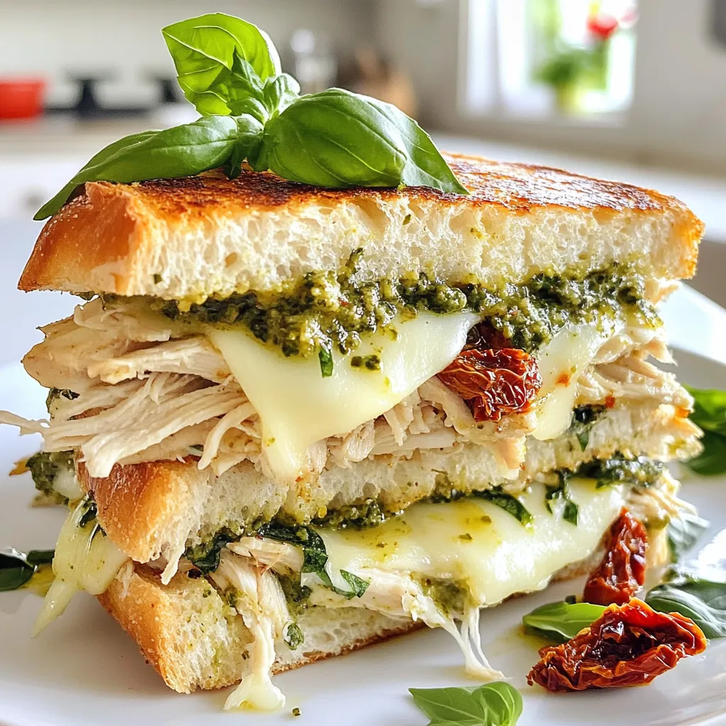 These main ingredients come together to create a tasty sandwich melt. I love using cooked chicken because it is quick and easy. Shredding the chicken helps it mix well with the pesto and other flavors. The basil pesto gives the dish a fresh and vibrant taste. Mozzarella cheese adds a creamy texture and melts beautifully. Sun-dried tomatoes provide a sweet and tangy kick. I pick sourdough bread for its crusty texture, which holds up well against the filling. Olive oil adds a rich flavor and helps the bread crisp up when cooking.