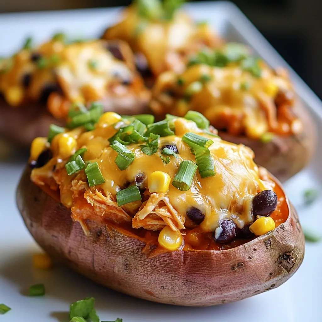 For BBQ Chicken Stuffed Sweet Potatoes, gather these tasty items: - 4 medium sweet potatoes - 2 cups shredded cooked chicken - 1/2 cup barbecue sauce - 1/2 cup corn - 1/2 cup black beans - 1/2 cup shredded cheddar cheese - 1/4 cup chopped green onions - 1 tablespoon olive oil - Salt and pepper to taste - Optional toppings: sour cream, avocado, jalapeños These ingredients work together to create a delicious meal. The sweet potatoes add natural sweetness and fiber. Shredded chicken brings protein, while barbecue sauce adds flavor and tang. Corn and black beans give texture and color. Cheddar cheese melts on top, making everything creamy and rich. When you pick ingredients, choose fresh and high-quality items. This choice makes a big difference in taste. If you have leftover chicken, use it! It saves time and adds flavor. You can also customize your toppings. Add jalapeños for spice, or sour cream for creaminess. Each ingredient plays a role in making this dish tasty and healthy. {{ingredient_image_1}} 1. Preheat your oven to 400°F (200°C). This makes sure the sweet potatoes cook evenly. 2. Wash the sweet potatoes well. Use a fork to poke holes in each potato. This allows steam to escape while baking. 3. Place the potatoes on a baking sheet lined with parchment paper. Bake for 45-60 minutes. They are done when a fork easily pierces them. 1. In a medium bowl, combine 2 cups of shredded cooked chicken, 1/2 cup of barbecue sauce, 1/2 cup of corn, and 1/2 cup of black beans. 2. Add 1/4 cup of chopped green onions to the mix. 3. Stir everything well. Make sure all the ingredients are coated in the sauce. Add salt and pepper to taste for extra flavor. 1. Once the sweet potatoes cool a bit, slice each in half lengthwise. 2. Carefully scoop out some flesh, leaving about 1/4 inch intact. This creates space for your filling. 3. Fill each potato half with the BBQ chicken mixture. Press down gently to pack it in. 4. Sprinkle 1/2 cup of shredded cheddar cheese on top of each filled potato. 5. Return the stuffed potatoes to the oven. Bake for another 10-15 minutes, until the cheese melts and bubbles. Enjoy making this tasty dish! Choosing the right sweet potatoes Select medium-sized sweet potatoes. They should feel firm and smooth. Look for ones with even skin and no bruises. The sweeter the potato, the better the dish will taste. If you find organic ones, grab them for added flavor. Tips for shredding chicken Use leftover chicken or rotisserie chicken for ease. Let the chicken cool before shredding. Two forks work great for this task. Simply pull the chicken apart into bite-sized pieces. Shredded chicken mixes well with the BBQ sauce. Store-bought brands vs homemade Store-bought BBQ sauces save time. They come in various flavors, like smoky or spicy. Homemade sauce allows you to control the taste. Try mixing ketchup, brown sugar, and vinegar for a quick homemade version. Flavor profiles to consider Think about the sweetness or heat you want. A sweet sauce complements the sweet potato. If you like heat, go for a spicy BBQ sauce. Mix and match to find your favorite combination. Pairing with side dishes Serve your stuffed sweet potatoes with a fresh salad. Coleslaw or corn on the cob also works well. These sides add crunch and balance to the meal. Presentation tips for serving Place each stuffed potato on a colorful plate. Garnish with chopped green onions and a dollop of sour cream. A slice of avocado can add creaminess and color. Make your dish look as good as it tastes! Pro Tips Choose the Right Sweet Potatoes: Look for firm, unblemished sweet potatoes for the best flavor and texture. Customize Your Filling: Feel free to add other ingredients like diced bell peppers or jalapeños for extra flavor and spice. Make Ahead: Prep the sweet potatoes and filling in advance, then assemble and bake when ready to serve. Garnish for Extra Flavor: Don’t skip the optional toppings like avocado or sour cream to enhance the dish’s creaminess and taste. {{image_2}} You can make BBQ chicken stuffed sweet potatoes vegetarian. Replace the chicken with cooked quinoa or lentils. These choices add protein and flavor. You can also mix in some diced mushrooms or bell peppers. They add great texture and taste. If you love heat, add jalapeños to your filling. Chop them up and mix them with the BBQ chicken. You can also use a spicy barbecue sauce. This gives your dish a nice kick. Don't be shy to experiment with different spice levels. For gluten-free options, ensure your barbecue sauce is gluten-free. Most sauces are, but it’s good to check. You can also use gluten-free toppings like avocado or sour cream. If you need dairy-free choices, try using dairy-free cheese. It melts well and keeps the dish tasty. To keep your BBQ chicken stuffed sweet potatoes fresh, store them in the fridge. Use airtight containers to prevent moisture loss. Glass or plastic containers work well. If you have extra toppings, store them separately. This keeps things crisp and tasty. You can reheat your stuffed sweet potatoes in two ways: the microwave or the oven. - Microwave: Place the potato on a microwave-safe plate. Heat for 1-2 minutes. Check if it’s warm. If not, heat for another minute. - Oven: Preheat your oven to 350°F (175°C). Wrap the sweet potato in foil. Bake for about 10-15 minutes. This method keeps the texture nice. To maintain the best texture, avoid microwaving for too long. It can make the potatoes soggy. Freezing stuffed sweet potatoes is easy. Let them cool completely. Wrap each potato in plastic wrap, then place them in a freezer bag. Remove as much air as possible. - Thawing and Reheating Tips: When ready to eat, take the potato out of the freezer. Thaw it in the fridge overnight. For reheating, use the oven method mentioned above. This helps keep them tasty and warm. Bake sweet potatoes for 45-60 minutes at 400°F (200°C). Check them after 45 minutes. To test, poke a fork into the thickest part. If it's soft, they ar
