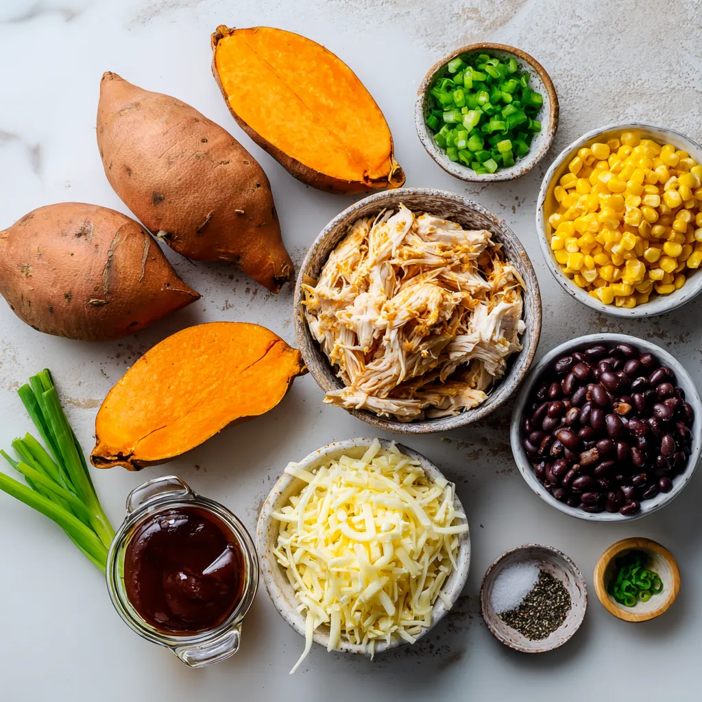 These ingredients work together to create a delicious meal. The sweet potatoes add natural sweetness and fiber. Shredded chicken brings protein, while barbecue sauce adds flavor and tang. Corn and black beans give texture and color. Cheddar cheese melts on top, making everything creamy and rich.