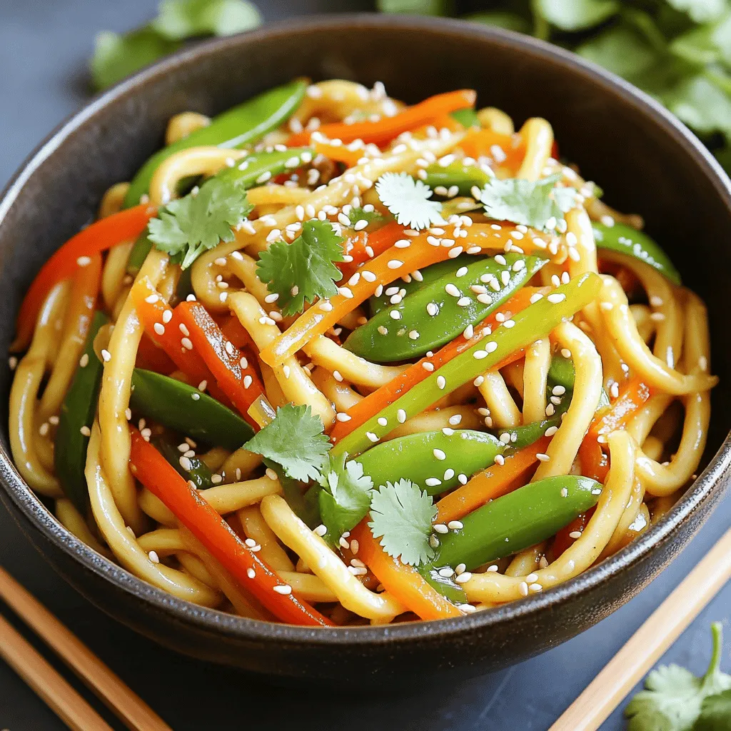 To make my Better-Than-Takeout Garlic Soy Udon Stir-Fry, you need some simple, fresh ingredients. Each one adds flavor and texture to the dish. Here’s what you will need: - Udon Noodles: 200g of thick, chewy udon noodles make the base. - Vegetables: Use colorful veggies like 1 bell pepper (red or yellow), 1 cup snap peas, and 1 medium carrot. These add crunch and color. - Aromatics: For bold flavor, include 4 cloves of minced garlic and 1 inch of grated ginger. - Sauces and Oils: You will need 3 tablespoons of soy sauce, 1 tablespoon of sesame oil, and 1 tablespoon of rice vinegar. If you like heat, add 1 teaspoon of chili paste. - Garnishes: Top your stir-fry with sesame seeds and fresh cilantro for added flavor and a pop of color. These ingredients come together to create a tasty, satisfying meal. You can easily find them at your local grocery store or farmer's market. First, boil water in a large pot. Add the udon noodles to the boiling water. Cook them for about 8-10 minutes, or until soft. Drain the noodles using a colander. Rinse them with cold water. This stops the cooking and keeps them from sticking. Set the noodles aside for later. Next, grab a large skillet or wok. Heat 2 tablespoons of vegetable oil over medium-high heat. Once hot, add 4 cloves of minced garlic and 1 inch of grated ginger. Stir these for about 30 seconds. You want them to smell great but not burn. Now, it’s time for the veggies. Toss in 1 bell pepper, 1 cup of snap peas, and 1 medium carrot, all cut into thin pieces. Stir-fry these for about 3-4 minutes. The goal is to keep them tender-crisp. You want bright colors and a bit of crunch. Add the cooked udon noodles to the skillet with the vegetables. Gently mix everything together. Now, pour in 3 tablespoons of soy sauce, 1 tablespoon of sesame oil, and 1 tablespoon of rice vinegar. If you like it spicy, add 1 teaspoon of chili paste. Toss everything for another 2-3 minutes. Make sure the noodles soak up all the tasty flavors. Once everything is well mixed, take the skillet off the heat. Stir in 3 chopped green onions for a fresh crunch. Transfer the stir-fry to a serving plate. For the final touch, sprinkle sesame seeds and fresh cilantro on top. This adds a beautiful look and extra flavor. Enjoy your homemade Better-Than-Takeout Garlic Soy Udon Stir-Fry! To get the best udon noodles, cook them just right. Boil the noodles for about 3-4 minutes. Drain them well and rinse with cold water. This keeps them from sticking together. If you want a firmer bite, cook them a minute less. To boost flavors, use fresh ingredients. The garlic and ginger should be minced and grated finely. This helps release their natural oils. Add soy sauce gradually. Taste as you go. For a hint of heat, include chili paste. You can also try adding a splash of lime juice for brightness. Serve your garlic soy udon in a deep bowl. This makes it look inviting. Top with sesame seeds and fresh cilantro for color. Add extra green onions for a fresh crunch. If you want, use chopsticks for a fun touch. This adds to the experience and makes the meal special. {{image_2}} You can easily boost your garlic soy udon stir-fry with protein. Tofu works great. Choose firm tofu and cut it into cubes. Sauté it in the oil until golden. Chicken is another tasty option. Use thin strips of chicken breast. Cook it first, then add vegetables. You can also use shrimp. Just toss them in for a quick cook. Each protein adds its own flavor. Feel free to swap out vegetables based on what you have. Broccoli florets are a great choice. They add crunch and color. Zucchini slices are another fun option. They cook fast and soak up flavors well. Mushrooms can add an earthy taste. Just slice them and toss them in. Remember, the goal is to use what you love. Do you like heat? Adjust the spice levels to match your taste. Add more chili paste for a kick. You can also use fresh chili peppers. Just slice them thin and mix in. If you want it mild, skip the chili altogether. You can also balance heat with a bit of sugar. It will make the flavors pop without making it too spicy. To keep your garlic soy udon stir-fry fresh, store it in an airtight container. This method prevents moisture loss and keeps flavors intact. Refrigerate within two hours after cooking. Your dish will last for 3 to 4 days in the fridge. Make sure to let it cool down before sealing. If you want to save some for later, freezing is a great option. Allow the stir-fry to cool completely before putting it in freezer-safe bags or containers. Make sure to remove as much air as possible to prevent freezer burn. It can last up to 2 months in the freezer. For best results, label the bags with the date. When you’re ready to enjoy your stir-fry, there are easy ways to reheat it. You can use a microwave. Place it in a microwave-safe dish and cover it. Heat in short intervals, stirring in between to get even warmth. You can also reheat on the stove. Add a splash of water or soy sauce to help keep it moist. Heat over medium-low until warmed through. This helps the flavors return to life! To store leftover udon stir-fry, place it in an airtight container. Keep it in the fridge. It stays fresh for about 3 to 4 days. When you are ready to eat, just reheat it in a pan or microwave. If you want to keep it for longer, you can freeze it. Thaw it in the fridge before reheating. Yes, you can use other noodles. Rice noodles, soba noodles, or even spaghetti work well. Just cook them according to the package instructions. Make sure to adjust the cooking time based on the noodle type. Each noodle will add a unique taste and texture to your stir-fry. To make this dish vegetarian or vegan, swap the soy sauce for a vegan brand. Use vegetable oil and check all ingredients for animal products. You can also add tofu or tempeh for protein. This adds a nice texture and makes the dish more filling. Garlic soy udon stir-fry pairs well with many dishes. You can serve it with edamame or a side sa