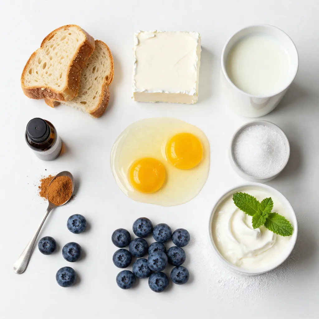 For the Blueberry Cheesecake French Toast Casserole, gather these ingredients: