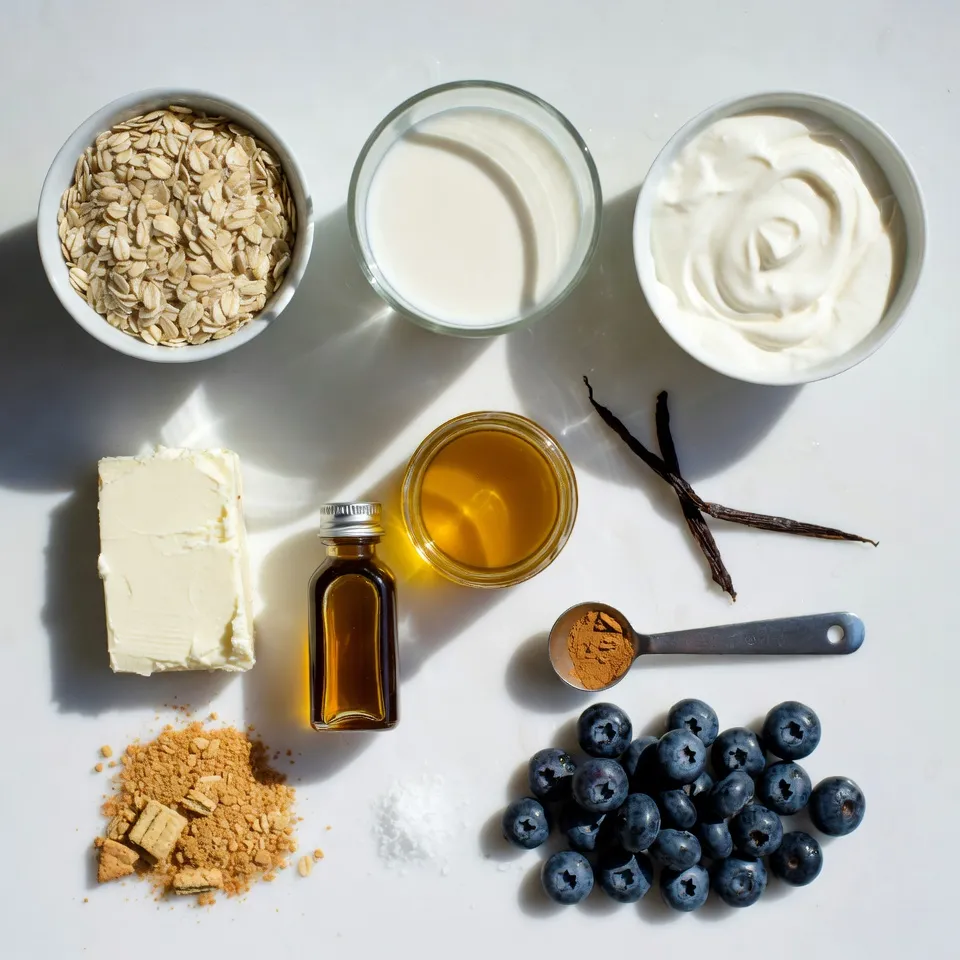 These main ingredients create a creamy, sweet, and fruity base for your overnight oats. The rolled oats soak up the milk, getting soft and fluffy. Greek yogurt and cream cheese add that rich cheesecake taste. Blueberries give a burst of freshness in each bite.