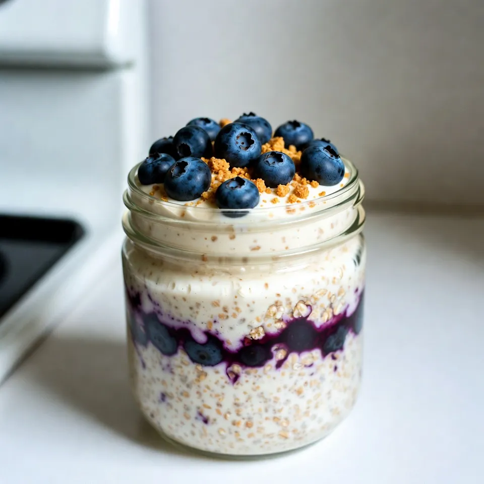 - 1 cup rolled oats - 1 cup milk (or dairy-free alternative) - 1/2 cup Greek yogurt - 1/4 cup cream cheese, softened - 2 tablespoons maple syrup (adjust to taste) - 1 teaspoon vanilla extract - 1/2 teaspoon cinnamon - 1/2 cup fresh blueberries (plus extra for topping) - 2 tablespoons crushed graham crackers (for the cheesecake flavor) - Pinch of salt These main ingredients create a creamy, sweet, and fruity base for your overnight oats. The rolled oats soak up the milk, getting soft and fluffy. Greek yogurt and cream cheese add that rich cheesecake taste. Blueberries give a burst of freshness in each bite. - Extra fresh blueberries for topping - More crushed graham crackers for garnish - Nuts or seeds for added crunch You can customize your oats with these optional ingredients. Topping them with blueberries adds color and flavor. Crushed graham crackers on top enhance the cheesecake vibe. Nuts or seeds can provide a nice crunch and boost nutrition. - Use almond milk or oat milk instead of dairy milk. - Swap Greek yogurt for any plain yogurt. - Try mascarpone cheese if you want a richer flavor. - Replace maple syrup with honey or agave syrup. These substitutions can help you fit your taste or dietary needs. Each swap will still give you a tasty dish. Feel free to experiment with these options to find your perfect mix! {{ingredient_image_1}} First, grab a mixing bowl. Add 1 cup of rolled oats, 1 cup of milk, and a pinch of salt. Stir well. You want the oats fully submerged in the milk. In a different bowl, beat together 1/4 cup of softened cream cheese and 1/2 cup of Greek yogurt. Mix until smooth and creamy. Next, add 2 tablespoons of maple syrup, 1 teaspoon of vanilla extract, and 1/2 teaspoon of cinnamon to the cream cheese mix. Stir well until combined. Finally, gently fold in 1/2 cup of fresh blueberries and 2 tablespoons of crushed graham crackers. Be careful to keep the blueberries whole. Now it’s time to layer the oats and cheesecake mixture. Take a jar or any container you like. Start with a layer of the oat mixture at the bottom. Then add a layer of the cream cheese mix. Repeat these layers until all the ingredients are gone. Finish with the cheesecake layer on top. This way, you get a beautiful look when you dig in. Cover the jar with a lid. Place it in the fridge overnight, or for at least 4 hours. This helps the oats soak in the milk and blend flavors. When you wake up, the oats will be soft, and the taste will be amazing. In the morning, stir the oats a bit. Top with extra fresh blueberries and some crushed graham crackers if you like. Enjoy your tasty breakfast! To get a creamy texture, mix the cream cheese and Greek yogurt well. Beat them until smooth. It helps if the cream cheese is at room temperature. This prevents lumps. You want a silky mixture that blends nicely with the oats. Stir in the milk slowly. This adds moisture and keeps the oats creamy. You can adjust the sweetness to your taste. Start with two tablespoons of maple syrup. If you like it sweeter, add more syrup. You could also try honey or agave syrup. Taste the mixture before layering. This way, you make sure it’s just right for you. Store any leftovers in an airtight container. This keeps the oats fresh and tasty. Make sure to eat them within three days. Before eating, give it a good stir. You can add more milk if it seems thick. Enjoy it cold or warm it up in the microwave. Just heat it for about 30 seconds. Pro Tips Use Overnight Oats for Meal Prep: Prepare multiple jars of these overnight oats at once to have a quick and healthy breakfast option ready for the week. Adjust Sweetness to Your Preference: Feel free to modify the amount of maple syrup based on your taste. You can also use honey or agave syrup as alternatives. Experiment with Fruits: While blueberries are delicious, you can mix in other fruits like strawberries, raspberries, or bananas for a different flavor profile. Make It Vegan: Substitute Greek yogurt and cream cheese with dairy-free alternatives like coconut yogurt and cashew cream for a vegan version of this recipe. {{image_2}} You can change the fruit in your blueberry cheesecake overnight oats for fun. Try strawberries, raspberries, or peaches. Each fruit gives a new taste. If you want something tropical, add mango or pineapple. Mix different fruits for a rainbow of flavors. You can even use frozen fruit if fresh is not available. Want to switch it up? You can add cocoa powder for a chocolate twist. Just mix in one tablespoon with the cream cheese. For a nutty flavor, add almond or peanut butter. A dash of lemon zest can brighten the taste, too. You can also try spices like nutmeg or ginger for a warm kick. If you prefer a vegan or dairy-free version, swap the milk for almond or coconut milk. Use dairy-free yogurt and cream cheese for the creamy base. Maple syrup is a great sweetener, and you can keep it! This way, you still enjoy the cheesecake flavor without dairy. I recommend using glass jars or airtight containers for your Blueberry Cheesecake Overnight Oats. They keep the oats fresh. The jars also make serving easy. Look for containers that have tight-fitting lids. This will prevent the oats from absorbing unwanted smells. These oats last up to four days in the fridge. The flavors actually improve over time. Just make sure to keep them sealed. Before eating, give them a good stir. Add more milk if they seem a bit thick. You can freeze Blueberry Cheesecake Overnight Oats, but it's best to eat them fresh. If you must freeze, use freezer-safe containers. They can last up to three months in the freezer. Allow them to thaw in the fridge overnight before eating. The texture may change slightly, but they will still taste great. Yes, you can use quick oats. Quick oats absorb liquid faster than rolled oats. This may change the texture slightly. Your oats will be creamier but less chewy. If you choose quick oats, check the soaking time. They may need less time in the fridge. You can sto