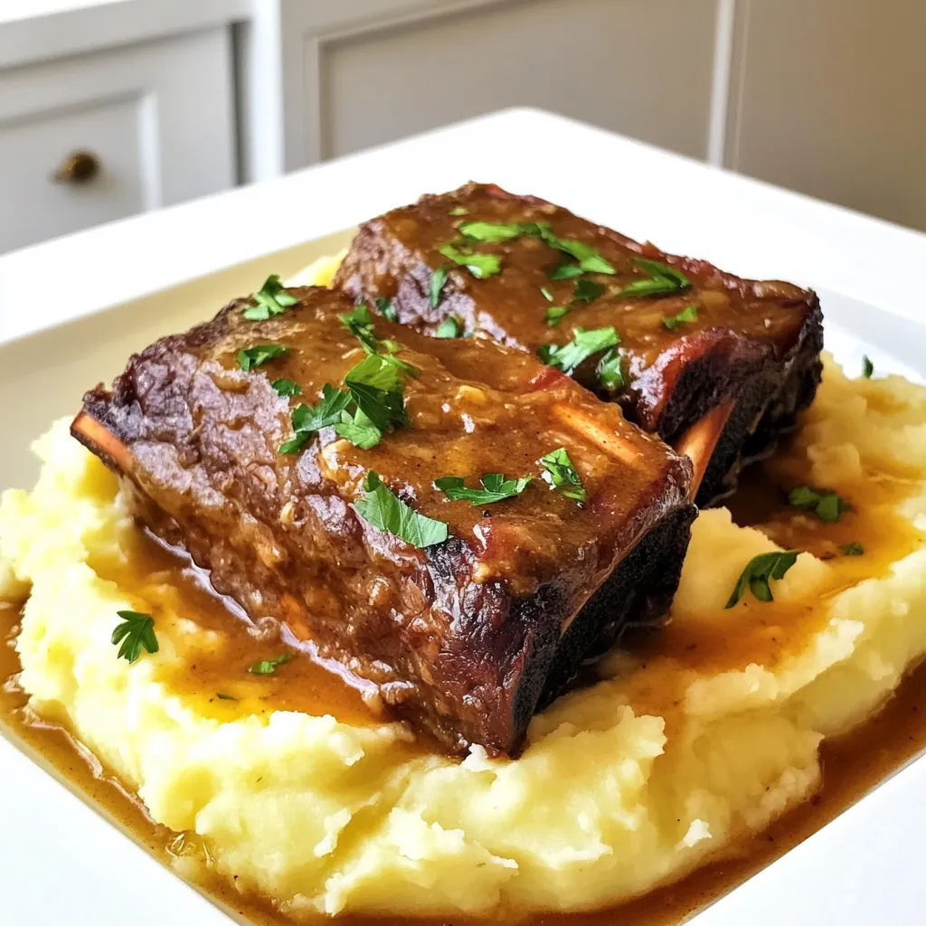 - 3 pounds beef short ribs - 2 tablespoons olive oil - 1 large onion, chopped - 4 cloves garlic, minced (plus more for mashing) - 2 carrots, diced - 2 celery stalks, diced - 2 cups beef broth The beef short ribs are the star of this dish. They soak up flavors and become tender. I use olive oil to sear them, giving a rich crust. Then, onions, garlic, carrots, and celery add depth. These veggies build a great base for the sauce. - 2 pounds potatoes, peeled and chopped - ½ cup milk - 4 tablespoons butter - Fresh parsley, chopped (for garnish) For the garlic mash, I choose creamy potatoes. They pair perfectly with the short ribs. The milk and butter make them smooth and rich. I also add minced garlic for a kick. A sprinkle of fresh parsley brightens the plate. - 1 teaspoon dried thyme - 1 teaspoon smoked paprika - Salt and pepper to taste The spices bring the dish to life. Dried thyme adds an earthy note. Smoked paprika gives a subtle warmth. Salt and pepper enhance all the flavors. I always taste and adjust to get it just right. This careful layering makes every bite memorable. Searing the ribs Start by heating olive oil in a large skillet over medium-high heat. Season the short ribs with salt and pepper. Sear each rib for about 3 to 4 minutes on all sides until they turn brown. This step locks in the flavor and adds a nice crust. Once done, transfer the ribs to the slow cooker. Seasoning tips For extra flavor, consider adding a pinch of smoked paprika or thyme to your seasoning mix. This will enhance the taste of the meat and create a rich aroma. Combining flavors In the same skillet, add chopped onion, minced garlic, diced carrots, and diced celery. Sauté these for about 5 to 7 minutes until the onions become translucent. This step builds a flavorful base for the dish. Once ready, add the sautéed vegetables to the slow cooker with the ribs. Timing for optimal results Timing is key. Make sure to sauté until the vegetables soften but don't let them brown too much. This keeps the flavors bright and fresh. Setting up the slow cooker Now, pour beef broth over the short ribs and vegetables in the slow cooker. Sprinkle in the dried thyme and smoked paprika. Stir gently to combine all the ingredients. Cooking time options (low/high) You can set the slow cooker to low for about 8 hours or high for 4 to 5 hours. The meat should be tender and fall apart easily. Choose the setting that best fits your schedule. Boiling and draining the potatoes About 30 minutes before the ribs finish cooking, boil the peeled and chopped potatoes in salted water. Cook until they are fork-tender, which takes about 15 to 20 minutes. Drain them well before mashing. Adding garlic, milk, and butter In the pot with the drained potatoes, add minced garlic, milk, and butter. Mash everything together until creamy and smooth. Season with salt and pepper to taste. The garlic adds a lovely flavor that pairs perfectly with the ribs. Serving tips for plating Once the ribs are cooked, serve them over a generous scoop of garlic mash. Spoon some of the rich braising liquid from the slow cooker over the top for added flavor and moisture. Garnishing with parsley Finish by sprinkling fresh parsley on top for a pop of color and freshness. This not only looks great but also adds a hint of herbaceous flavor to the dish. Slow cooking is key for tender short ribs. Cooking low and slow breaks down the meat. This method turns tough cuts into melt-in-your-mouth goodness. Season the ribs well with salt and pepper before searing. This step adds flavor and enhances the crust. For extra depth, sprinkle on smoked paprika and thyme. Both spices boost the braising liquid. For creamy garlic mash, use starchy potatoes, like Russets. They create a fluffy texture. You can also add sour cream for extra richness. If you love garlic, roast some cloves first. Roasted garlic gives a sweet, mellow flavor. Adjust the amount of garlic based on your taste. Start with four cloves, and add more if you like. A good slow cooker makes this recipe easy. Look for one with a programmable timer. This feature helps avoid overcooking. For mashing, use a potato masher or a ricer. A ricer gives you a smoother mash. Don’t forget a sharp knife for chopping vegetables. Keeping your tools in good shape makes cooking more fun. {{image_2}} You can change the flavor by using different cuts of meat. Try chuck roast or brisket for a rich taste. If you want to go lighter, chicken thighs also work well. They might need less time, so keep an eye on them. For the mash, swap potatoes with cauliflower or sweet potatoes. Both give a new twist to the classic dish. Cauliflower makes a lighter, low-carb option. Sweet potatoes add a sweet flavor and bright color. Add fresh herbs for more flavor. Rosemary and oregano can enhance the dish. You might also enjoy a kick from chili flakes. They add heat without overpowering the dish. Using wine or beer in the braising liquid adds depth. Red wine pairs nicely with beef. If you prefer beer, a stout or porter can give a rich, malty taste. Just remember, the alcohol cooks off, leaving behind great flavor. Stove-top braising can be a quick option. Sear the ribs in a heavy pot, then add the broth and spices. Cover and let it simmer for about 2 to 3 hours. Check often to ensure nothing burns. You can also braise in the oven. After searing, place everything in a Dutch oven. Cover and cook at 325°F for about 2.5 to 3 hours. This method gives a nice, even heat. To keep your braised short ribs fresh, store them in the fridge. Place the ribs and sauce in an airtight container. Make sure to cool them first. They will last for about 3 to 4 days. For best results, use glass or plastic containers with tight lids. When you're ready to enjoy leftovers, there are two great ways to reheat them. - Microwave Reheating: Place the ribs in a microwave-safe dish. Cover it with a damp paper towel. Heat on medium for 1-2 minutes. Check and stir halfway. - Stovetop Reheating: