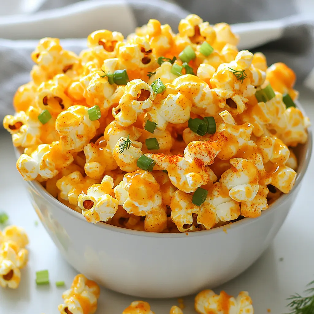 - 1/2 cup popcorn kernels - 2 tablespoons vegetable oil - 1 teaspoon garlic powder - 1 teaspoon onion powder - 1 teaspoon dried dill - 1 teaspoon smoked paprika - 1 teaspoon ranch seasoning mix - 1/4 cup buffalo sauce - 2 tablespoons melted butter - Salt to taste - Optional: chopped green onions for garnish To make Buffalo Ranch Popcorn, gather these simple ingredients. First, you need popcorn kernels. This is the base of your snack. Next, vegetable oil helps the kernels pop. Garlic and onion powders add great flavor. Dried dill and smoked paprika bring unique tastes to the mix. Ranch seasoning mix gives that classic ranch flavor. Buffalo sauce is key for the heat and tang. Don’t forget melted butter; it helps the spices stick. Lastly, add salt to taste. You can even use chopped green onions for a fresh touch. Having these ingredients ready makes cooking easy and fun. This snack is great for movie nights or parties. You can adjust the spice to fit your taste. Try it out, and enjoy every crunchy bite! {{ingredient_image_1}} 1. Heat 2 tablespoons of vegetable oil in a large pot over medium-high heat. 2. Add 1/2 cup of popcorn kernels to the hot oil. 3. Cover the pot, leaving it slightly open. This lets steam escape. 4. Shake the pot every few seconds. This helps prevent burning. 5. Listen carefully. When the popping slows to about 2 seconds between pops, remove it from heat. 1. In a small bowl, mix together: - 1 teaspoon garlic powder - 1 teaspoon onion powder - 1 teaspoon dried dill - 1 teaspoon smoked paprika - 1 teaspoon ranch seasoning mix - Salt to taste 2. Stir well to combine all the spices evenly. 1. In another small bowl, combine: - 2 tablespoons melted butter - 1/4 cup buffalo sauce 2. Mix until the butter and sauce blend smoothly. 1. Once the popcorn is done, transfer it to a large mixing bowl. 2. Drizzle the buffalo sauce mixture over the popcorn. 3. Sprinkle the seasoning mix over the popcorn too. 4. Gently toss everything together. This helps coat each piece evenly. 1. For a fun snack, serve the popcorn in colorful paper cones or a big popcorn bucket. 2. You can also put small bowls of extra buffalo sauce on the side for dipping. 3. If you like, garnish with chopped green onions for a fresh touch. To make your Buffalo Ranch Popcorn even tastier, you can add more spices. Try adding cayenne pepper for heat. A pinch of smoked salt gives a nice touch too. You can also switch ranch seasoning for a taco mix for a new twist. Adjust the spice levels to fit your taste. If you love heat, try more buffalo sauce. For a milder flavor, use less. Remember, you can always start small and add more as you mix. For great popcorn, you have two main methods: stovetop and microwave. On the stovetop, heat the oil and add kernels. Cover the pot but leave a small crack for steam. Shake the pot to keep the kernels moving. This way, they pop evenly. If you prefer the microwave, use a microwave-safe bowl with a vented lid. Add kernels and cook them according to the package instructions. Just watch closely, so you don't burn them. To lighten up your Buffalo Ranch Popcorn, consider a few swaps. Use air-popped popcorn instead of oil-popped. You can skip the butter or use olive oil for a healthier fat. For a lower-calorie sauce, try a yogurt-based ranch mix mixed with buffalo sauce. These changes keep the flavor while cutting some calories. You still enjoy a tasty snack, but feel better about it! Pro Tips Fresh Kernels: Always use fresh popcorn kernels for the best popping results. Old kernels may not pop well and can lead to a disappointing batch. Customize Your Spice: Feel free to adjust the amount of buffalo sauce and seasoning mix based on your personal heat preference. Start with less and add more if needed! Garnish for Color: Add chopped green onions or even crumbled blue cheese on top for added flavor and a pop of color to your popcorn. Storage Tips: If you have leftovers, store the popcorn in an airtight container to keep it fresh and crunchy. Avoid moisture, which can make it soggy. {{image_2}} To make your popcorn spicier, add more hot sauce. You can also sprinkle in cayenne pepper or chili powder. These extra spices give your popcorn a bold kick. Just mix them in with the seasoning before tossing. Taste as you go to find your perfect heat level. For a cheesy twist, use cheese seasoning or cheese powder. You can find these in most grocery stores. Just add about two tablespoons to the seasoning mix. The cheese will melt into the warm popcorn and create a savory flavor. This combo of cheese and buffalo sauce is a crowd-pleaser. If you want a sweet flavor, try adding caramel or honey. Drizzle a little over the popcorn after tossing it with buffalo sauce. The sweetness balances out the heat nicely. You can choose how much you like based on your taste. This fun twist makes your snack even more exciting! To keep your Buffalo Ranch Popcorn fresh, use an airtight container. This helps keep moisture out. I recommend glass jars or plastic containers with tight lids. You can also use resealable bags. Just make sure to squeeze as much air out as you can. Store it in a cool, dry place away from sunlight. When stored correctly, your popcorn can stay fresh for up to two weeks. If you notice it getting stale, it’s time to eat it! The flavors will fade, and the crunchiness will disappear. Always check for any signs of spoilage before enjoying your snack. If your popcorn loses its crunch, don’t worry. You can easily bring it back to life. Preheat your oven to 250°F (120°C). Spread the popcorn on a baking sheet in a single layer. Bake for about 5 to 10 minutes. Keep an eye on it to avoid burning. Let it cool before serving again. Enjoy that crispy goodness! Buffalo Ranch Popcorn is a spicy and flavorful snack. It combines the heat of buffalo sauce with the coolness of ranch dressing. This mix of tastes makes each bite exciting. The popcorn is crunchy and bursting with flavor. It is perfect for movie nights o