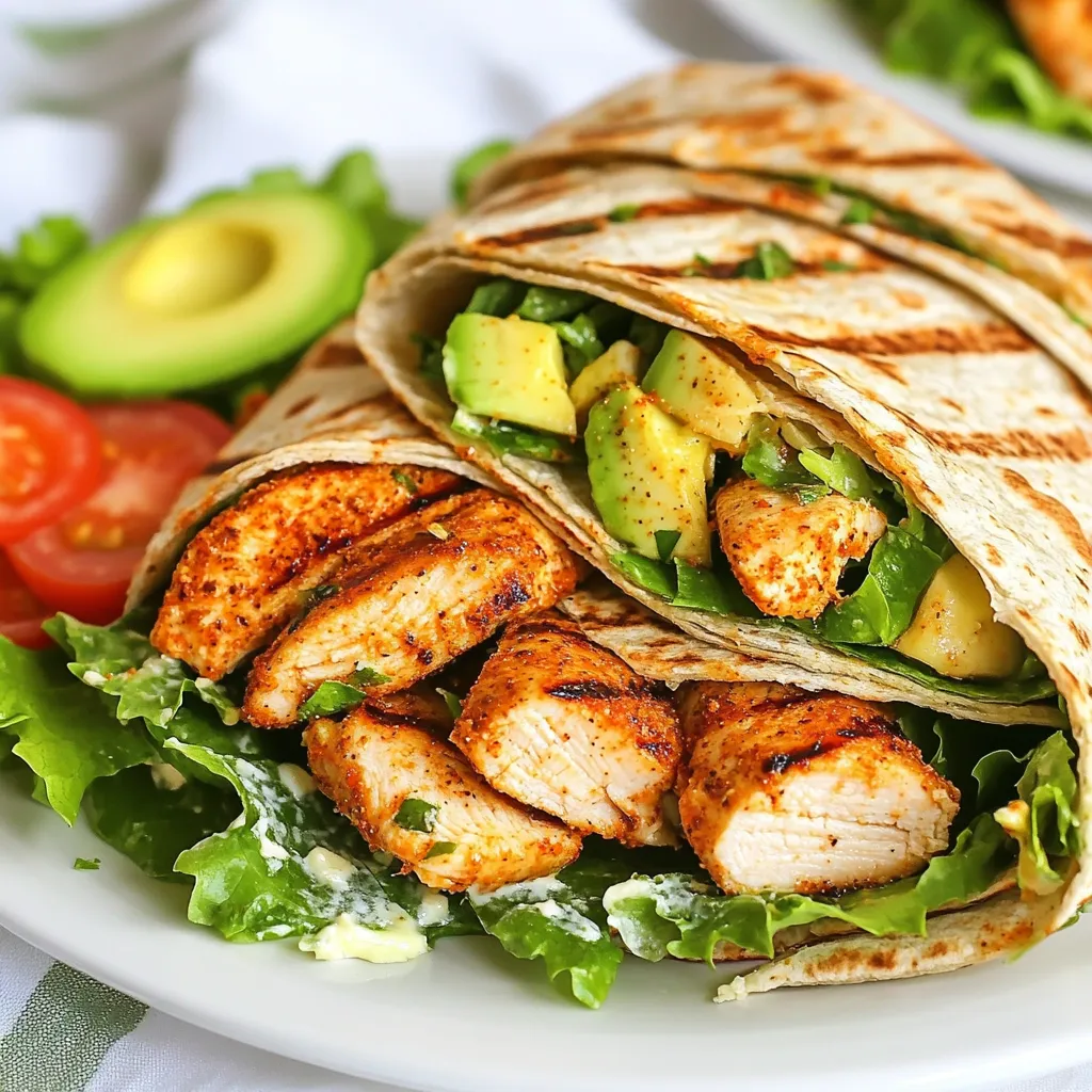 To make Cajun Chicken Caesar Wraps, you need: - 2 boneless, skinless chicken breasts - 2 tablespoons Cajun seasoning - 2 tablespoons olive oil - 4 large whole wheat tortillas - 1 cup romaine lettuce, chopped - 1/2 cup grated Parmesan cheese - 1/3 cup Caesar dressing - Salt and pepper to taste These main ingredients give your wraps great flavor and texture. The chicken brings protein, while the Cajun seasoning adds a spicy kick. Whole wheat tortillas offer a healthy base for your meal. You can add extra freshness with: - Sliced tomatoes - Sliced avocado Adding these ingredients boosts the flavor and makes the wraps more colorful. Tomatoes add a juicy bite, while avocados contribute creaminess. Feel free to mix and match based on your taste. If you have dietary needs, here are some swaps: - Use tofu or tempeh instead of chicken for a plant-based option. - Replace whole wheat tortillas with gluten-free wraps. - Choose dairy-free Caesar dressing to make it vegan. These substitutions help you enjoy Cajun Chicken Caesar Wraps while sticking to your diet. Just remember to adjust cooking times if you use different proteins. {{ingredient_image_1}} Start by preheating your grill or stovetop grill pan over medium-high heat. This step is key for a nice char. In a bowl, mix together the Cajun seasoning and olive oil. This mix will add flavor to your chicken. Coat the chicken breasts evenly with this marinade. Let them sit for about 15 minutes. This allows the flavors to soak in. Once the grill is hot, place the chicken on it. Cook for about 6-7 minutes on each side. Use a meat thermometer to check if it reaches 165°F. Once done, take the chicken off the grill and let it rest before slicing. This keeps the juices inside the meat. In a large bowl, combine the chopped romaine lettuce, sliced chicken, grated Parmesan cheese, and Caesar dressing. Toss everything gently until it's all coated. This mix is full of flavor! Now, grab your tortillas. Place a good amount of the chicken Caesar mix in the center of each tortilla. If you like, add slices of tomato and avocado for extra taste. Fold the sides of the tortilla inward. Then, roll it from one end to the other. Make sure the filling stays inside. Serve the wraps right away for the best taste. You can also wrap them in foil for lunch later. To make it look nice, slice each wrap in half diagonally. Arrange them on a platter, adding some extra lettuce and a sprinkle of Parmesan. This adds a pop of color and makes it appealing. Enjoy your tasty creation! To make your Cajun Chicken Caesar Wraps stand out, the marinade is key. Mix Cajun seasoning with olive oil. This blend helps the chicken soak up flavor. Let it marinate for at least 15 minutes. You can also marinate for a few hours. This adds depth to the taste. Feel free to experiment with the seasoning. Add garlic powder or paprika for a twist. Grilling chicken can be easy with the right steps. Preheat your grill to medium-high. This ensures even cooking and nice grill marks. Cook each chicken breast for 6-7 minutes on each side. Use a meat thermometer to check the internal temperature. It should reach 165°F (75°C). Let the chicken rest for a few minutes before slicing. This keeps it juicy and tender. Serving your wraps well makes them more appealing. Slice each wrap in half diagonally. Place them on a nice platter. Add extra lettuce and a sprinkle of Parmesan on top for a pop. You can also use colorful tomatoes and avocado for a fresh look. This makes your meal not just tasty but also beautiful. Pro Tips Marinate for Maximum Flavor: Allow the chicken to marinate for at least 15 minutes, or even up to 2 hours if time permits, to enhance the Cajun flavors. Grill to Perfection: Ensure your grill is adequately preheated to achieve those beautiful grill marks and to cook the chicken evenly. Freshness is Key: Add freshly sliced tomatoes and avocado just before serving to keep them crisp and vibrant. Wrap It Right: When rolling the wrap, ensure you fold in the sides first to keep all the delicious filling tucked securely inside. {{image_2}} You can easily make this wrap vegetarian. Instead of chicken, try grilled or roasted vegetables. Bell peppers, zucchini, and mushrooms work great. You can also use chickpeas for protein. Simply season them with Cajun spices before grilling. This gives a nice flavor and texture. If you love heat, add more spice! You can stir in some hot sauce into the Caesar dressing. Another option is to sprinkle crushed red pepper flakes on top. For a smoky flavor, try chipotle seasoning on the chicken. These small changes pack a big punch. For a gluten-free wrap, swap out the whole wheat tortillas. Look for gluten-free tortillas made from rice or corn. You can also serve the filling in a bowl if you prefer. This way, you enjoy all the flavors without the gluten! To store leftover wraps, first let them cool down. Place them in an airtight container. You can keep them in the fridge for up to three days. If you want to keep them longer, wrap them tightly in foil or plastic wrap. This way, they stay fresh and tasty. If you want to freeze your wraps, make sure they are fully cooled. Wrap each one in plastic wrap or foil. Then, place them in a freezer-safe bag. You can freeze them for up to three months. This is a great way to have a quick meal ready for later. To reheat your wraps, the oven works best. Preheat your oven to 350°F (175°C). Remove the wrap from the fridge or freezer and unwrap it. Place it on a baking sheet. Heat for about 10-15 minutes until warm. You can also use a microwave, but the oven keeps the wrap crispy. Enjoy your tasty meal! Cajun seasoning is a spice blend from Louisiana. It brings heat and depth to dishes. You can make your own mix at home. Combine paprika, cayenne, garlic powder, onion powder, oregano, thyme, and black pepper. Adjust the spices based on your taste. This way, you control the heat and flavor. Yes! You can use various lettuce types. Romaine is crisp 