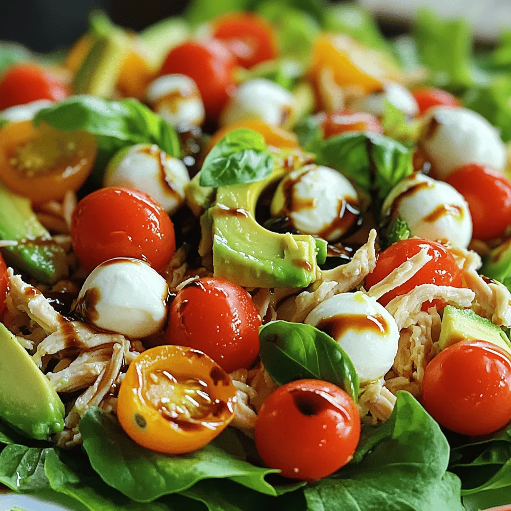 To make Caprese Avocado Chicken Salad, gather these fresh ingredients: - 2 cups cooked chicken breast, shredded - 1 ripe avocado, diced - 1 cup cherry tomatoes, halved - 1 cup fresh mozzarella balls, halved - 1/4 cup fresh basil leaves, torn - 2 tablespoons balsamic glaze - 2 tablespoons olive oil - Salt and pepper to taste - Optional: Mixed greens for serving For the best flavor, I recommend using these brands: - Chicken: Look for Perdue or Bell & Evans for high-quality chicken. - Avocado: Hass avocados from California are creamy and delicious. - Mozzarella: Try Galbani or BelGioioso for fresh mozzarella balls. - Balsamic Glaze: Use Colavita or Pompeian for rich and tasty glaze. - Olive Oil: Opt for extra virgin olive oil from California or Italy. This salad is not just tasty; it is also good for you. Here’s a quick look at the health benefits: - Chicken: High in protein, supports muscle growth and repair. - Avocado: Packed with healthy fats, good for heart health and skin. - Tomatoes: Full of vitamins and antioxidants, great for immunity. - Mozzarella: Provides calcium and protein, supports bone health. - Basil: Contains antioxidants, may help reduce inflammation. - Olive Oil: Rich in monounsaturated fats, can lower bad cholesterol. This salad combines flavors and nutrition for a perfect dish. It’s fresh and bright, great for any meal! Start with your cooked chicken. Shred it into bite-sized pieces. You can use leftover chicken or rotisserie chicken for ease. Next, take a ripe avocado. Cut it in half, remove the pit, and dice the flesh. Then, grab some cherry tomatoes. Halve them for a sweet burst in every bite. Lastly, take fresh mozzarella balls and halve those too. Don't forget the fresh basil leaves; tear them into smaller pieces for a nice flavor. In a small bowl, combine balsamic glaze and olive oil. Whisk them together until they blend well. Add salt and pepper to taste. This simple dressing boosts the salad's flavor. You can adjust the amount of balsamic glaze based on your taste preference. A bit more can add a sweet tang. In a large mixing bowl, combine the shredded chicken, diced avocado, halved tomatoes, mozzarella balls, and torn basil leaves. Drizzle your dressing over the top. Toss everything gently, ensuring every piece gets coated. You can taste and adjust the seasoning if needed. For a nice touch, serve the salad over mixed greens or in individual bowls. This makes it look more vibrant and inviting. When picking avocados, look for a few signs. First, check the skin color. A dark green or almost black color usually means it’s ripe. Next, gently squeeze the avocado. It should feel soft but not mushy. If it feels hard, it needs more time to ripen. Lastly, check the stem. If it pops off easily and is green underneath, the avocado is ripe and ready. To shred chicken easily, use cooked chicken breast. Let it cool slightly before shredding. You can use two forks to pull the chicken apart. If you have a stand mixer, use the paddle attachment for a quick shred. Just be careful not to over-shred, or it may turn mushy. Ensure the chicken is evenly shredded for the best texture in your salad. If you want to prepare this salad in advance, follow these tips. Combine all ingredients except for the avocado and dressing. This keeps everything fresh. Store the salad in an airtight container in the fridge. When ready to serve, add the avocado and drizzle the dressing. This way, your salad stays bright and fresh, ready to impress your family or guests. {{image_2}} You can add fruits to your Caprese Avocado Chicken Salad for a twist. Mango adds sweetness and a tropical vibe. Strawberries bring a fresh taste and a pop of color. Both fruits pair well with avocado and tomatoes. Try adding a cup of diced mango or sliced strawberries. This gives your salad a fun and fruity flair. If you want to change the protein, use tuna or tofu. Tuna has a firm texture and a rich flavor. It works well with the salad ingredients. For a plant-based option, use tofu. Tofu absorbs flavors well, making it a great choice. Just make sure to press and cube it before adding. While balsamic glaze is tasty, you can try different dressings. A simple vinaigrette made with olive oil and lemon juice works great. You can also use a creamy herb dressing. These options add new flavors and keep your salad exciting. Experiment with different dressings to find your favorite! To keep your Caprese Avocado Chicken Salad fresh, store it in an airtight container. This helps prevent air and moisture from ruining the flavors. Make sure to separate the dressing from the salad if you plan to eat it later. This way, the salad stays crisp and tasty. The salad will last in the fridge for about 2 days. After that, the avocado may turn brown and mushy. Always check for any off smells or changes in texture before eating. If the salad looks or smells strange, it's best to throw it away. To refresh your stored salad, add a squeeze of fresh lemon juice. This brightens the flavors and helps combat browning. You can also mix in more fresh basil or a touch of olive oil to enhance taste. If you have leftover dressing, drizzle some over the salad to bring it back to life. Enjoy your meal! Yes, you can use store-bought rotisserie chicken. It saves time and adds great flavor. Just shred the chicken and mix it into your salad. Look for a plain, simple seasoning on the chicken for the best taste. This option makes the recipe quick and easy. If you don't have balsamic glaze, try balsamic vinegar. Mix it with a bit of honey to mimic the glaze's sweetness. You can also use a citrus vinaigrette for a bright twist. Both choices keep the salad tasty and fresh. Yes, this salad works well for meal prep. Store the salad in airtight containers in the fridge. Keep the dressing separate until ready to eat. This way, the salad stays crisp and fresh. Enjoy it throughout the week for a healthy meal! This article covered how to make Caprese Avocado Chicken Salad. 