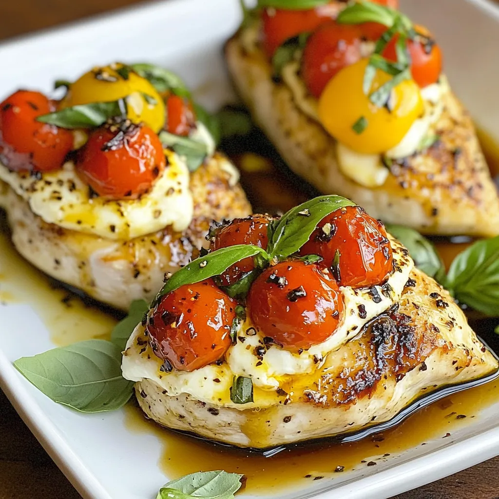 A delicious chicken breast stuffed with fresh mozzarella, cherry tomatoes, and basil, drizzled with balsamic glaze.