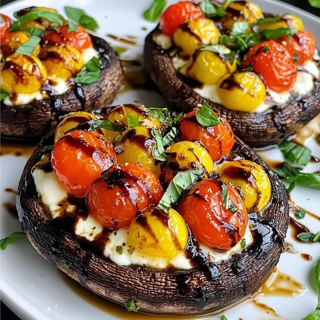 Delicious portobello mushrooms stuffed with fresh mozzarella, cherry tomatoes, and basil, drizzled with balsamic glaze.