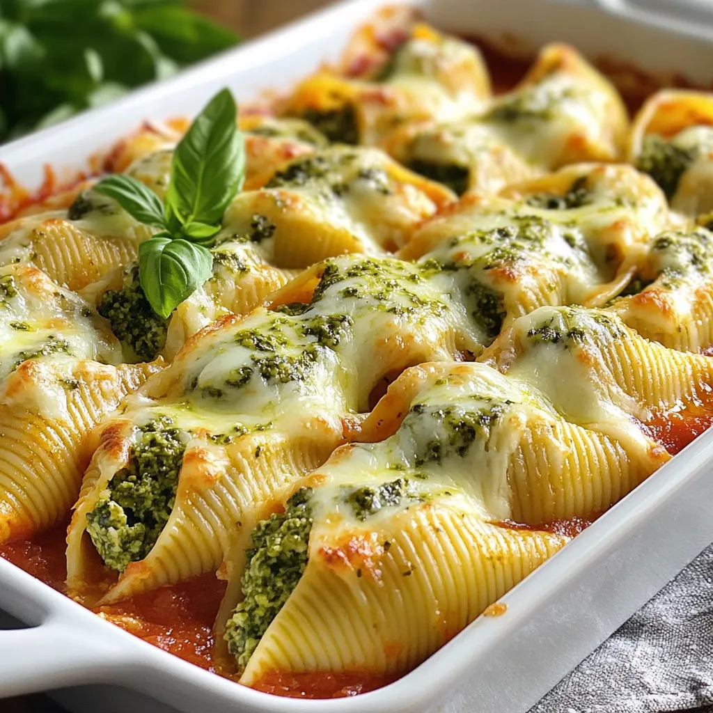 Delicious pasta shells stuffed with a cheesy spinach and pesto filling, topped with marinara sauce.