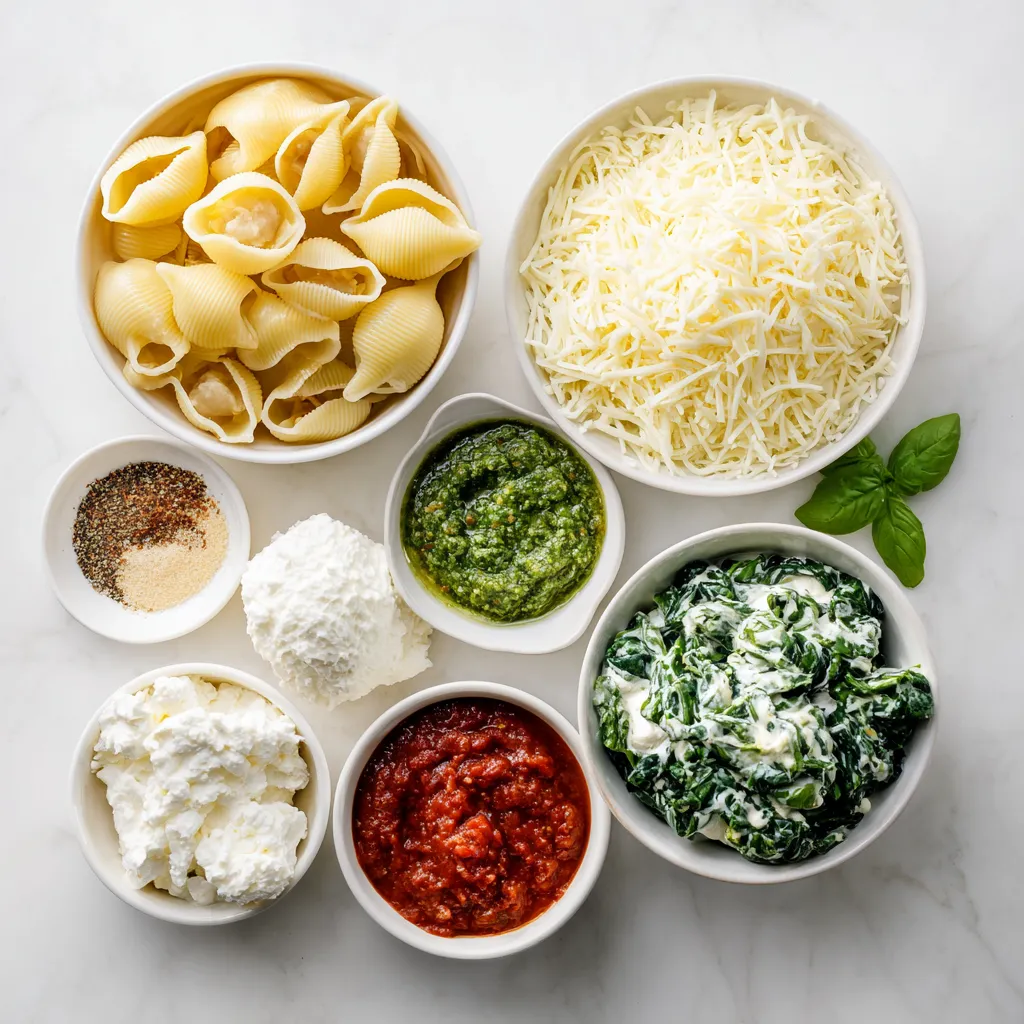 For Cheesy Spinach Pesto Stuffed Shells, gather these tasty items: