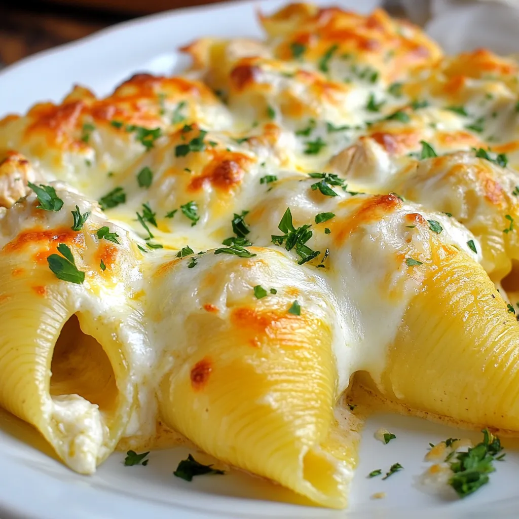 Delicious jumbo pasta shells stuffed with a creamy chicken and cheese mixture, topped with Alfredo sauce and melted mozzarella.