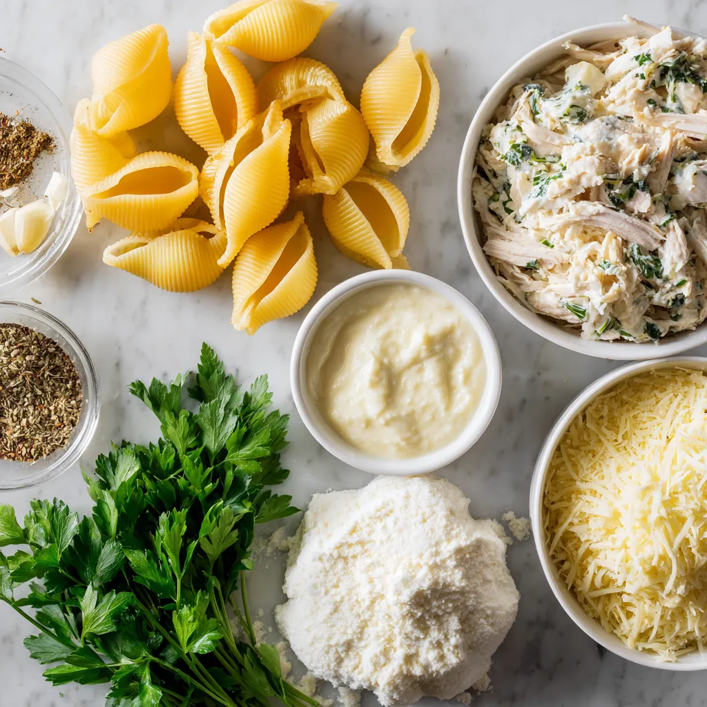 This dish starts with jumbo pasta shells. They hold the filling well and look fun. You’ll need about 20 shells for a good meal. Next, cooked chicken adds protein. You can shred or dice it, whichever you prefer.