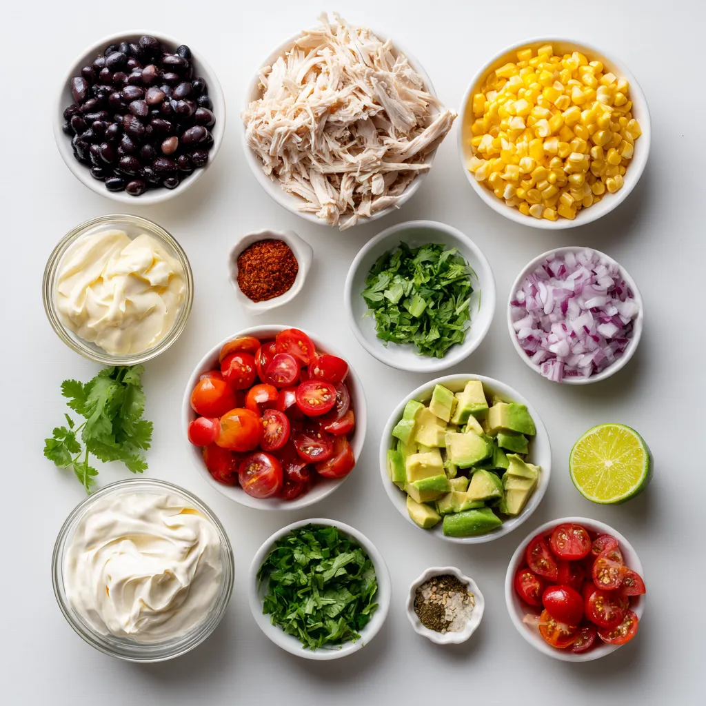 1. Start by mixing the salad ingredients. In a large bowl, add the shredded chicken, black beans, corn, diced red bell pepper, avocado, halved cherry tomatoes, and chopped red onion. Stir them well to mix all the colors and flavors. This step gives you a great base for the salad.
