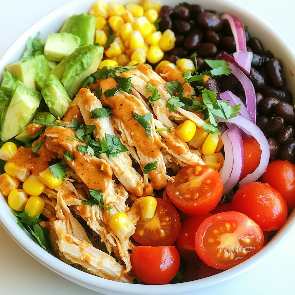 A flavorful salad featuring shredded chicken, black beans, corn, and a creamy chipotle ranch dressing.