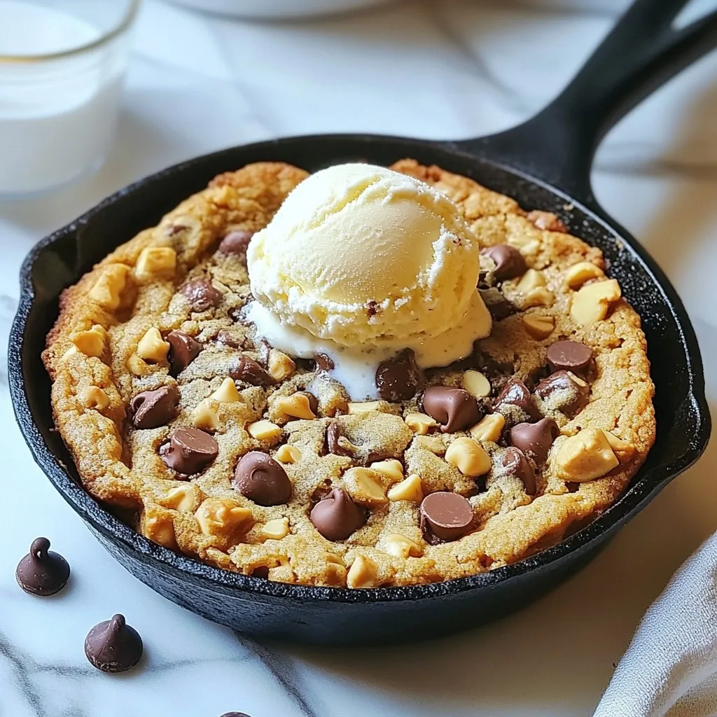 - 1 cup all-purpose flour - 1/2 teaspoon baking soda - 1/4 teaspoon salt - 1/2 cup unsalted butter, softened - 1/2 cup brown sugar - 1/4 cup granulated sugar - 1 teaspoon vanilla extract - 1 large egg - 1 cup semi-sweet chocolate chips The quality of your ingredients matters. Fresh flour and chocolate chips make a big difference. Softened butter helps create a rich, smooth dough. Using high-quality brown sugar adds depth of flavor. Always choose the best you can find. - 1/2 cup chopped walnuts (optional) - Vanilla ice cream for serving (optional) You can add walnuts for a nice crunch. If you want a nut-free version, simply leave them out. Want to shake things up? Use dark chocolate chips or even white chocolate. For a fun twist, try adding a sprinkle of sea salt on top. If you love ice cream, serve a scoop on top for extra joy. {{ingredient_image_1}} 1. Preheating the oven: First, set your oven to 350°F (175°C). This step is key to baking your cookie evenly. 2. Mixing dry ingredients: In a small bowl, whisk together 1 cup of all-purpose flour, 1/2 teaspoon of baking soda, and 1/4 teaspoon of salt. This mix adds structure and flavor to your cookie. 1. Techniques for creaminess: In a large bowl, cream together 1/2 cup of softened unsalted butter, 1/2 cup of brown sugar, and 1/4 cup of granulated sugar. Beat this until it’s light and fluffy, about 2-3 minutes. This step adds air for a soft cookie texture. 2. Incorporating the egg and vanilla: Next, beat in 1 large egg and 1 teaspoon of vanilla extract. Mix until fully combined. This will give your cookie a rich flavor. 1. Properly greasing the skillet: Use non-stick cooking spray or a bit of extra butter to grease a 10-inch oven-safe skillet. This helps prevent sticking. 2. Signs for doneness: Pour the cookie dough into the skillet and smooth the top. Bake for 20-25 minutes. Look for golden edges and a center that is set but still slightly soft. The cookie will continue to firm up as it cools. To get a soft center in your cookie skillet, aim for underbaking. Bake until the edges turn golden brown, but the center should still look a bit shiny. This method gives you that melty cookie feel. To avoid overbaking, set a timer for 20 minutes. Check your cookie after this time. If the edges look done, but the center seems soft, take it out. The cookie will continue to cook a bit after you remove it from the oven. This helps keep that gooey texture. Serving directly from the skillet adds charm. It creates a cozy feel for your guests. Use a large spoon for serving, so everyone can dig in. If you want to impress, try plating slices with a scoop of vanilla ice cream. Drizzle some chocolate sauce over the ice cream for extra flavor. You can also sprinkle chopped nuts or chocolate chips on top for a fun finish. Pro Tips Room Temperature Ingredients: Make sure your butter and egg are at room temperature before starting. This helps create a smoother batter and improves the texture of your cookie skillet. Don't Overmix: After adding the flour mixture, mix just until combined. Overmixing can lead to a tough cookie, so keep it gentle. Check for Doneness: The cookie is done when the edges are golden brown and the center is still slightly soft. It will continue to cook a little after being removed from the oven. Custom Flavors: Feel free to experiment with different mix-ins like white chocolate chips, dried fruits, or even a sprinkle of sea salt on top for a gourmet touch! {{image_2}} You can make this cookie skillet even more fun. Here are some ideas: - Different types of chocolate: Use dark chocolate, milk chocolate, or white chocolate chips. Each type adds a new taste. Mix and match them for a layered flavor. - Incorporating fruits or candy: Add dried fruits like cranberries or cherries for a tangy twist. You can also toss in candy like M&M's or Reese's Pieces for a sweet crunch. Each option makes your skillet unique. Feeling like a different approach? Here are some adjustments: - Gluten-free options: Swap all-purpose flour with almond flour or a gluten-free blend. This way, you can enjoy the cookie without gluten. Ensure other ingredients are also gluten-free. - Vegan alternatives: Use coconut oil instead of butter. Replace the egg with a flaxseed egg (1 tablespoon ground flaxseed mixed with 2.5 tablespoons water). This keeps the cookie moist and tasty while being plant-based. These variations let you tailor the cookie skillet to your taste and dietary needs. Enjoy experimenting! To store your chocolate chip cookie skillet, let it cool first. Once cooled, cover it with plastic wrap or foil. You can also place it in an airtight container. This helps keep it fresh. Store it in the fridge. It will last about three to four days. For the best results, reheat your cookie skillet in the oven. Preheat the oven to 350°F (175°C). Place the skillet in the oven for about 10 minutes. This restores the warm, gooey texture. You can also use the microwave. Heat it for about 20-30 seconds. Just be careful not to overheat. Enjoy your treat warm, just like fresh out of the oven! Can I make this recipe in advance? Yes, you can prepare the dough ahead of time. Store it in the fridge for up to two days. When ready, spread the dough in the skillet and bake it fresh. This way, you enjoy the warm, gooey cookie right out of the oven! What size skillet is best for this recipe? A 10-inch oven-safe skillet works best. It gives the cookie enough space to spread. If your skillet is smaller, the cookie might bake unevenly, leading to a flat result. Why is my cookie skillet flat? A flat cookie skillet may result from too much butter or not enough flour. Ensure you measure your ingredients correctly. Also, check your baking soda for freshness. Old baking soda may not help the cookie rise. How do I know when it's done baking? Look for golden edges and a slightly soft center. You can also insert a toothpick in the center. If it comes out mostly clean, your cookie is done! Let it cool fo