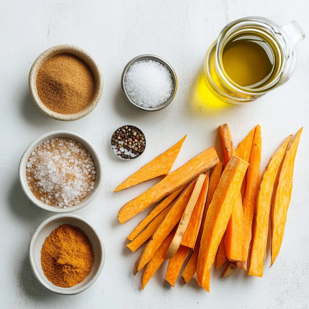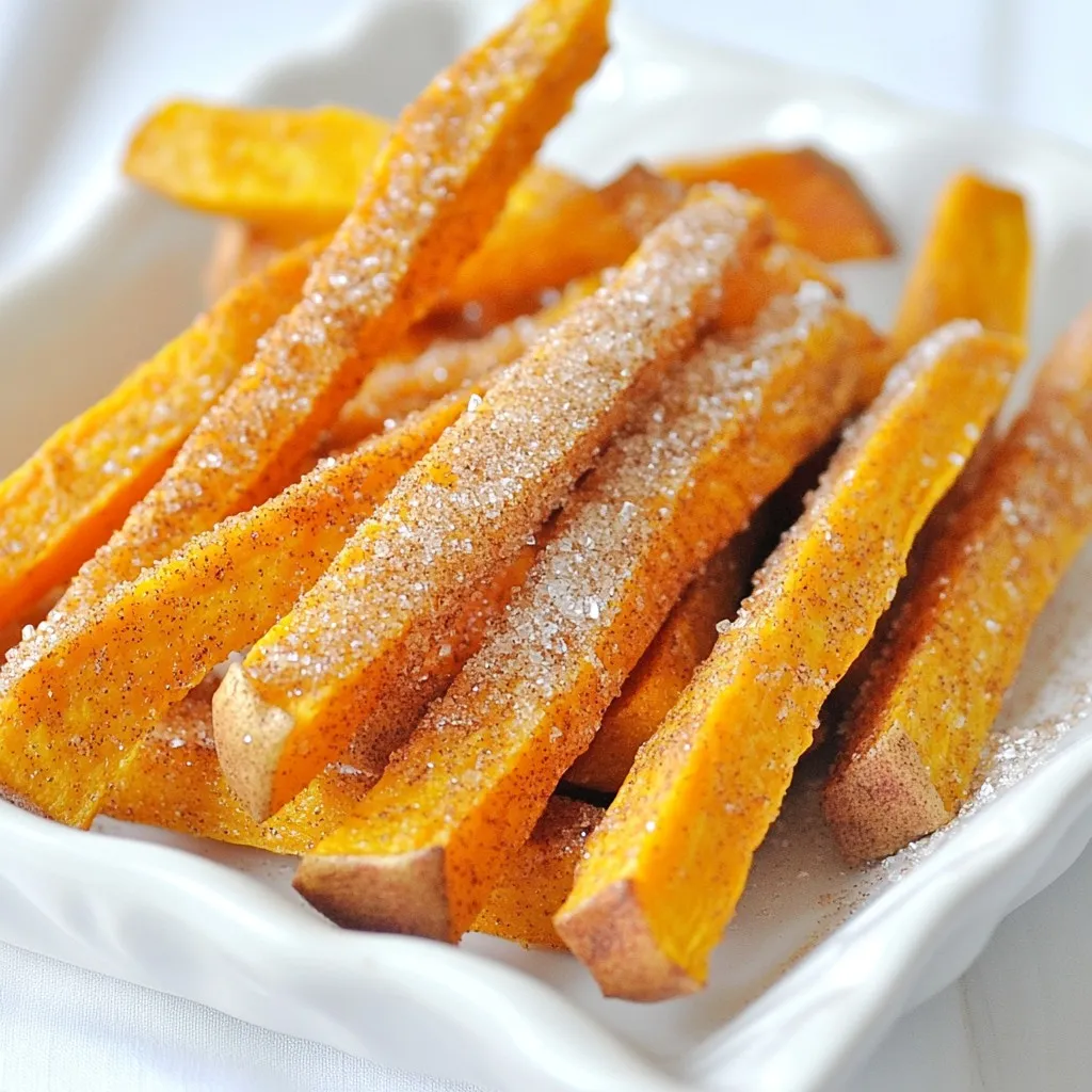 - 2 large sweet potatoes, peeled and cut into thin fries - 2 tablespoons olive oil - 1/4 cup granulated sugar - 1 teaspoon ground cinnamon - 1/4 teaspoon salt - 1/4 teaspoon cayenne pepper (optional) - Cooking spray - Baking sheet - Parchment paper - Large bowl - Small bowl - Calories per serving: Approximately 180 - Macronutrient breakdown: - Carbohydrates: 38g - Protein: 2g - Fat: 7g - Fiber: 5g {{ingredient_image_1}} First, peel the sweet potatoes. This step is key. Then, cut them into thin fries. Aim for uniform sizes. This helps them cook evenly. Next, place the cut fries in a large bowl. Drizzle 2 tablespoons of olive oil over them. Toss the fries well until they are coated. You want them shiny, not greasy. In a small bowl, combine 1/4 cup of granulated sugar and 1 teaspoon of ground cinnamon. Add 1/4 teaspoon of salt to balance the flavors. If you like a bit of heat, add 1/4 teaspoon of cayenne pepper. Mix well to blend all the spices. Taste it. If you want it sweeter, add more sugar. If you want more spice, add more cinnamon. Preheat your oven to 425°F (220°C). Line a baking sheet with parchment paper. Lightly spray it with cooking spray. This helps with sticking. Spread the sweet potato fries on the sheet. Make sure they are in a single layer. Do not let them overlap. This step is crucial for crispiness. Bake for 20-25 minutes. Flip the fries halfway through. They should turn golden brown and crispy. Once done, take them out and let cool for a few minutes. For extra flavor, sprinkle a bit more cinnamon sugar on top. To get crispy fries, space them out on the baking sheet. If you crowd them, they will steam instead of crisp up. Aim for one even layer. Flipping the fries halfway through baking helps them cook evenly. Use a spatula to turn them gently for a nice brown color on all sides. You can boost the flavor of your fries with more spices. Try adding nutmeg, ginger, or even vanilla. If you want a savory twist, mix in some garlic powder or smoked paprika. You can also switch things up by using less sugar for a more savory take. Serve your fries in a fun way. Use a colorful plate or a basket lined with parchment paper. Drizzle them with a bit of honey or maple syrup for added sweetness. For dipping, try a creamy yogurt sauce or a spicy ketchup. These options can make your fries even more enjoyable! Pro Tips Cut Evenly: Make sure to cut the sweet potatoes into uniform sizes to ensure even cooking and crispiness. Soak for Crispiness: Soaking the cut sweet potatoes in cold water for 30 minutes before baking can help achieve a crispier texture. Adjust Spices: Feel free to adjust the amount of cinnamon and cayenne pepper according to your taste preferences for a personalized flavor. Storage Tips: Store any leftovers in an airtight container in the refrigerator and reheat in the oven to maintain crispiness. {{image_2}} You can make your sweet potato fries spicy. Just add chili powder or paprika to the cinnamon sugar mix. This gives a nice kick and balances the sweetness. Start with a small amount. You can always add more if you want extra heat. The spice adds fun to each bite. You can make these fries vegan by switching a few things. Instead of olive oil, use avocado oil or melted coconut oil. The cinnamon sugar mix stays the same, so that part is easy. Check your sugar too. Some brands use bone char in the processing. Look for vegan sugar to keep it plant-based. Want to try different flavors? Use maple syrup or honey instead of granulated sugar. Drizzle it on the fries before baking. This gives a unique taste. You can also sprinkle some sea salt on top after baking. This contrast of sweet and salty will wow your taste buds. To keep your fries fresh, let them cool down. Place the sweet potato fries in an airtight container. This will help keep them crispy. Store them in the fridge for up to three days. If you want to keep them longer, consider other options. The best way to reheat your fries is in the oven. Preheat your oven to 400°F (200°C). Spread the fries on a baking sheet. Bake them for about 10 minutes. This will help them regain their crispiness. You can also use an air fryer. Just heat it to 375°F (190°C) and cook for 5-7 minutes. You can freeze sweet potato fries for longer storage. To do this, lay the uncooked fries on a baking sheet. Freeze them for about 1-2 hours until they are firm. Then, transfer them to a freezer bag. Make sure to remove as much air as possible. You can also freeze fully cooked fries, but they may lose some crispiness. To use frozen fries, thaw them in the fridge overnight before reheating. Yes, you can make cinnamon sugar sweet potato fries in an air fryer. Here’s how: - Preheat your air fryer to 400°F (200°C). - Toss the sweet potato fries with olive oil and cinnamon sugar as you normally would. - Place the fries in the air fryer basket in a single layer. - Cook for 15-20 minutes, shaking the basket halfway through. - Check for crispiness and adjust the time as needed. Using an air fryer gives you a crunchy texture with less oil. It’s a great option for a quick snack! These fries pair well with many dishes. Here are some tasty ideas: - Serve with a side of creamy yogurt dip. - Try a sweet honey mustard sauce for a fun twist. - Pair with fresh fruit for a sweet and savory combo. - Enjoy with roasted chicken or pork for a complete meal. These options will enhance your snack and make it more delightful! You can make these fries healthier with a few simple changes: - Use less sugar in the cinnamon sugar mix. - Swap granulated sugar for a natural sweetener like maple syrup. - Reduce the amount of olive oil or use a spray for light coating. - Bake instead of frying to cut extra calories. These tweaks keep the flavor while making the fries a bit lighter! You can make delicious cinnamon sugar sweet potato fries by following these steps. We reviewed the key ingredients, recommended equipment, and nutrition facts. I also shared tips for crispy fries