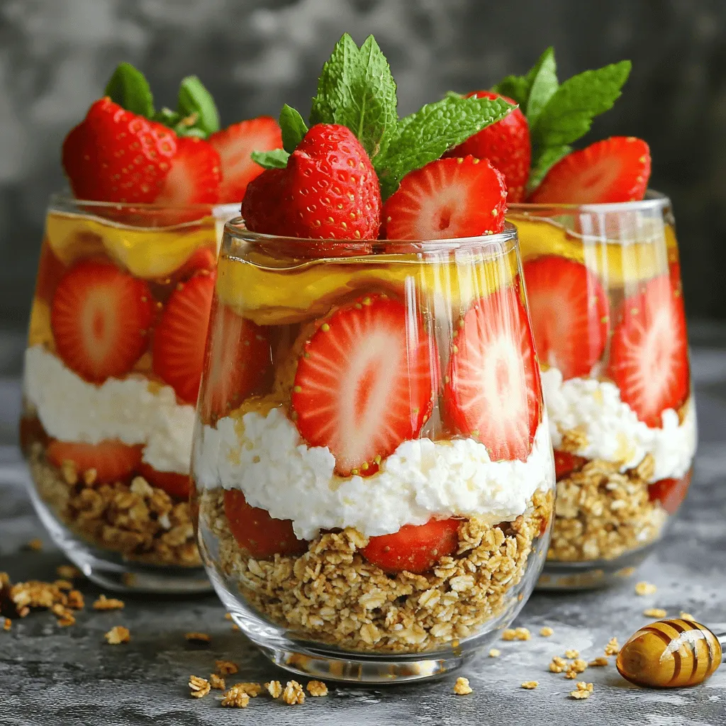 - 2 cups cottage cheese - 1 cup fresh strawberries, hulled and sliced - 1/2 cup granola (your choice) - 2 tablespoons honey or maple syrup - 1 teaspoon vanilla extract - 1/4 teaspoon cinnamon (optional) Cottage cheese is the star of this parfait. It packs protein and gives a creamy texture. Fresh strawberries add sweetness and a burst of flavor. Granola offers a nice crunch and balances the softness. You can sweeten the mix with honey or maple syrup. Vanilla extract makes the flavors pop, while cinnamon gives a warm touch. - Fresh mint leaves Mint leaves are a lovely touch. They add color and a fresh taste. You can place them on top for a beautiful look. - Mixing bowl - Parfait glasses or bowls - Measuring cups and spoons Having the right tools makes cooking fun. Use a mixing bowl to combine your ingredients. Clear parfait glasses help show off the layers. Measuring cups and spoons ensure you get the right amounts. - First, mix 2 cups of cottage cheese with 2 tablespoons of honey or maple syrup. - Add 1 teaspoon of vanilla extract and 1/4 teaspoon of cinnamon if you like. - Stir until the mixture is smooth and creamy. - Grab your parfait glasses or bowls. - Start with a layer of the cottage cheese mix at the bottom. - Next, add a layer of 1 cup of sliced strawberries on top. - Sprinkle 1/2 cup of granola over the strawberries for crunch. - Repeat the layers until you reach the top of the glasses. - Drizzle a little more honey or maple syrup on the last layer if you wish. - Finally, garnish with fresh mint leaves for a bright touch. To make your parfait look great, layer carefully. Start with cottage cheese at the bottom. This holds everything in place. Next, add sliced strawberries. Then sprinkle granola on top. Repeat these layers until you fill your glass. To keep granola crunchy, add it last. If you mix it in too early, it gets soggy. You can change the sweetness to fit your taste. Start with two tablespoons of honey or maple syrup. Taste it first. If you want it sweeter, add more. You can also try different flavors. Instead of vanilla, use almond extract. A pinch of cocoa powder can add a nice twist too. For more nutrients, try adding nuts or seeds. Chopped almonds or walnuts give a nice crunch. You can also add chia seeds or flaxseeds for extra fiber. To keep things fresh, mix in other fruits. Blueberries, raspberries, or bananas work well. This adds color and flavor to your parfait. {{image_2}} You can change the fruit in your parfait. Try blueberries, bananas, or even raspberries. Each fruit brings its own taste. You might also want to use seasonal fruits. Fresh peaches in summer or apples in fall can be delicious. If you follow a vegan diet, you can swap cottage cheese for plant-based yogurt. This keeps your parfait creamy and tasty. For those with gluten issues, look for gluten-free granola. Many brands offer tasty options that fit this need. You can modify the parfait to fit breakfast or a quick snack. For breakfast, add more protein. You might include nuts or seeds for extra crunch. For a fast snack, keep it simple. Layer fewer ingredients and enjoy it on the go. To keep your parfait fresh, cover it tightly. Use plastic wrap or a lid. Place the parfait in the fridge right away. This helps keep it cool and tasty. If you use granola, store it separately. This keeps it crunchy. When you're ready to eat, layer the granola back on top. You can prepare the ingredients ahead of time. Slice the strawberries and store them in a container. Mix the cottage cheese with sweeteners in a bowl. Keep everything in the fridge until you are ready to assemble. When you want to eat, layer the ingredients in parfait glasses. This makes it easy to enjoy a quick meal. Your parfait will stay fresh for about two days in the fridge. After that, the strawberries may get mushy. If you see any signs of mold or smell something off, throw it away. It’s better to be safe than sorry! A Cottage Cheese Strawberry Parfait has about 300 calories per serving. This can vary based on the ingredients you choose. Here’s the breakdown: - Cottage cheese (2 cups): 206 calories - Strawberries (1 cup): 50 calories - Granola (1/2 cup): 150 calories (depends on brand) - Honey or maple syrup (2 tablespoons): 120 calories By adjusting the granola or sweetener, you can manage the calorie count. This parfait is a nutritious choice, packed with protein and vitamins! Yes, you can use frozen strawberries! They are a great alternative. Here are some advantages and considerations: - Advantages: Frozen strawberries are often picked at peak ripeness. They stay fresh longer and are usually cheaper. They also save time on washing and hulling. - Considerations: Thaw the strawberries before use. This helps them mix well with the cottage cheese. Be aware that they may be mushy, which can affect texture. Using frozen strawberries can make this recipe quick and easy! Cottage cheese is a protein powerhouse! Here’s why it’s great for you: - High protein content: One cup has about 28 grams of protein. This helps build and repair muscles. - Low in fat: It has less fat than many other dairy products. This makes it a healthy choice for many diets. - Rich in calcium: Cottage cheese supports strong bones and teeth. It also aids in weight management. Adding cottage cheese to your diet can boost your protein intake and keep you feeling full! In this post, I shared how to make a tasty Cottage Cheese Strawberry Parfait. We covered the key ingredients like cottage cheese, strawberries, and granola. You learned layering steps and tips to perfect it. Adding personal touches with sweeteners and different fruits can make it unique. Remember to store your parfaits well for freshness. Enjoy this healthy treat for breakfast or a snack. You now have all you need to create your own delicious parfait!