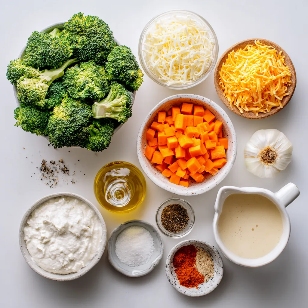 You need four cups of broccoli florets. Fresh broccoli gives the best taste. One cup of diced carrots adds color and sweetness. A small onion, chopped, gives depth to the flavor. Use three cloves of minced garlic for a nice kick. Four cups of vegetable broth forms the soup’s base. One cup of heavy cream makes it creamy and rich. Two cups of shredded sharp cheddar cheese bring the cheesy goodness. You will also need two tablespoons of olive oil to sauté the veggies. One teaspoon of salt is essential for taste. Add half a teaspoon of black pepper for warmth. Smoked paprika and nutmeg are optional but can add great flavor.