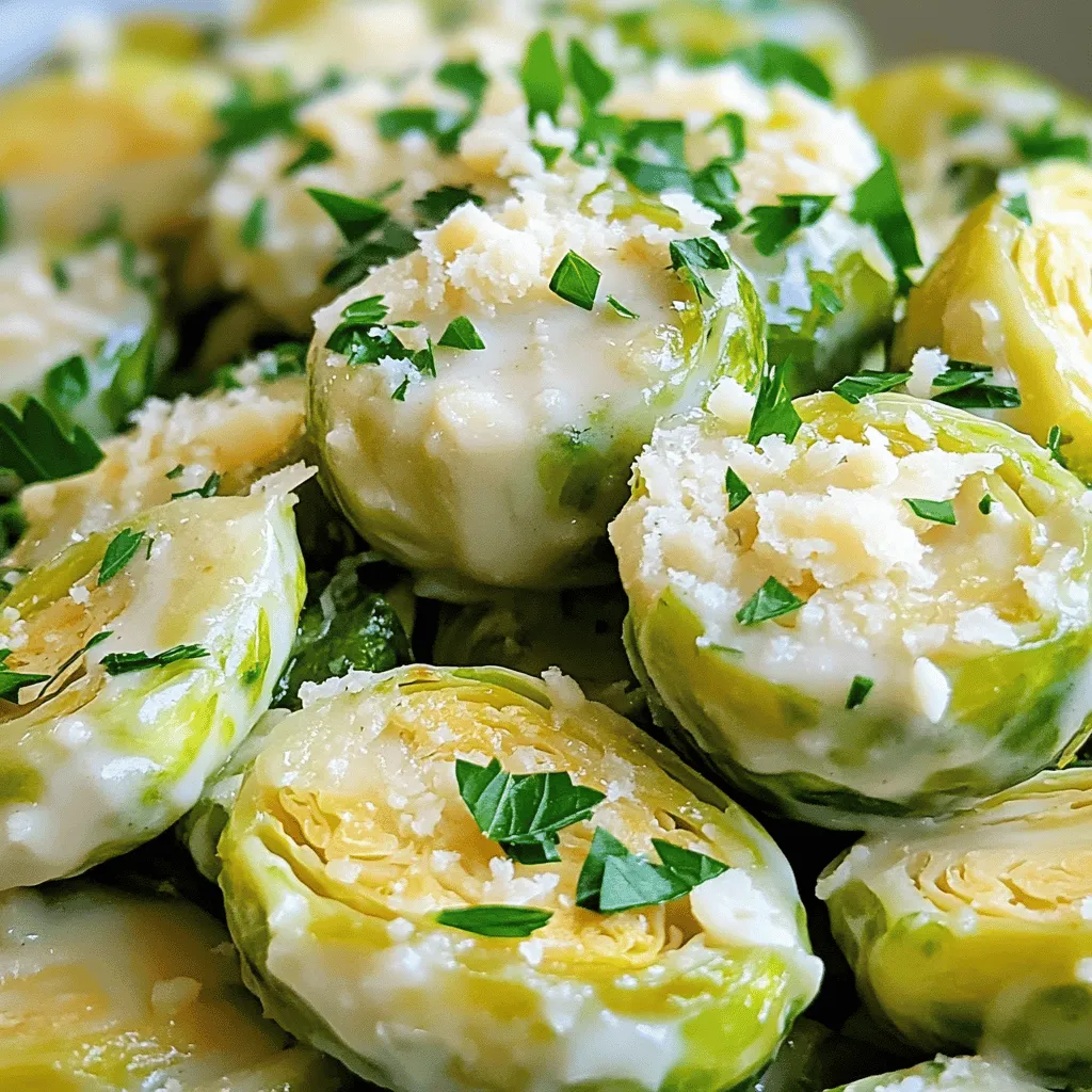 - 1 pound Brussels sprouts, halved - 2 tablespoons olive oil - 4 cloves garlic, minced - 1 cup heavy cream - 1 cup grated Parmesan cheese - 1 teaspoon onion powder - 1 teaspoon garlic powder - Salt and pepper to taste - Fresh parsley, chopped for garnish You need fresh Brussels sprouts for this dish. Look for bright green, firm sprouts. The olive oil adds a nice flavor and helps roast the sprouts. I love using garlic because it gives a strong taste that pairs well with the cream. Heavy cream makes this dish rich and smooth. Parmesan cheese adds a salty, nutty flavor. Onion powder and garlic powder boost the taste. Salt and pepper balance everything out. Finally, fresh parsley makes the dish look bright and fresh. It also adds a hint of flavor that makes it special. Gather these ingredients, and let’s make something delicious! First, you need to preheat your oven to 400°F (200°C). This step is key for even cooking. While the oven heats, grab a large mixing bowl. Toss the halved Brussels sprouts with 2 tablespoons of olive oil. Add salt and pepper to taste. Mix well until all the sprouts are coated evenly. Now, spread the prepared Brussels sprouts in a single layer on a baking sheet. Make sure they have space to roast well. Roast them in the preheated oven for 20-25 minutes. Check them halfway through to ensure they don’t burn. They should be tender and slightly caramelized when done. While the sprouts roast, heat a skillet over medium heat. Add 4 cloves of minced garlic and sauté for 1-2 minutes. Watch the garlic closely to avoid burning it. Once fragrant, pour in 1 cup of heavy cream and bring it to a gentle simmer. Next, stir in 1 cup of grated Parmesan cheese, 1 teaspoon of onion powder, and 1 teaspoon of garlic powder. Season with salt and pepper. Stir continuously until the cheese melts and the sauce thickens, which takes about 3-4 minutes. Once the Brussels sprouts finish roasting, add them to the skillet with the creamy sauce. Toss everything together to coat the sprouts evenly. Serve hot, garnished with chopped fresh parsley. This adds a nice touch of color and flavor to your dish. Enjoy your Creamy Garlic Parmesan Brussels Sprouts! When you pick Brussels sprouts, look for small, firm, and bright green ones. Avoid sprouts that have yellow leaves or soft spots. Fresh Brussels sprouts should feel heavy for their size. They should also be tightly closed and not have any cracks. This way, you ensure the best flavor and texture for your dish. To thicken your sauce, keep it on low heat while you stir. Adding more cheese helps too. If your sauce gets too thick, you can mix in a little water or broth. Be careful not to overcook the garlic. Sauté it just until it smells great, about one or two minutes. This way, it adds flavor without bitterness. You can spice up your dish by adding red pepper flakes or Italian herbs. For a fresh twist, try some lemon zest or a splash of lemon juice. You can also use crispy bacon bits or toasted nuts as a garnish. They add crunch and flavor, making your Brussels sprouts even more delightful! {{image_2}} For a vegan twist, you can swap the heavy cream with coconut milk or cashew cream. Use nutritional yeast instead of Parmesan cheese for a cheesy flavor. These changes keep the dish creamy and tasty without dairy. You can mix in other veggies for extra flavor. Try adding carrots, cauliflower, or kale. These vegetables roast well and add color. You can also use different cheeses. Feta or goat cheese can give a fresh touch to the dish. Serve these Brussels sprouts with a hearty main dish. They pair well with grilled chicken or baked salmon. For a vegetarian meal, serve with quinoa or stuffed peppers. These sides balance the rich flavors of the sprouts. Enjoy them as a side at your next dinner! To store your creamy garlic Parmesan Brussels sprouts, place them in an airtight container. They stay fresh for about 3 to 4 days in the fridge. Make sure to let them cool down before sealing. This helps keep the flavor and texture intact. The best way to reheat these sprouts is in the oven. Preheat the oven to 350°F (175°C). Put the Brussels sprouts in a baking dish. Cover them with foil to keep moisture in. Heat for about 15 minutes or until warm. This keeps them creamy and tasty. You can also reheat them in a skillet over medium heat. Stir gently to avoid burning. If you want to freeze these Brussels sprouts, first let them cool completely. Then, place them in a freezer-safe container or bag. They can last for up to 2 months in the freezer. When you’re ready to eat them, thaw them in the fridge overnight. Reheat them in the oven or skillet for the best taste. Yes, you can use frozen Brussels sprouts. Thaw them first for even cooking. Frozen sprouts may need a bit longer in the oven to cook through. Keep an eye on them to avoid overcooking. You can use half-and-half or milk mixed with butter as a lighter option. For a dairy-free choice, use coconut cream or cashew cream. Each will change the flavor slightly but will still create a creamy sauce. Roast Brussels sprouts for 20-25 minutes at 400°F (200°C). They should be tender and slightly browned. Check them at 20 minutes to see if they are ready. Reheat in a skillet over low heat. Stir them gently until warmed through. You can add a splash of cream or milk to restore creaminess if needed. Yes, you can prepare the Brussels sprouts and sauce ahead. Store them separately in the fridge. When ready to serve, reheat the sprouts and mix them with the sauce. This article covered how to make creamy Brussels sprouts. We discussed the ingredients you need and the step-by-step process to roast and prepare them. You learned tips to select fresh sprouts and variations to enhance flavor. I shared how to store leftovers and answered common questions. Enjoy cooking this dish, and feel free to make it your own. Creamy Brussels sprouts can become a favorite dish at your table!