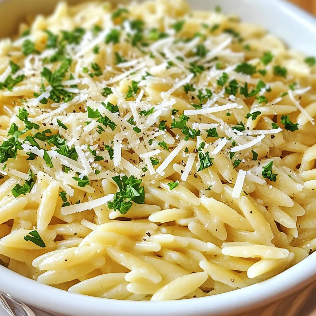 Here’s what you need for Creamy Garlic Parmesan Orzo: - 1 cup orzo pasta - 3 cups vegetable broth - 2 tablespoons olive oil - 4 cloves garlic, minced - 1 cup heavy cream - 1 cup grated Parmesan cheese - 1 teaspoon Italian seasoning - Salt and pepper, to taste - Fresh parsley, chopped (for garnish) Gathering these ingredients makes this dish simple and quick. The orzo pasta gives a nice bite, while the vegetable broth adds depth. Olive oil brings flavor, and garlic gives that lovely aroma. Heavy cream and Parmesan create the creamy goodness that you’ll love. Italian seasoning enhances everything, and salt and pepper bring it all together. Finally, fresh parsley adds a pop of color and taste. {{ingredient_image_1}} - First, take a medium saucepan. Pour in 3 cups of vegetable broth. - Bring the broth to a boil over medium heat. This step is key to flavor. - Add 1 cup of orzo pasta into the boiling broth. Cook it until it’s al dente. - Follow the package instructions for timing. It usually takes about 8-10 minutes. - Once done, drain the orzo in a colander. Set it aside for now. - In a large skillet, heat 2 tablespoons of olive oil over medium heat. - Add 4 cloves of minced garlic. Sauté for 1-2 minutes until it smells good. - Make sure the garlic does not brown. This keeps the flavor fresh. - Lower the heat, then stir in 1 cup of heavy cream and 1 teaspoon of Italian seasoning. - Let this cook for about 2 minutes. The mixture should heat through nicely. - Gradually add in 1 cup of grated Parmesan cheese. Stir as you add it in. - Keep stirring until the cheese melts and the sauce is creamy. - Now, add the cooked orzo to the creamy sauce in the skillet. - Gently toss the orzo with the sauce. Ensure every piece is coated well. - Taste and adjust the seasoning with salt and pepper if needed. - Let it sit for a couple of minutes to thicken slightly before serving. To cook orzo perfectly, use a large pot. This helps keep the pasta from sticking. Boil the vegetable broth first. This adds flavor to the orzo as it cooks. Stir the orzo often while it cooks. This keeps it from clumping together. You want the orzo to be al dente, firm but tender. To boost the taste, try adding a pinch of red pepper flakes. This gives a nice kick. You can also toss in some cooked spinach or peas for added nutrition. For a richer sauce, use half-and-half instead of cream. If you want it lighter, swap cream for low-fat milk. Always adjust salt and pepper to suit your taste. Pro Tips Use Fresh Garlic: Freshly minced garlic adds an aromatic punch to the dish. Avoid using pre-minced garlic for the best flavor. Adjust Cream for Thickness: If you prefer a thicker sauce, allow the cream to simmer a bit longer before adding the cheese. This will enhance the creaminess. Experiment with Cheese: Try mixing different types of cheese, like Pecorino Romano or Asiago, for a unique flavor twist. Just make sure they melt well. Garnish for Freshness: Fresh parsley not only adds color but also a fresh flavor. Consider adding lemon zest for an extra brightness. {{image_2}} You can change the cheese in this recipe. Try using mozzarella for a milder taste. Feta adds a salty kick. Goat cheese gives a creamy texture with tang. You can also mix cheeses for a richer flavor. If you want to switch up the pasta, go for whole wheat orzo. Rice or quinoa can work too. These options add different tastes and textures. Just adjust the cooking time based on what you choose. Adding vegetables makes this dish more colorful and nutritious. Spinach wilts down nicely and adds a fresh taste. Mushrooms give an earthy flavor and a nice bite. You can mix in frozen peas or sun-dried tomatoes for extra color. Protein can make this dish more filling. Chicken is a great choice. Cook it in the skillet before adding the sauce. Shrimp cooks quickly, so add it at the end. Both options work well and make the meal heartier. To keep your creamy garlic Parmesan orzo fresh, use an airtight container. Make sure the container seals well. This helps keep moisture in and air out. Store in the fridge for up to three days. If you want to keep it longer, you can freeze it. Use freezer-safe containers or bags. This will help prevent freezer burn. When it's time to enjoy your leftovers, reheat gently. You can use the microwave or a skillet. If you choose the microwave, heat in short bursts. Stir in between to ensure even warmth. If using a skillet, add a splash of broth or cream while reheating. This will keep the orzo creamy and smooth. Stir frequently to maintain that delicious texture. Enjoy your meal just as much as the first time! Orzo is a small, rice-shaped pasta. It is made from wheat. You can use orzo in many dishes, like soups and salads. Its shape makes it great for creamy dishes too. Orzo cooks quickly and can absorb flavors well. This is why it works perfectly in Creamy Garlic Parmesan Orzo. Yes, you can prepare this dish in advance. Cook the orzo and make the sauce separately. Combine them just before serving. This helps keep the pasta creamy. Store each part in an airtight container. When you are ready to eat, heat them together. Add a splash of broth or cream if needed. Absolutely! Creamy Garlic Parmesan Orzo is great for meal prep. You can make a big batch and portion it out. This dish tastes good even after a few days in the fridge. It is a filling meal that you can enjoy for lunch or dinner. Plus, it is easy to reheat. You will love having this tasty option ready to go! This blog post gave you a clear guide to making Creamy Garlic Parmesan Orzo. We covered ingredients, step-by-step instructions, and helpful tips. You learned how to perfect the orzo and enhance its flavor. We also explored variations and storage tips to keep leftovers fresh. Try out these ideas and make the dish your own. Cooking should be fun and tasty. Enjoy your creamy creation!