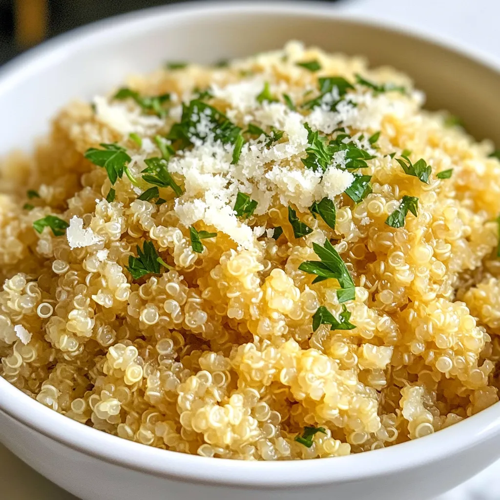 A delicious and creamy quinoa dish infused with garlic and Parmesan cheese, perfect as a main course or side.