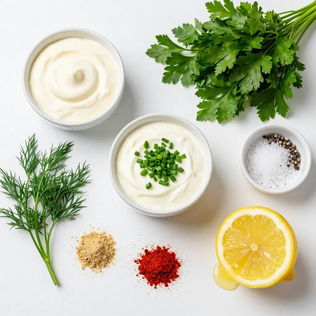To make my creamy Greek yogurt ranch dip, I gather fresh and tasty ingredients. The star of this dip is the Greek yogurt. It gives a rich base with a nice tang. I also add mayonnaise for extra creaminess.