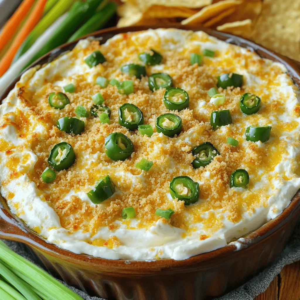 - 8 oz cream cheese, softened - 1 cup sour cream - 1 cup shredded cheddar cheese - 1 cup shredded pepper jack cheese - 4-6 fresh jalapeños, diced - 1/2 cup green onions, chopped - 1/2 cup breadcrumbs (optional) - 1 tablespoon garlic powder - 1 teaspoon smoked paprika - Salt and pepper to taste You can swap cream cheese with Greek yogurt for a lighter dip. For sour cream, use plain yogurt or cottage cheese. If you want different cheeses, try gouda or mozzarella. These changes keep the flavors tasty and fun! - Preheat the oven and prepare baking dish First, set your oven to 350°F (175°C). This temperature works best for baking the dip. While it heats, grab an 8x8-inch baking dish. You can lightly grease it with a bit of oil to prevent sticking. - Mixing the base ingredients In a large mixing bowl, add 8 oz of softened cream cheese and 1 cup of sour cream. Use a fork or a mixer to blend them until smooth. This mix is the creamy base of your dip. - Incorporating additional flavors Next, add 1 cup of shredded cheddar cheese and 1 cup of shredded pepper jack cheese. Then, toss in 4-6 diced jalapeños, 1/2 cup of chopped green onions, 1 tablespoon of garlic powder, and 1 teaspoon of smoked paprika. Don’t forget to add salt and pepper to taste. Stir everything until it is well combined. - Transferring dip to baking dish Once mixed, carefully transfer the dip mixture into your greased baking dish. Spread it out evenly with a spatula to ensure even cooking. - Adding topping (if using breadcrumbs) If you like a crunchy topping, sprinkle 1/2 cup of breadcrumbs evenly over the dip. This step is optional but adds a nice texture. - Baking time and checking doneness Place the dish in the preheated oven. Bake for 20-25 minutes. You’ll know it’s done when the dip is bubbly and the top is slightly golden. Once it’s ready, take it out and let it cool for a few minutes before serving. - Achieving the right creaminess: Start with softened cream cheese. Mixing it well with sour cream makes a smooth base. Blend until there are no lumps. This ensures a creamy texture that is easy to scoop. - Balancing spice levels: If you want less heat, remove the seeds from the jalapeños. You can also use fewer jalapeños. For a spicier kick, leave some seeds in. Taste the mixture before baking. Adjust as needed with extra jalapeños or a dash of hot sauce. - Ensuring even baking: Spread the dip evenly in your baking dish. This helps it cook through without hot or cold spots. Keep an eye on it during the last few minutes. When the top is golden, it’s ready! - Best dipping options: Pair the dip with tortilla chips for a classic crunch. Crackers also work well, adding a nice snap. For a fresh touch, use sliced veggies like carrots or bell peppers. They add color and flavor. - Garnishing ideas for presentation: Add sliced green onions or jalapeños on top before serving. This gives a pop of color. You can also sprinkle some smoked paprika for extra flair. It makes the dip look as good as it tastes! {{image_2}} You can change up the taste of this dip easily. Adding different spices can make it unique. Try adding cumin for warmth or chili powder for extra heat. If you want a smoky flavor, toss in some smoked paprika. You can even add a few dashes of hot sauce for a kick. Incorporating meats like bacon or crab can also enhance this dip. Bacon adds a crispy texture and rich flavor. Just cook the bacon until crispy, chop it, and mix it into the dip. If you prefer crab, use lump crab meat for a touch of luxury. Stir it in gently to keep it chunky. For a gluten-free option, simply skip the breadcrumbs. The dip will still taste great without them. You can serve it with gluten-free chips or veggies. If you want a vegan adaptation, swap the cream cheese and sour cream for plant-based versions. Many brands offer vegan cream cheese made from nuts or soy. Use nutritional yeast for a cheesy flavor without dairy. Check labels for gluten-free options if needed. These simple changes make the dip suitable for everyone. To keep your creamy jalapeño popper dip fresh, store it in the fridge. Place it in an airtight container. It will last for about three to four days. If you want to freeze it, that’s simple too. Use a freezer-safe container. Make sure to leave space at the top, as the dip will expand. It can stay in the freezer for up to three months. When ready to enjoy the dip again, you can reheat it. The best way is to use an oven. Preheat it to 350°F (175°C). Place the dip in an oven-safe dish. Heat for about 15-20 minutes until warm. You can also use a microwave. Heat it in short bursts, stirring in between. This method is quick but may change the texture a bit. To keep the dip creamy, avoid overheating. Stirring helps maintain a smooth texture. If it seems thick, add a splash of sour cream or cream cheese to revive it. How do I make my dip less spicy? You can cut down the heat by removing the seeds from the jalapeños. If you want it even milder, use fewer jalapeños. You can also mix in some extra cream cheese or sour cream. This will help cool it down. Can I prepare this dip in advance? Yes, you can make this dip ahead of time. Mix all the ingredients and store it in the fridge. Just bake it right before serving. This makes your party prep easier. What are the best chips to use for dipping? Tortilla chips are a classic choice. They are crispy and tasty. You can also try pita chips or fresh veggie sticks. Carrot and cucumber sticks work well, too. Can I serve the dip cold? This dip tastes best when it is warm and gooey. If you prefer it cold, feel free to try it. Just know the flavors will change a bit. How long can the dip sit out during a party? The dip can sit out for about two hours. After that, it’s best to refrigerate it. Keeping food safe is important, so be mindful of time! This blog explored a tasty layered dip that’s easy to make and adapt. You learned about key ingredients and useful substitutions. The step-b