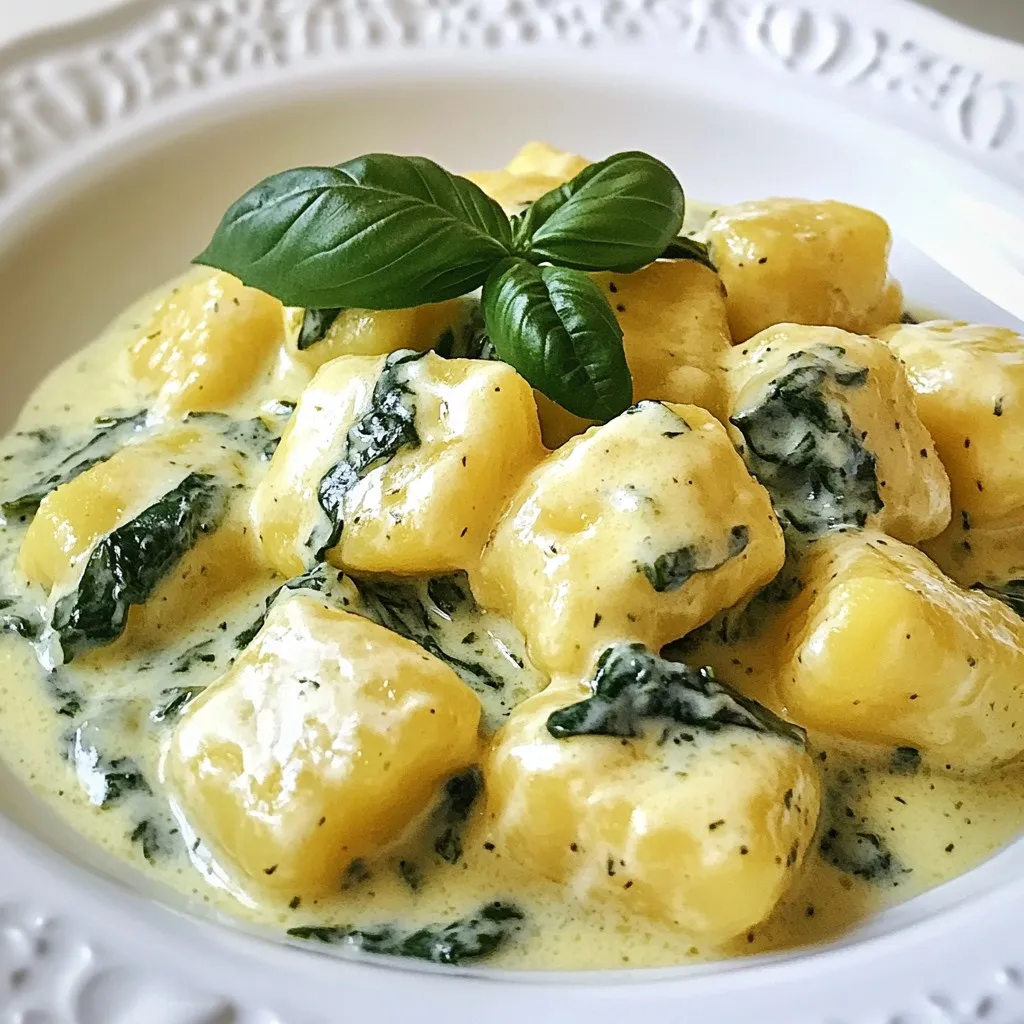 To make creamy Parmesan spinach gnocchi, gather these simple items: - 1 pound potato gnocchi - 2 cups fresh spinach, chopped - 1 cup heavy cream - 1 cup grated Parmesan cheese - 2 tablespoons unsalted butter - 2 cloves garlic, minced - 1 teaspoon onion powder - ½ teaspoon nutmeg - Salt and pepper to taste - Fresh basil leaves for garnish Choosing the right ingredients is key to a great dish. Here are some tips: - Potato Gnocchi: Look for gnocchi made from real potatoes. Check the label for quality. - Fresh Spinach: Select vibrant green spinach. Avoid any wilting or browning leaves. - Heavy Cream: Use pure heavy cream for the best richness and texture. - Parmesan Cheese: Grate fresh Parmesan instead of using pre-grated options. It tastes better! - Garlic: Choose firm, fresh garlic for a strong flavor. Avoid any that feels soft. This recipe serves about four people. Each serving is rich and filling. You can adjust the amount based on your needs. If you want leftovers, it’s great for lunch the next day! {{ingredient_image_1}} First, fill a large pot with water. Make sure to add salt to the water. Bring it to a boil over high heat. Once boiling, add 1 pound of potato gnocchi. Cook the gnocchi until they float to the top. This takes about 2 to 3 minutes. When they float, they are done! Drain the gnocchi in a colander and set them aside. Next, grab a large skillet and melt 2 tablespoons of unsalted butter over medium heat. Once the butter is melted, add 2 cloves of minced garlic. Sauté the garlic for about 1 minute. Keep an eye on it, so it doesn’t brown. After that, toss in 2 cups of chopped fresh spinach. Cook the spinach for 2 to 3 minutes until it wilts. Now, pour in 1 cup of heavy cream and stir to mix. Add 1 teaspoon of onion powder, ½ teaspoon of nutmeg, and salt and pepper to taste. Let this simmer for another 2 to 3 minutes until the sauce thickens a bit. Finally, stir in 1 cup of grated Parmesan cheese. Keep stirring until the cheese fully melts into the sauce. Now, it’s time to bring it all together! Add the cooked gnocchi into the creamy spinach sauce. Toss gently to coat each piece of gnocchi. Let everything cook together for an extra 2 minutes. This helps the flavors blend well. Once done, remove from heat. Serve the dish right away. Don’t forget to garnish with fresh basil leaves for a pop of color and flavor! To make perfect gnocchi, choose the right type. Use potato gnocchi, as it gives a soft texture. Cook them in boiling water until they float. This usually takes 2-3 minutes. Don't overcook them; they should be tender but not mushy. Drain them well to avoid a watery dish. Tossing them gently in the creamy sauce helps keep their shape. To boost the taste, use fresh ingredients. Mince garlic finely for a strong flavor. Sauté it in butter until fragrant, but avoid browning it. Add chopped spinach next, letting it wilt. This brings out its natural sweetness. Nutmeg adds warmth, while onion powder enhances depth. Always taste and adjust salt and pepper to your liking. Pairing is key for a great meal. A crisp white wine, like Sauvignon Blanc, works well with this dish. Its acidity cuts through the creaminess. For side dishes, a fresh salad with lemon dressing complements the meal. Garlic bread also makes a tasty addition. These options balance the rich flavors of the creamy gnocchi. Pro Tips Use Fresh Ingredients: Fresh spinach and high-quality Parmesan cheese make a significant difference in flavor and creaminess, enhancing the overall dish. Don’t Overcook the Gnocchi: Since gnocchi cooks quickly, keep an eye on them. They are ready when they float to the top, usually in 2-3 minutes. Customize the Sauce: Feel free to add other ingredients such as sun-dried tomatoes, mushrooms, or chicken for added flavor and texture. Garnish for Presentation: Fresh basil not only adds color but also a burst of freshness. Consider adding a drizzle of olive oil for an extra touch. {{image_2}} You can make this dish heartier by adding protein. Chicken, shrimp, or tofu work well. For chicken, cook diced pieces in the skillet until golden. For shrimp, add them after the garlic and cook until pink. If you prefer tofu, use firm tofu and sauté it until crisp. Each option adds great flavor and texture. If you need a dairy-free option, swap heavy cream with coconut milk or a nut milk. Use nutritional yeast instead of Parmesan for that cheesy taste. You can also find dairy-free cheese that melts well. These swaps keep the dish creamy and delicious without dairy. Adding veggies boosts nutrition and taste. Mushrooms add a nice earthiness. Sauté sliced mushrooms with garlic until soft before adding spinach. Peas add a sweet pop of color and flavor. Toss them in when you add the cream. Feel free to experiment with other veggies, like bell peppers or zucchini. Each adds its own unique twist. Store your creamy Parmesan spinach gnocchi in an airtight container. This keeps moisture in and prevents it from drying out. Place it in the fridge within two hours of cooking. It will last for about three days. When you're ready to enjoy it again, check for any changes in smell or texture before reheating. To freeze this dish, let it cool completely. Then, scoop it into freezer bags. Remove as much air as possible to avoid freezer burn. Label the bags with the date. It can stay good for up to three months. When you want to eat it, thaw it overnight in the fridge. This method keeps the flavors fresh. For reheating, the stovetop is best. Place the gnocchi in a skillet over medium heat. Add a splash of cream or water to help it heat evenly. Stir gently until it warms through. This keeps the sauce creamy and delicious. You can also use a microwave, but stir every minute to avoid hot spots. It takes about 20 minutes to make this dish. The prep time is 10 minutes. Cooking the gnocchi and sauce only takes another 10 minutes. This recipe is quick and easy, perfect for a busy night. Yes, you can use frozen gnocchi. J