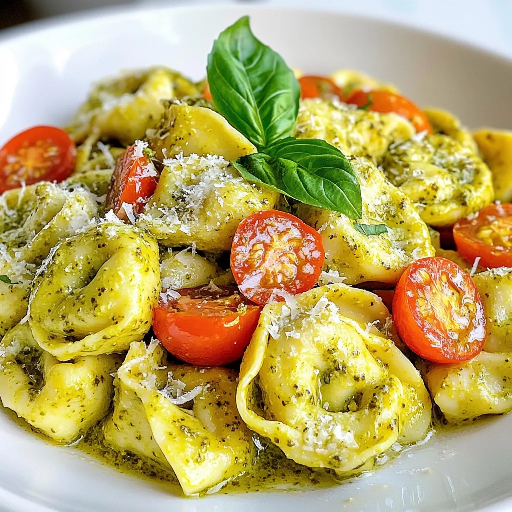 A delicious and creamy pasta dish with chicken, tortellini, and pesto.