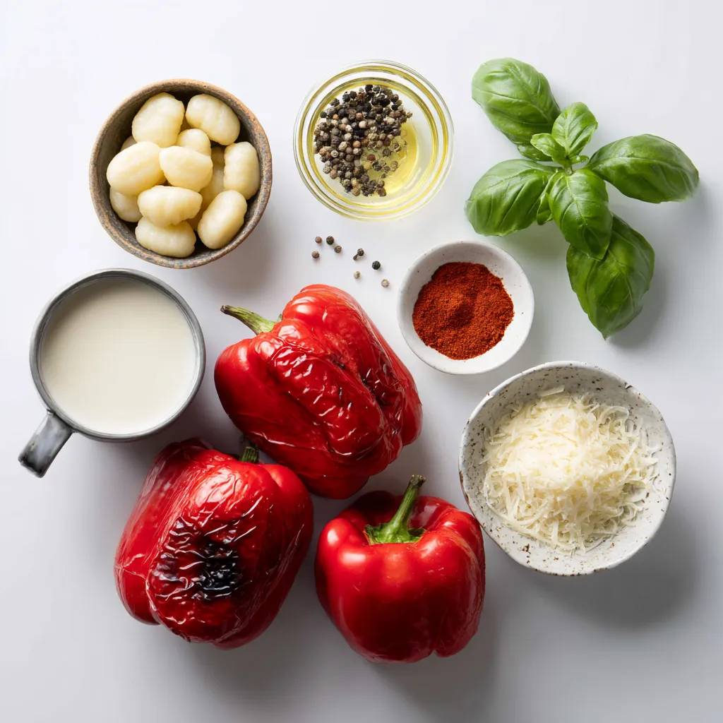 Each ingredient plays a key role in this dish. The gnocchi serves as the base, giving it a hearty feel. Roasted red peppers add a sweet and smoky flavor. Heavy cream brings a rich, smooth texture to the sauce. Onion and garlic build the flavor foundation, while spices like oregano and smoked paprika add warmth and depth. Salt and pepper enhance all these flavors, and fresh basil is a bright finish. Parmesan cheese is optional but adds a nice touch of saltiness.