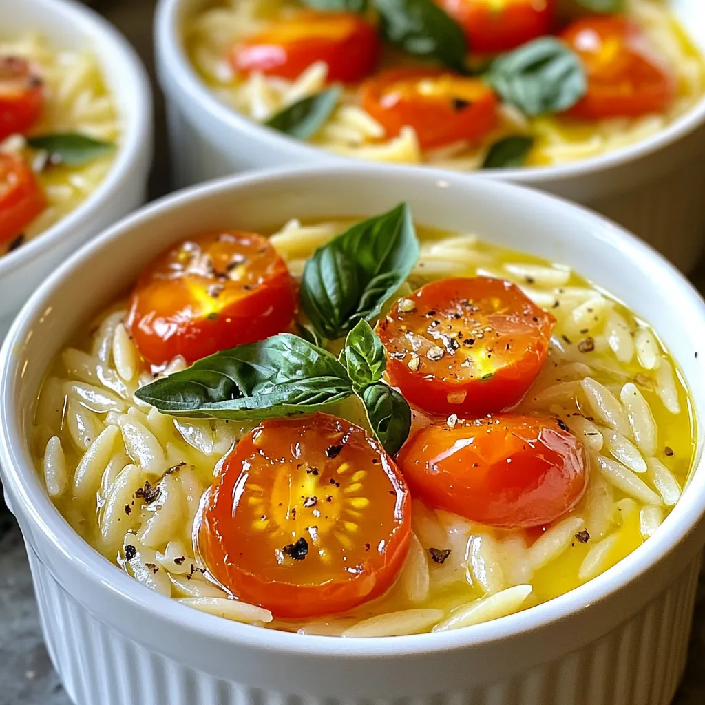 For creamy tomato basil orzo, you will need: - 1 cup orzo pasta - 2 cups vegetable broth - 1 cup cherry tomatoes, halved - 1 cup heavy cream or coconut cream - ½ cup grated Parmesan cheese (or nutritional yeast for a vegan option) - 2 cloves garlic, minced - 1 tablespoon olive oil - 1 teaspoon dried Italian herbs (basil, oregano) - Salt and pepper to taste - Fresh basil leaves for garnish Each ingredient plays a key role. If you need substitutes: - For orzo pasta, you can use any small pasta. - Vegetable broth can swap with chicken broth. - Use coconut cream for a dairy-free option. - Nutritional yeast works well instead of Parmesan cheese. Using fresh ingredients often gives better taste. For this dish: - Fresh basil adds bright flavor. - Fresh garlic has a stronger, sweeter taste. - Dried herbs are fine but use less, as they are more potent. Fresh tomatoes bring sweetness and juiciness. If you use canned tomatoes, choose whole or diced. Always drain excess liquid to prevent a watery dish. {{ingredient_image_1}} First, gather all your ingredients. You will need: - 1 cup orzo pasta - 2 cups vegetable broth - 1 cup cherry tomatoes, halved - 1 cup heavy cream or coconut cream - ½ cup grated Parmesan cheese (or nutritional yeast for a vegan option) - 2 cloves garlic, minced - 1 tablespoon olive oil - 1 teaspoon dried Italian herbs (basil, oregano) - Salt and pepper to taste - Fresh basil leaves for garnish Make sure to wash the cherry tomatoes and chop them. Mince the garlic well. This step helps in releasing the garlic's strong flavor. Begin by heating the olive oil in a medium saucepan over medium heat. Add the minced garlic and let it cook for about 1-2 minutes. You want it fragrant, not browned. Next, add the halved cherry tomatoes. Cook these for 3-4 minutes until they soften. Now, stir in the orzo pasta. Coat it well with the oil and garlic for about 1 minute. This adds flavor to the pasta. Then, pour in the vegetable broth and bring it to a boil. Once it boils, lower the heat and let it simmer. Stir occasionally for about 10-12 minutes. You want the orzo to be tender and absorb most of the liquid. Once the orzo is cooked, reduce the heat to low. Stir in the heavy cream and grated Parmesan cheese. Mix until the cheese melts and the sauce turns creamy. Season with dried herbs, salt, and pepper. If you want a creamier dish, add a bit more broth or cream. After mixing, remove the pan from the heat. Let the dish sit for a few minutes to thicken slightly. To make your orzo extra creamy, use high-quality heavy cream or coconut cream. These will blend well and give you that rich texture. Stir the mixture gently to avoid lumps. If you notice it’s too thick, add a splash of broth. This keeps the sauce smooth and helps it coat the pasta. Another tip is to use freshly grated Parmesan instead of pre-grated cheese. Fresh cheese melts better and creates a silkier sauce. Lastly, let the dish rest after cooking. It will thicken and develop its flavors, making every bite delightful. To boost flavor and creaminess, use fresh ingredients. Fresh basil adds a bright taste. Try using garlic and onion for more depth. A squeeze of lemon juice can brighten the dish. If you want it richer, add more cream or cheese. You can also try adding a bit of butter just before serving. This will give it a nice shine. One common mistake is overcooking the orzo. Keep an eye on the time. Orzo should be tender but not mushy. Another mistake is not seasoning enough. Taste the dish as you cook and adjust the salt and pepper. Also, don’t forget to let the dish sit for a few minutes after cooking. This helps it thicken and allows the flavors to blend. Serve the creamy tomato basil orzo in deep bowls. Top with fresh basil and a sprinkle of Parmesan cheese. This makes it look nice and inviting. For a side, pair it with a crisp green salad. A light vinaigrette goes well. You can also serve garlic bread or crusty rolls on the side. They are great for soaking up the creamy sauce. Pro Tips Use Fresh Herbs: Fresh basil will enhance the flavor profile of the dish significantly compared to dried herbs. Add them just before serving for maximum freshness. Adjust Creaminess: For a richer sauce, feel free to add more heavy cream or coconut cream. For a lighter version, simply increase the vegetable broth. Perfect Pasta Texture: Make sure to stir the orzo occasionally while it cooks to prevent it from sticking together and ensure an even texture. Garnish Wisely: A sprinkle of additional Parmesan cheese and a drizzle of high-quality olive oil can elevate the dish, making it look and taste gourmet. {{image_2}} You can easily make this creamy tomato basil orzo vegan. Just swap heavy cream for coconut cream. This gives a rich taste without dairy. Use nutritional yeast instead of Parmesan cheese. It adds a nice cheesy flavor. Both of these changes keep the dish creamy and delicious. Want to add more veggies? Try bell peppers, zucchini, or spinach. These add color and nutrients. Chop them small so they cook fast. You can mix them in while sautéing the garlic and tomatoes. This keeps everything fresh and bright. Herbs and spices can change the whole dish. You can use fresh basil for a strong flavor. If you like heat, add red pepper flakes. For a twist, try thyme or rosemary. These add depth and make the dish unique. Adjust herbs to match your taste. To keep your creamy tomato basil orzo fresh, store it in an airtight container. Let the orzo cool down before sealing it. This helps prevent extra moisture and keeps it from getting soggy. You can keep it in the fridge for up to three days. If you want to enjoy the dish later, make sure to label the container with the date. Reheating your leftover orzo is easy. You can use the microwave or the stove. For the microwave, place the orzo in a bowl and cover it with a damp paper towel. Heat it in short bursts, stirring in between, until it’s warm. On the stove, add a splash of broth or cream to a pan
