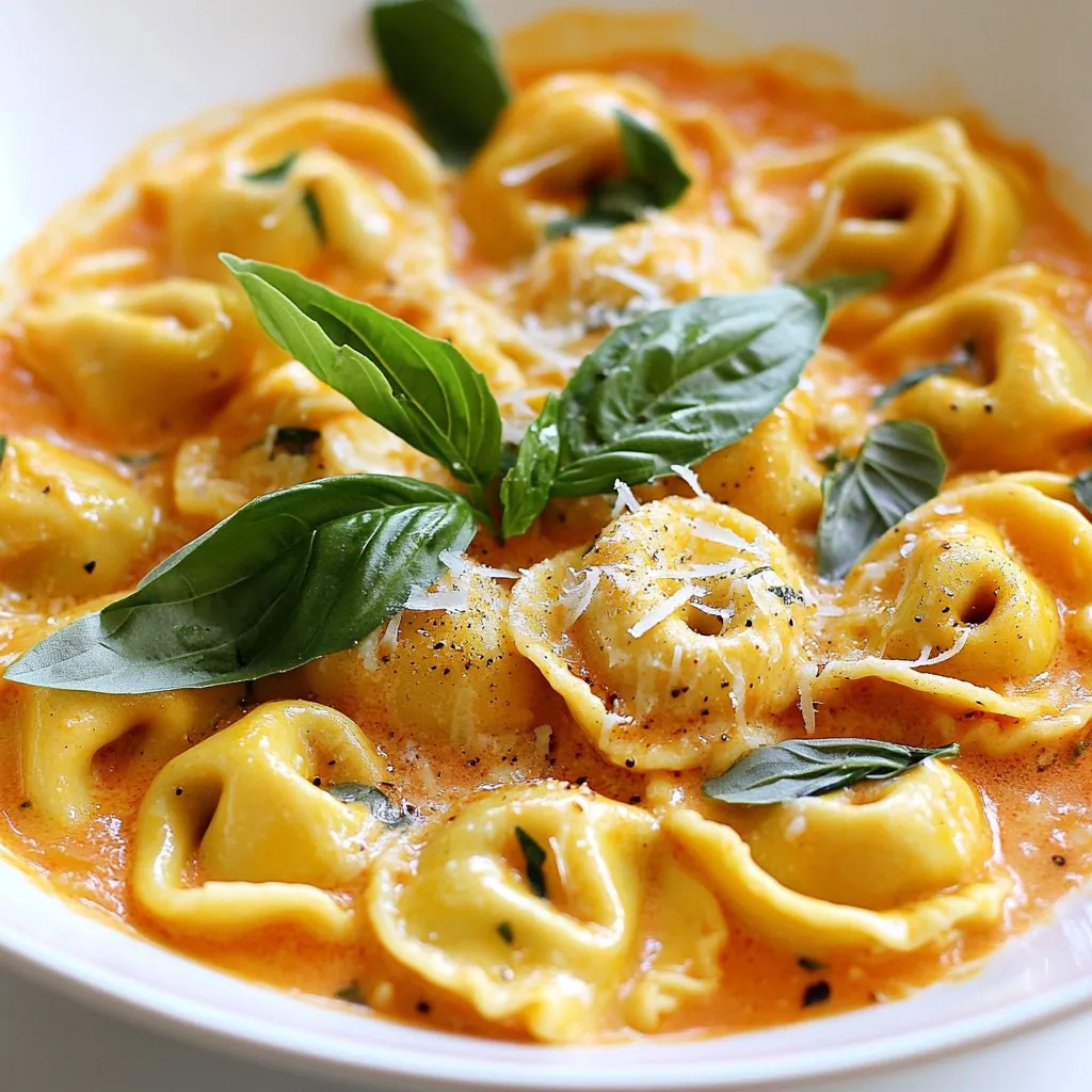 - 12 oz cheese tortellini - 1 tablespoon olive oil - 3 cloves garlic, minced - 1 can (14 oz) crushed tomatoes - 1 cup heavy cream - 1 teaspoon dried basil - 1 teaspoon sugar - Salt and pepper to taste - Fresh basil leaves for garnish - Grated Parmesan cheese for serving You can add vegetables to this dish for extra flavor. Spinach or mushrooms work great. You might also try a pinch of red pepper flakes for heat. If you love a tangy taste, add a splash of balsamic vinegar. Choose fresh cheese tortellini for the best texture. Look for tortellini with a rich filling. When buying tomatoes, select a can with no added sugar or preservatives. Fresh basil should be bright green and fragrant. For heavy cream, pick a brand with high fat content for creaminess. Always check the expiration dates on dairy products. {{ingredient_image_1}} First, fill a large pot with water and add salt. Bring it to a boil over high heat. Once boiling, add 12 oz of cheese tortellini. Cook them according to the package instructions. They should be tender but still firm, or al dente. This usually takes about 3 to 5 minutes. After cooking, drain the tortellini in a colander. Set them aside for later. In the same pot, pour in 1 tablespoon of olive oil and heat it over medium. Add 3 cloves of minced garlic and sauté them for about 1 minute. Watch closely so the garlic doesn’t burn. Next, stir in 1 can of crushed tomatoes. Bring the mix to a gentle simmer. Let it cook for 5 minutes to blend the flavors. Then, lower the heat and add 1 cup of heavy cream. Stir well to combine. Add 1 teaspoon of dried basil, 1 teaspoon of sugar, and salt and pepper to taste. Allow the sauce to simmer for another 5 minutes. Stir occasionally until it thickens slightly. Gently add the cooked tortellini into the creamy tomato sauce. Use a spatula to fold the pasta in the sauce carefully. This helps the tortellini get a nice coat of sauce. Remove the pot from the heat and let it rest for a couple of minutes. This allows the flavors to meld together. Serve the dish hot, garnished with fresh basil leaves and a sprinkle of grated Parmesan cheese. Enjoy your comforting and tasty meal! To make a great sauce, use fresh garlic. Sauté it just until fragrant. Avoid burning, as burnt garlic tastes bitter. Add crushed tomatoes and let them simmer to blend flavors. Stir in heavy cream slowly. This helps create a rich texture. Adjust seasoning with salt and pepper. Don’t forget the sugar; it balances the acidity from the tomatoes. Let it simmer longer for a thicker sauce. This gives the best creamy tomato basil tortellini you will love. One common mistake is overcooking the tortellini. Follow the package instructions closely. Undercook them slightly for the best texture. Another mistake is adding cold cream. Always warm it up a bit before adding. This helps the sauce blend smoothly. Lastly, don’t skip the salt. It enhances all the flavors in your dish. Pay attention to the simmer time. If you rush, the sauce may not thicken properly. Garnishing makes your dish look fancy. Use fresh basil leaves for a pop of color and flavor. A sprinkle of grated Parmesan cheese adds a nice touch. If you like a bit of heat, try crushed red pepper flakes. For a more gourmet look, drizzle some olive oil on top. You can also serve with a side of crusty bread. This makes a great meal even better. Pro Tips Tip Title: Use Fresh Ingredients: For the best flavor, use fresh basil and high-quality tomatoes. Fresh ingredients can elevate the dish significantly. Tip Title: Adjust the Creaminess: If you prefer a lighter sauce, you can substitute half of the heavy cream with vegetable or chicken broth for a less rich dish. Tip Title: Perfect Tortellini Cook Time: Make sure to cook the tortellini just until al dente to prevent them from becoming mushy once combined with the sauce. Tip Title: Garnish for Flavor: Don’t skip the fresh basil and Parmesan on top; they add a burst of flavor and a beautiful presentation to the dish. {{image_2}} You can easily make this dish vegetarian. Simply use cheese tortellini. If you want vegan, switch to dairy-free tortellini. For the sauce, use coconut cream instead of heavy cream. This keeps it creamy while being plant-based. You might also add some sautéed mushrooms or spinach for extra flavor and nutrition. Want to boost the protein in your meal? You can add cooked chicken or shrimp. Both options work great with the creamy sauce. If you prefer plant-based protein, try adding chickpeas or lentils. They blend well and add texture. Just make sure to cook them before mixing with the tortellini. You can change the flavor of your dish easily. For a spicy kick, add red pepper flakes to the sauce. If you love herbs, mix in fresh parsley or oregano. You can even experiment with garlic powder or onion powder. These small changes make a big difference in taste. Get creative and find your favorite flavor! To keep your creamy tomato basil tortellini fresh, store leftovers in an airtight container. Make sure the dish cools down first. This helps prevent steam build-up, which can make the pasta soggy. Leftovers can last up to three days in the fridge. When you’re ready to eat, check for any signs of spoilage first. Reheating is easy. You can use the stove or the microwave. For the stove, put the tortellini in a pan over low heat. Add a splash of water or cream to keep it moist. Stir it often until it’s hot. If you use the microwave, place it in a microwave-safe bowl. Heat in short bursts, stirring in between, until warm. Always check the temperature before serving. Freezing is a great way to save extra tortellini. First, let it cool completely. Then, place it in a freezer-safe container or bag. Squeeze out as much air as you can to prevent freezer burn. This dish can last up to three months in the freezer. When you’re ready to enjoy it, thaw it in the fridge overnight. Reheat as mentioned above for the best texture. Yes, you can use frozen tortellini. Jus