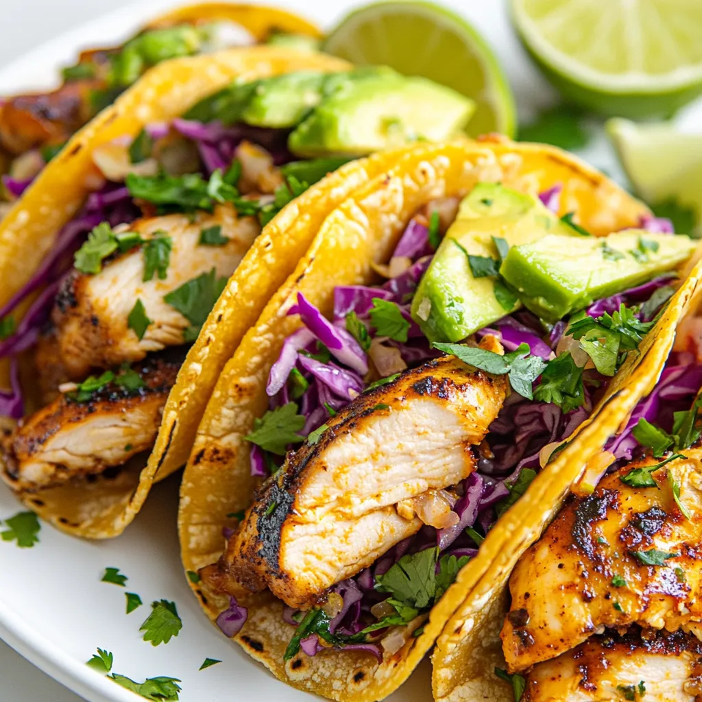 When it’s time to build the tacos, I warm small corn tortillas. They are soft and easy to fold. I pile on the sliced chicken first. Then, I add shredded red cabbage for crunch. Sliced avocado gives a creamy touch. Lastly, I sprinkle fresh cilantro for a burst of flavor. A wedge of lime on the side adds zest when squeezed over the taco. Each bite is a mix of tastes and textures.