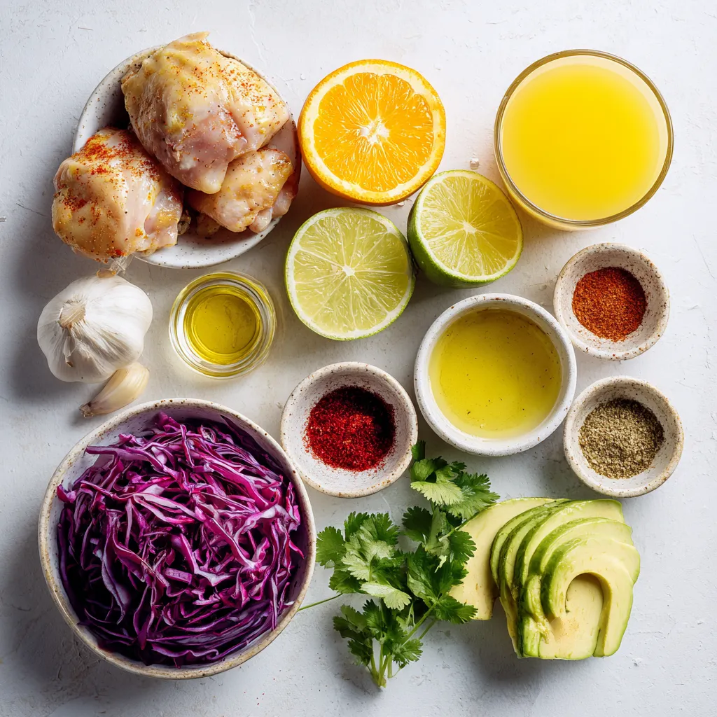 - 1 lb boneless, skinless chicken thighs - 1/4 cup fresh orange juice - 1/4 cup fresh lime juice - 4 cloves garlic, minced - 1 teaspoon cumin - 1 teaspoon oregano - 1/2 teaspoon smoked paprika - Salt and pepper to taste - 2 tablespoons olive oil For the Cuban mojo chicken, I use chicken thighs. They stay juicy and tender. The marinade makes the chicken flavorful. I mix fresh orange juice and lime juice for a bright taste. Garlic, cumin, oregano, and smoked paprika add depth. Salt and pepper round out the flavor. I let the chicken soak in this mix for hours or overnight. This helps the chicken absorb all those tasty flavors. - 8 small corn tortillas - 1 cup red cabbage, shredded - 1 avocado, sliced - Fresh cilantro leaves for garnish - Lime wedges for serving When it's time to build the tacos, I warm small corn tortillas. They are soft and easy to fold. I pile on the sliced chicken first. Then, I add shredded red cabbage for crunch. Sliced avocado gives a creamy touch. Lastly, I sprinkle fresh cilantro for a burst of flavor. A wedge of lime on the side adds zest when squeezed over the taco. Each bite is a mix of tastes and textures. {{ingredient_image_1}} To start, you need to mix the marinade. In a bowl, combine: - 1/4 cup fresh orange juice - 1/4 cup fresh lime juice - 4 cloves garlic, minced - 1 teaspoon cumin - 1 teaspoon oregano - 1/2 teaspoon smoked paprika - Salt and pepper to taste Stir these ingredients well to combine. This mixture adds zest and flavor to the chicken. Next, it’s time to marinate the chicken. Place 1 lb of boneless, skinless chicken thighs in a resealable plastic bag or a shallow dish. Pour the marinade over the chicken. Seal the bag or cover the dish. Refrigerate the chicken for at least 1 hour. For the best taste, let it marinate overnight. Now, let’s cook the chicken. Preheat your grill or skillet over medium-high heat. Once it’s hot, add 2 tablespoons of olive oil. This helps to prevent sticking and adds flavor. Remove the chicken from the marinade. Let any excess marinade drip off. Cook the chicken for about 6-7 minutes per side. You want the internal temperature to reach 165°F (74°C). This ensures the chicken is fully cooked and safe to eat. Once cooked, let the chicken rest for a few minutes. After resting, slice the chicken into strips. Now comes the fun part! Warm your 8 small corn tortillas on the grill or in a separate skillet. Heat them until they are soft and pliable. To assemble the tacos, lay a few slices of chicken on each tortilla. Top with shredded red cabbage and sliced avocado. Finally, garnish with fresh cilantro leaves. Serve with lime wedges on the side. These add a bright burst of flavor when squeezed over the tacos. Enjoy your delicious Cuban Mojo Chicken Tacos! Marinating the chicken is key. It helps the meat soak up all that great flavor. I suggest marinating for at least one hour. If you have time, let it sit overnight. This extra time really makes a difference. You can adjust the flavors easily. Want it sweeter? Add more orange juice. Like it tangy? Just use more lime juice. Play around until it fits your taste. To get the perfect chicken texture, don’t rush the cooking. Make sure your grill or skillet is hot before adding the chicken. Cook it for about 6-7 minutes on each side. You want it to reach 165°F inside. This ensures it stays juicy and tender. If you can’t grill, don’t worry! You can bake or pan-sear the chicken too. Just keep an eye on the time and temperature. When it’s time to fold your tacos, warm the tortillas first. This makes them more flexible and less likely to tear. Place your chicken slices in the center, then add the toppings. I like to add shredded red cabbage and avocado for crunch. Top it off with fresh cilantro. Serve with lime wedges for that final burst of flavor. Pair your tacos with some black beans or a fresh salad. These sides bring out the best in your Cuban Mojo Chicken Tacos. Enjoy! Pro Tips Marinate for Maximum Flavor: Allow the chicken to marinate overnight if possible. This will enhance the flavor and tenderness of the meat. Use a Meat Thermometer: To ensure the chicken is perfectly cooked, use a meat thermometer to check that the internal temperature reaches 165°F (74°C). Warm Tortillas Properly: Warm the corn tortillas on a hot grill or skillet for a few seconds on each side; this makes them more pliable and enhances their flavor. Garnish Creatively: Don't hesitate to add other toppings like diced tomatoes, pickled onions, or jalapeños for an extra flavor kick and visual appeal. {{image_2}} You can switch out chicken thighs for other proteins. Tofu is great for a plant-based option. Just press it first to remove water. Shrimp also works well and cooks fast. Use the same marinade for both. For toppings, you have many choices. Try diced tomatoes for a fresh bite. Pickled onions add a zing. You can also swap red cabbage for green. Each choice changes the flavor and look of your tacos. Cuban mojo chicken tacos are tasty, but you can mix things up. Serve the chicken over a bed of greens for a salad. Add your favorite dressing for more flavor. Want to get creative? Try Cuban nachos! Use tortilla chips as a base. Top them with chicken, cabbage, and cheese. Drizzle with lime juice to bring it all together. To keep leftover chicken fresh, place it in an airtight container. This helps avoid air and moisture. You can store it in the fridge for up to four days. If you want to keep it longer, freeze it. Wrap the chicken tightly in plastic wrap before placing it in a freezer bag. This method helps prevent freezer burn. You can freeze the chicken for up to three months. When you’re ready to eat it, thaw the chicken in the fridge overnight. When it comes to tacos, storing them correctly is key. If you have assembled tacos, eat them within a few hours. The tortillas may get soggy. If you have unassembled tacos, store the chicken, tortillas, and toppings separately. Keep the chicken in the fr