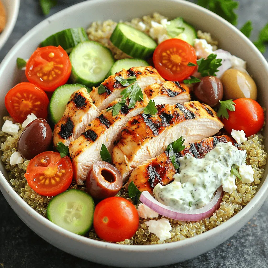- 2 boneless, skinless chicken breasts - 2 tablespoons olive oil - 2 teaspoons dried oregano - 1 teaspoon garlic powder - 1 teaspoon onion powder - Salt and pepper to taste The main ingredients create a tasty base for this dish. The chicken is juicy and tender. Olive oil adds richness and helps the spices stick. Dried oregano gives that classic Greek flavor. Garlic and onion powder enhance the taste. Seasoning with salt and pepper makes everything pop. - 1 cup cooked quinoa or rice - 1 cup cherry tomatoes, halved - 1 cucumber, diced - 1/2 red onion, thinly sliced - 1/2 cup feta cheese, crumbled - 1/4 cup pitted Kalamata olives, halved - Fresh parsley, chopped, for garnish Fresh veggies add color and crunch. Quinoa or rice serves as the perfect base. Cherry tomatoes bring sweetness, while cucumbers offer coolness. Red onion adds a bit of bite. Feta cheese gives a salty touch, and Kalamata olives add a briny flavor. Don’t forget the fresh parsley for a beautiful finish. - 1 cup plain Greek yogurt - Juice of 1 lemon - 1 clove garlic, minced - Pinch of salt Tzatziki sauce is a must-have. It cools down the meal and adds creaminess. The Greek yogurt is thick and rich. Fresh lemon juice brings brightness. Minced garlic boosts the flavor, and a pinch of salt ties it all together. This sauce is simple, but it makes a big impact. To start, you need to marinate the chicken. In a bowl, mix these ingredients: - 2 tablespoons olive oil - 2 teaspoons dried oregano - 1 teaspoon garlic powder - 1 teaspoon onion powder - Salt and pepper to taste Add the chicken breasts to the bowl. Make sure they are well-coated. Let the chicken marinate for at least 30 minutes. If you have time, marinate it overnight in the fridge for even better flavor. You can cook the chicken in two ways: grilling or in a skillet. Preheat your grill or skillet over medium-high heat. Cook the chicken for about 6 to 8 minutes on each side. You want the chicken to reach an internal temperature of 165°F (75°C). This ensures it is fully cooked. After cooking, let the chicken rest for 5 minutes before slicing. This keeps it juicy. Next, make the tzatziki sauce. In a small bowl, mix together: - 1 cup plain Greek yogurt - Juice of 1 lemon - 1 clove garlic, minced - A pinch of salt Stir the mixture well. This sauce is best chilled. So, refrigerate it until you are ready to serve. This helps the flavors blend nicely. Now, it’s time to assemble your bowls. Start with a base of cooked quinoa or rice. Add these toppings: - Diced cucumber - Halved cherry tomatoes - Sliced red onion - Crumbled feta cheese - Halved Kalamata olives Once you layer the toppings, place the sliced chicken on top. Finally, drizzle the tzatziki sauce over everything. For a finishing touch, sprinkle fresh parsley on top. This adds color and flavor to your Greek chicken gyro bowls. To get the perfect grill marks, preheat your grill or skillet. Cook the chicken for 6-8 minutes on each side. Look for nice, dark grill lines. This gives the chicken that great look and flavor. After cooking, let the chicken rest for 5 minutes. This helps keep it juicy. If you cut it too soon, all the juices run out. Trust me; waiting is worth it! When you serve the bowls, think about colors and layers. Start with a base of quinoa or rice. This adds texture. Then, pile on the fresh veggies like cucumbers and tomatoes. Combine flavors by adding crumbled feta and Kalamata olives. They add saltiness and creaminess. Drizzle tzatziki sauce on top. It ties everything together and makes it look amazing! If you need alternatives, swap chicken for chickpeas or grilled veggies. Both options are tasty and add protein. For dietary needs, use brown rice or a gluten-free grain instead of quinoa. This keeps the dish friendly for everyone. You can still enjoy the flavors and feel good about your meal! {{image_2}} You can easily make a delicious vegetarian gyro bowl. Instead of chicken, use grilled vegetables. Bell peppers, zucchini, and eggplant work great. Marinate them just like the chicken for flavor. Grill them until they are tender and have nice char marks. This swap keeps your meal fresh and tasty. To make your gyro bowl even better, think about adding more toppings. Try adding avocado slices for creaminess. You can also add pickled red onions for extra zing. Fresh herbs like dill or mint can enhance the flavors too. Experiment with different sauces. A spicy harissa or a sweet tahini can change the whole vibe of your dish. Serve your gyro bowls with some tasty side dishes. Greek salad pairs perfectly with these bowls. You can also offer pita bread for a fun touch. For drinks, consider serving iced tea or a light red wine. These options will complement the Greek flavors and make your meal complete. To keep your Greek Chicken Gyro Bowls fresh, use airtight containers. Glass or plastic containers work well. Make sure the chicken and toppings are separated to keep them fresh. Store them in the fridge for up to three days. When reheating, the best method is using the microwave. Heat the chicken in short bursts. Aim for one minute, then check if it’s warm. Stir the bowls to heat evenly. You can also use a skillet on low heat. This method keeps the chicken juicy and tasty. You can freeze the assembled bowls, but it’s best to freeze the chicken separately. Wrap each bowl tightly in plastic wrap, then in foil. They can last up to three months in the freezer. When ready to eat, thaw it overnight in the fridge before reheating. You can use several tasty alternatives. Try cauliflower rice for a low-carb option. Couscous is also a good choice if you want something light. For a gluten-free option, use millet or even lentils. Each adds a unique flavor and texture to your gyro bowls. You can store tzatziki sauce for about 3 to 5 days. Keep it in a sealed container in the fridge. The flavors get better as it sits, so it’s great for meal prep. If you see any changes in color or smell, it's best to toss it out. Abs