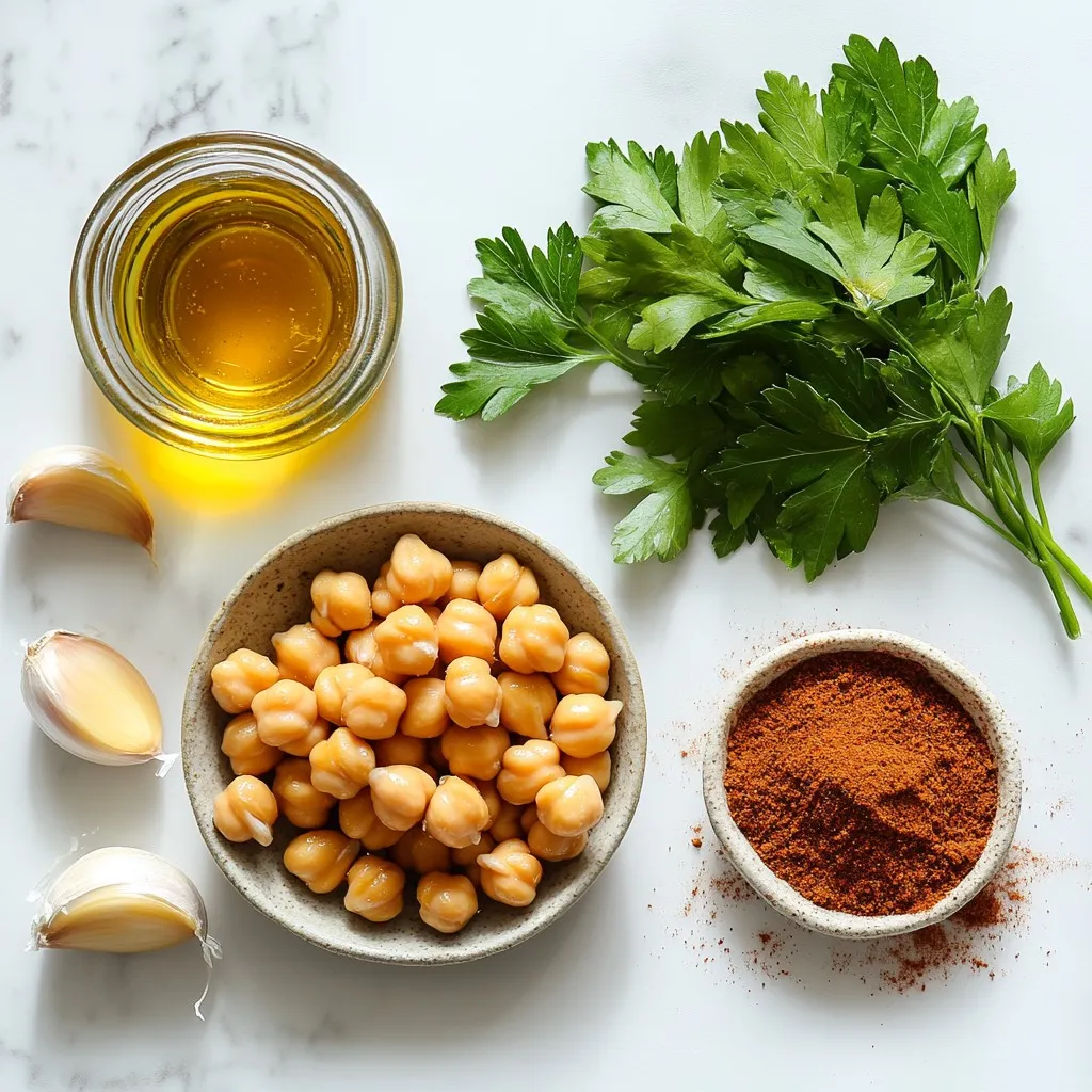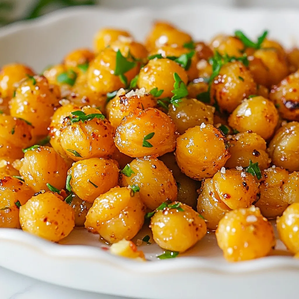 To make honey garlic roasted chickpeas, you need the following items: - 1 (15-ounce) can chickpeas, drained and rinsed - 2 tablespoons olive oil - 2 tablespoons honey - 2 cloves garlic, minced - 1 teaspoon smoked paprika - ½ teaspoon ground cumin - ½ teaspoon salt - ¼ teaspoon black pepper These ingredients create a tasty snack that is both sweet and savory. The chickpeas provide protein and fiber. The honey adds a touch of sweetness, while the garlic and spices give it a bold flavor. You can enhance your dish with these optional items: - Fresh parsley for garnish Adding fresh parsley brightens up the dish. You can also use other herbs like cilantro or basil. Feel free to experiment with different flavors. Each serving contains: - Calories: 150 - Protein: 6g - Carbohydrates: 23g - Fat: 5g - Fiber: 5g This snack is a healthy choice. It is low in calories and high in fiber, which helps keep you full. Plus, it's a great way to enjoy a crunchy treat without guilt. {{ingredient_image_1}} First, preheat your oven to 400°F (200°C). This heat is key for a nice crunch. Next, take one can of chickpeas. Drain and rinse them well. This step removes excess salt and helps with flavor. Spread the chickpeas on a kitchen towel. Pat them dry gently to remove moisture. This helps them crisp up in the oven. In a mixing bowl, add 2 tablespoons of olive oil. Next, add 2 tablespoons of honey. Then, toss in 2 cloves of minced garlic. Don't forget the spices! Add 1 teaspoon of smoked paprika, ½ teaspoon of ground cumin, ½ teaspoon of salt, and ¼ teaspoon of black pepper. Stir everything together until it’s well mixed. This coating adds sweet and savory notes to the chickpeas. Now, add the dried chickpeas to the bowl with the honey garlic mixture. Toss them well so every chickpea gets coated. Spread the chickpeas on your lined baking sheet in a single layer. Place the sheet in the preheated oven. Roast the chickpeas for 25 to 30 minutes. Be sure to shake the pan halfway through to cook them evenly. When they turn golden brown and crispy, they are ready. Remove them from the oven and let them cool slightly. You can sprinkle fresh parsley on top for a pop of color. Enjoy your crunchy snack! To get your chickpeas nice and crispy, drying them is key. After rinsing, spread them on a towel. Pat them dry well to remove moisture. Extra water leads to soggy snacks. When you toss them with the olive oil and honey mix, make sure they are evenly coated. Spread them out on your baking sheet in one layer. This helps them cook evenly. Shake the pan halfway through to ensure all sides crisp up. Choose a quality olive oil for the best flavor. Extra virgin olive oil is a great choice. It has a rich taste and a hint of fruitiness. This oil will enhance the flavor of your honey garlic mix. If you want a lighter flavor, you can use regular olive oil. Just make sure it is fresh. Old oil can taste bitter and ruin your dish. If you want to change the recipe, you can swap honey for maple syrup. This will keep it sweet and vegan-friendly. For spices, feel free to play around. You can use chili powder for heat or add garlic powder for a stronger garlic taste. If you don’t have smoked paprika, regular paprika works too. Just adjust the amounts to fit your taste. You can also add fresh herbs like rosemary or thyme for a fresh twist. Pro Tips Dry Chickpeas Well: Make sure to thoroughly dry the chickpeas with a kitchen towel after rinsing. Removing excess moisture helps achieve a crispy texture during roasting. Adjust Sweetness: Feel free to adjust the amount of honey based on your sweetness preference. You can also substitute it with maple syrup for a vegan option. Experiment with Spices: Don't hesitate to mix in your favorite spices! Adding a pinch of cayenne pepper or chili powder can give your chickpeas a delightful kick. Store Properly: To maintain their crunch, store leftover roasted chickpeas in an airtight container at room temperature. They are best enjoyed within a few days. {{image_2}} To make sweet and spicy honey garlic chickpeas, add a dash of cayenne pepper. This gives a nice kick that pairs well with the sweet honey. You can also mix in a bit of brown sugar for extra sweetness. These flavors will create a tasty contrast that keeps you wanting more. For a fresh twist, add herbs to your roasted chickpeas. Try mixing in dried rosemary or thyme before roasting. These herbs add a lovely aroma and a unique taste. You can also sprinkle on some fresh parsley after roasting for a bright touch. To give your chickpeas an Asian flair, swap honey for maple syrup. Add soy sauce and a hint of ginger to the mix. This creates a savory flavor that is rich and satisfying. Toasted sesame seeds on top will add crunch and depth to the dish. To keep your leftover chickpeas fresh, let them cool first. Once they are cool, place them in an airtight container. Store the container in the fridge. They will stay good for up to three days. Make sure to keep the lid tight to avoid moisture. When you want to enjoy your chickpeas again, reheating them is key. Preheat your oven to 400°F (200°C). Spread the chickpeas on a baking sheet. Bake them for about 10 minutes. This will help them regain their crunch. Avoid using the microwave, as it makes them soggy. If you want to save your chickpeas for longer, try freezing them. First, let the chickpeas cool completely. Then, spread them out on a baking sheet in a single layer. Freeze them for about one hour. Once frozen, transfer them to a freezer bag. They can stay in the freezer for up to three months. When ready to eat, just reheat in the oven for a crispy snack! Yes, you can use dried chickpeas instead of canned ones. However, you must cook them first. Start by soaking the dried chickpeas overnight. After soaking, boil them until they are tender. This process takes about one to two hours. Once cooked, drain and rinse them before using in the recipe. Dried chickpeas will have a firmer texture and a ric