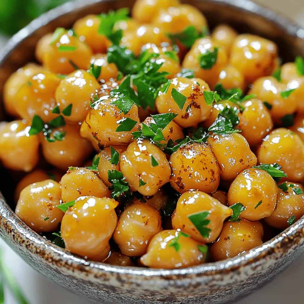 - Canned vs. dried chickpeas: You can use either canned or dried chickpeas. Canned chickpeas are easy and quick. Just rinse and dry them. Dried chickpeas need soaking and cooking first. If you choose dried, soak them overnight and boil until tender. - Sweetener options: Honey is the star here, adding sweet flavor. If you prefer, you can use maple syrup or agave nectar. Each sweetener brings its unique taste, but honey gives the best caramelization. - Essential seasonings and their roles: Each seasoning plays an important part. Olive oil helps the chickpeas crisp up. Garlic adds a strong, savory flavor. Smoked paprika gives warmth and depth. Cumin contributes a hint of earthiness. Salt and black pepper enhance all flavors. Fresh parsley adds a bright touch at the end. First, drain the canned chickpeas. Rinse them under cold water. This helps remove extra sodium. After rinsing, pat them dry with a clean kitchen towel. Drying is key for crispiness. Moisture can make them soggy when roasted. In a large bowl, combine olive oil, honey, and minced garlic. Add smoked paprika, cumin, salt, and black pepper. Mix well until all ingredients blend together. This mixture will coat the chickpeas and add flavor. Preheat your oven to 400°F (200°C). Line a baking sheet with parchment paper. Spread the chickpeas in a single layer on the sheet. Roast them for 25-30 minutes. Stir halfway through to ensure even cooking. Look for a golden brown color. This shows they are crispy and ready to enjoy! To make your chickpeas crispy, start by drying them well. After you rinse the canned chickpeas, use a clean kitchen towel. Pat the chickpeas until they are dry. This step is key. Moisture will make them soft. You want them crunchy, not soggy. Spread them out on the towel to dry for a few minutes. The drier they are, the crispier they will get in the oven. You can boost the taste of your chickpeas with spices. Try adding a pinch of cayenne for heat or mix in some Italian herbs. A dash of garlic powder can also enhance the flavor. If you like a smoky taste, add more smoked paprika. Feel free to experiment! This recipe is a blank canvas. You can use what you love and make it your own. Serve your honey garlic roasted chickpeas in a nice bowl. A small, colorful dish works great. For a fancy touch, drizzle some extra honey on top. Fresh parsley adds a nice green color. You can also serve them with dips. Hummus or yogurt dip pairs well. Mix and match as you like! This makes for a fun, tasty snack or appetizer. {{image_2}} You can change up the taste of honey garlic roasted chickpeas in fun ways. One idea is to make a sweet and spicy version. Just add some chili flakes to the honey garlic mixture. This gives the chickpeas a nice kick. It balances the sweet honey with heat. Another idea is to give them a Mediterranean twist. You can add dried herbs like oregano or thyme. Maybe even some lemon zest for freshness. This adds a whole new flavor and makes them feel light and bright. You have options for cooking honey garlic roasted chickpeas. The oven works great, but you can also try air frying. Air frying cooks them faster and can make them extra crispy. Both methods work, but air frying can cut down on cooking time. If you choose the oven, remember to preheat it to 400°F (200°C). This helps the chickpeas to roast evenly and become crunchy. These chickpeas can be a tasty snack on their own. But you can also pair them with dips or salads for a fun twist. Try serving them with hummus or tzatziki. They add a nice crunch to your favorite salads too. You can even sprinkle them on top of soups for added texture. Enjoy being creative with how you serve these delicious bites! To store your honey garlic roasted chickpeas, use airtight containers. Glass or plastic containers work well. Make sure to let them cool first. This helps keep them crispy. Store them at room temperature for short-term use. If you plan to keep them longer, consider the fridge. Cold storage can help them last a bit longer. Roasted chickpeas can stay fresh for up to a week at room temperature. To maintain their crunchiness, avoid moisture. Keep them away from humid areas. If stored in the fridge, they last about five days. Check for any signs of sogginess before eating. If they feel soft, they may need a re-crisp. To re-crisp your roasted chickpeas, use the oven. Preheat it to 375°F (190°C). Spread the chickpeas on a baking sheet in a single layer. Bake for about 10 minutes. Keep an eye on them to avoid burning. You can also use an air fryer for quick results. Set it to 350°F (175°C) and cook for around 5 minutes. Enjoy your crunchy snack! Yes, you can use dried chickpeas. First, soak them overnight in water. This helps soften them. Drain and rinse the chickpeas. Then, cook them in boiling water for about 1 to 1.5 hours. They should be tender but firm. After cooking, follow the same steps in the recipe. This way, you can enjoy fresh chickpeas with the honey garlic flavor. Honey garlic roasted chickpeas last about 3 to 4 days when stored properly. Keep them in an airtight container. Store them at room temperature to keep them crunchy. Avoid refrigeration, as it can make them soggy. If you want to keep them longer, consider freezing them. Just know that they may lose some crispiness after thawing. Yes, you can make this recipe vegan. Simply replace honey with maple syrup or agave nectar. Both options add sweetness without any animal products. Use the same amount as you would honey. This keeps the dish tasty and suitable for everyone. Enjoy the same great flavors while being vegan-friendly! Honey garlic roasted chickpeas are easy and fun to make. Start with the right ingredients like canned chickpeas and your choice of sweeteners. Follow simple steps to prepare, roast, and serve them perfectly. Use tips for crunch and flavor to enhance your dish. In summary, I hope this guide inspires you to try honey garlic roasted chickpeas. They are tasty and versatile, perfe