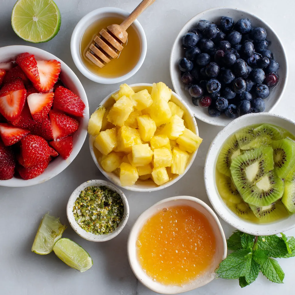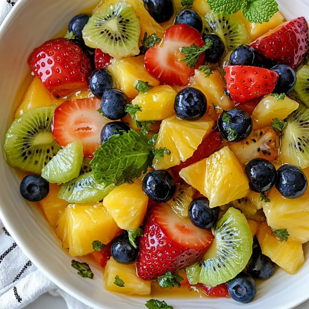 For this honey lime fruit salad, you need a mix of fresh fruits. They add bright colors and flavors. Here’s what you’ll need: - 2 cups strawberries, hulled and halved - 2 cups pineapple, diced - 2 cups blueberries - 2 cups kiwi, peeled and sliced - 1 orange, segmented These fruits bring sweetness and a bit of tang. You can mix and match based on what you love. The dressing is key to bringing all the flavors together. You’ll need: - 1/4 cup honey - 2 tablespoons fresh lime juice - Zest of 1 lime These ingredients create a sweet and tangy mix. The honey adds sweetness, while the lime juice gives a fresh kick. The zest enhances the citrus flavor. To make your fruit salad look even better, consider adding: - Fresh mint leaves These leaves not only look nice but also add a refreshing taste. Just sprinkle them on top before serving. {{ingredient_image_1}} Start with fresh fruit. I like to use strawberries, pineapple, blueberries, kiwi, and orange. Here’s how to prepare them: - Hull and halve 2 cups of strawberries. - Dice 2 cups of pineapple. - Rinse 2 cups of blueberries. - Peel and slice 2 cups of kiwi. - Segment 1 orange. Once you have prepped all the fruit, place them in a large mixing bowl. This colorful mix will make your salad pop! Now, let’s make the dressing. This adds a sweet and tangy flavor. Here’s what you need: - 1/4 cup honey - 2 tablespoons fresh lime juice - Zest of 1 lime In a small bowl, whisk together the honey, lime juice, and lime zest. Mix until smooth. This dressing is quick to make and tastes amazing! Next, it’s time to combine everything. Drizzle the honey-lime dressing over the fruit. Gently toss the fruit to coat it well. Be careful not to mash the fruit. Let the salad chill in the fridge for about 15 minutes. This helps the flavors blend together. Just before serving, give it one last toss and add fresh mint leaves for garnish. Enjoy your refreshing honey lime fruit salad! Pick ripe, fresh fruits for the best taste. Look for strawberries that are bright red. Choose pineapples that smell sweet and feel firm. Select blueberries that are plump and smooth. For kiwi, the skin should be slightly soft. Oranges should be heavy for their size and firm. This ensures a sweet and juicy salad. Add a pinch of salt to boost the sweetness. Try a splash of vanilla extract for extra flavor. You can also mix in a bit of coconut for a tropical twist. Fresh herbs like basil or mint add a fun taste. Zesting the lime adds a nice zing to the dish. Don’t skip chilling the salad; it makes a big difference. Serve the salad in clear bowls for a beautiful view. Garnish with mint leaves for a pop of color. You can also use skewers for fun fruit kabobs. This dish is great for picnics or barbecues. Pair it with yogurt for a tasty breakfast option. You can even use it as a topping for pancakes. Pro Tips Use Fresh Fruits: Always opt for the freshest fruits available for the best flavor and texture in your salad. Chill Before Serving: Allowing the salad to chill for at least 15 minutes helps the flavors meld and enhances the overall taste. Customize with Seasonal Fruits: Feel free to swap in seasonal fruits to keep the salad fresh and exciting throughout the year. Garnish for Presentation: Adding fresh mint leaves not only enhances the flavor but also makes your fruit salad visually appealing. {{image_2}} You can easily adapt this honey lime fruit salad. If you want a vegan option, replace honey with maple syrup or agave nectar. This keeps the sweet taste without using animal products. For those who need a low-sugar option, try using a sugar substitute like stevia. You can still enjoy a tasty salad while meeting your dietary needs. Fruits change with the seasons, and you can use them to your advantage. In summer, add ripe peaches or juicy cherries. In fall, you might enjoy diced apples or pears. Feel free to mix in seasonal berries, like raspberries or blackberries, for a fun twist. The salad will taste fresh and vibrant with each season's best fruits. Want to shake things up? Try adding a handful of nuts like almonds or walnuts for crunch. You can also mix in yogurt to make it creamier. For a spicy kick, add a pinch of chili powder or cayenne pepper to the honey-lime dressing. Each twist can make this dish truly yours while keeping it fun and delicious! To keep your honey lime fruit salad fresh, store it in a sealed container. Use an airtight container to block out air and moisture. If you plan to serve it later, don’t mix the dressing in until you are ready. This way, the fruit stays crisp and bright. If stored properly, your fruit salad lasts about 3 days in the fridge. After that, the fruit may start to lose its texture. Check for any signs of spoilage, like browning or mushiness. If the fruit looks or smells off, it’s best to toss it. If you have leftover fruit salad, get creative! You can blend it into smoothies for a refreshing drink. You can also use it in yogurt or oatmeal for breakfast. Another idea is to make a fruit parfait with layers of yogurt and granola. Enjoying leftovers can help reduce waste and add flavor to other meals. Yes, you can use many fruits in this salad. Think about your favorites! You can add mango, grapes, or peaches. Just chop them up and mix them in. The more colors, the better it looks! To make this dish vegan, skip the honey. You can use agave syrup or maple syrup instead. Both sweeteners work well with the lime and fruit. They will keep the same yummy taste! If you want to avoid honey, try these sweeteners: - Agave syrup - Maple syrup - Coconut nectar All of these options will add a nice sweetness. Just remember to adjust the amount to your taste. Make sure you enjoy the flavors! This blog post showed you how to make a tasty fruit salad. We covered the ingredients, like fresh fruits and a simple honey lime dressing. You learned how to prepare, combine, and serve the salad. We also shared tips on choosing fruits and ideas for variations. Fruit 