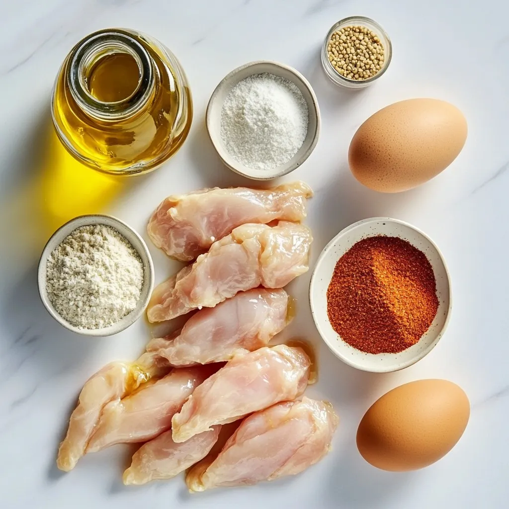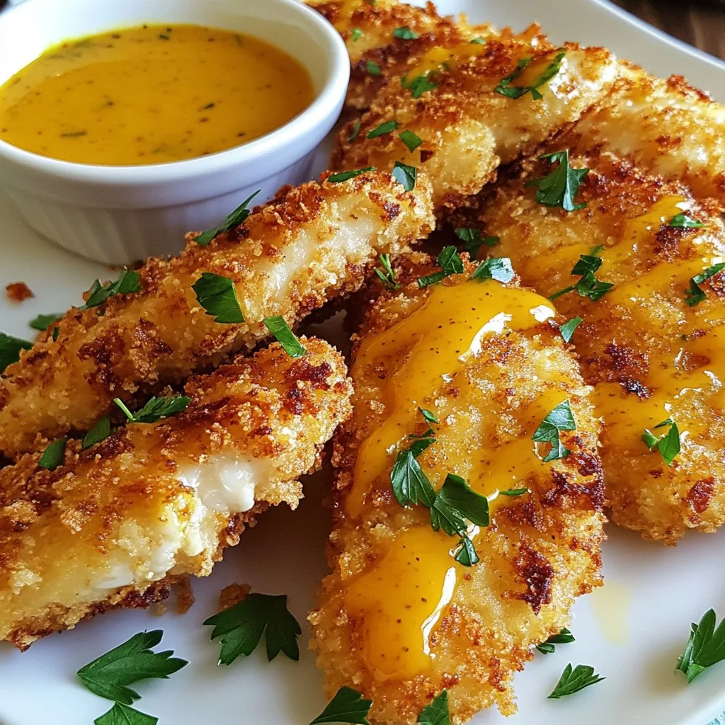 - 1 lb chicken tenders - 1/4 cup honey - 1/4 cup Dijon mustard - 2 tablespoons olive oil - 1 teaspoon garlic powder - 1 teaspoon smoked paprika - Salt and pepper to taste - 1 cup breadcrumbs (panko for extra crunch) - 1/2 cup all-purpose flour - 2 large eggs To make honey mustard chicken tenders, you need one pound of chicken tenders. For the sauce, use a quarter cup each of honey and Dijon mustard. You will add two tablespoons of olive oil for richness. Use one teaspoon each of garlic powder and smoked paprika for flavor. Season with salt and pepper to your taste. For the coating, have one cup of breadcrumbs and half a cup of all-purpose flour ready, along with two large eggs for binding. If you want to switch things up, here are some ideas: - You can replace Dijon mustard with yellow mustard for a milder taste. - Maple syrup works well as a substitute for honey if you need a vegan option. - Use coconut oil instead of olive oil for a different flavor. - For a gluten-free option, try gluten-free breadcrumbs and flour. - If you don’t have smoked paprika, regular paprika or chili powder can add a nice kick. These choices help keep the dish fun and exciting while still being delicious! {{ingredient_image_1}} First, gather your ingredients. You need chicken tenders, honey, Dijon mustard, olive oil, garlic powder, smoked paprika, salt, pepper, breadcrumbs, flour, and eggs. This makes it easy to mix everything. Preheat your oven to 400°F (200°C). Line a baking sheet with parchment paper. This step helps with easy clean-up later. In a small bowl, whisk together honey, Dijon mustard, olive oil, garlic powder, smoked paprika, salt, and pepper. Mix it until everything is smooth and combined. This sauce gives the chicken a great flavor. Next, set up your breading station. You need three bowls: one with flour, one with beaten eggs, and one with breadcrumbs. This makes it simple to bread the chicken tenders. Take each chicken tender. First, dip it into the flour, covering it well. Shake off any extra flour. This helps the egg stick better. Then, dip the tender into the egg mixture. Make sure it is fully covered, then let the excess egg drip off. This step is key for a crispy coating. Finally, coat the tender in the breadcrumbs. Press gently to make sure the crumbs stick well. Place the breaded chicken tenders on the baking sheet. Drizzle some honey mustard sauce over them for extra flavor. Bake the chicken in your preheated oven for 20 to 25 minutes. Flip them halfway through to get even cooking. They are done when they turn golden brown. The internal temperature should reach 165°F (75°C). Serve these warm with extra honey mustard sauce for dipping. Enjoy! To make the best breaded chicken tenders, start with dry hands. Wet hands can make the breading fall off. Use one hand for the flour and the other for eggs. This helps keep your fingers clean and the coating intact. Make sure to shake off the excess flour after coating. This helps the egg stick better. When you dip in the egg, let it drip a bit before coating with breadcrumbs. This keeps the breading from getting soggy. Finally, press the breadcrumbs onto the chicken. This ensures they stick well during baking. For extra crunch, consider using panko breadcrumbs. They give a great texture to your tenders. You can elevate the flavor of your chicken tenders with some easy tweaks. Add herbs like thyme or rosemary to the breadcrumb mixture. A squeeze of lemon juice in the honey mustard sauce adds a nice tang. You might also try mixing in some grated Parmesan cheese with the breadcrumbs. This gives a savory kick. If you want a spicy twist, add cayenne pepper to the flour or breadcrumbs. For a smoky flavor, use smoked paprika as I do in my recipe. This small change can make a big difference. One big mistake is not preheating the oven. Always make sure it’s hot before baking the chicken. This helps the tenders cook evenly and become crispy. Another common error is overcrowding the baking sheet. Give each tender space to breathe. If they touch, they will steam instead of crisp up. Lastly, don’t skip the flipping step! Flipping halfway through helps both sides brown nicely. These tips can help you avoid common pitfalls and make your honey mustard chicken tenders shine. Pro Tips Use Panko Breadcrumbs: Panko breadcrumbs create an extra crunchy texture that elevates the chicken tenders, giving them a delightful bite. Let the Chicken Rest: After breading, allow the chicken tenders to rest for 5-10 minutes before baking. This helps the coating adhere better during cooking. Flavor Variations: Experiment with different mustards, such as whole grain or honey mustard, to customize the flavor profile of the sauce. Serve Fresh: For the best taste and texture, serve the tenders immediately after baking while they are hot and crispy. {{image_2}} You can switch up the sauce to keep things fresh. Try a spicy sriracha honey or a tangy barbecue sauce. A creamy ranch can also work well. Each sauce gives the chicken tenders a new twist. Mix and match until you find your favorite! If you want to change the texture, try different coatings. Instead of breadcrumbs, use crushed cornflakes or nuts. Almonds or pecans add a nice crunch and flavor. You can also skip the flour for a gluten-free option. Just coat the chicken in eggs and breadcrumbs alone. Pairing sides can elevate your meal. Fresh veggies like carrots and celery add a nice crunch. A simple salad with greens and a light vinaigrette works well too. For something warm, try roasted potatoes or sweet potato fries. Each side brings its own fun flavor to the table. After cooking your honey mustard chicken tenders, let them cool to room temperature. Place them in an airtight container. Store them in the fridge for up to four days. This keeps them fresh and safe to eat. If you want to save some tenders for later, freezing is a great choice. First, let them cool completely. Then, arrange them in a single layer on a bakin