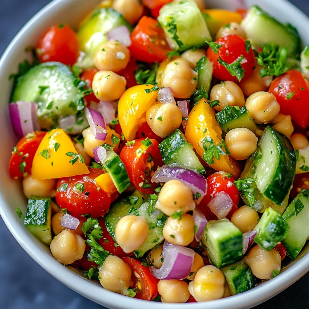 A refreshing salad with chickpeas, fresh vegetables, and a zesty lemon garlic dressing.