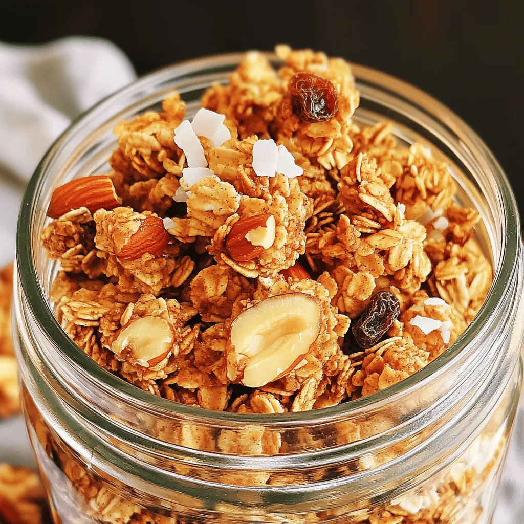 To make Maple Cinnamon Granola Clusters, gather these simple items: - 3 cups rolled oats - 1 cup nuts (almonds, walnuts, or pecans), chopped - 1 cup shredded coconut (unsweetened) - 1/2 cup maple syrup - 1/4 cup coconut oil, melted - 1 teaspoon cinnamon - 1/2 teaspoon vanilla extract - 1/4 teaspoon salt - 1/2 cup dried fruits (raisins, cranberries, or apricots), chopped Choosing the right ingredients is key for great granola. Here are my tips: - Oats: Use old-fashioned rolled oats. They give the best crunch. - Nuts: Choose fresh nuts. Look for whole nuts that smell sweet and nutty. - Coconut: Pick unsweetened shredded coconut for a natural flavor. - Maple syrup: Go for pure maple syrup. It tastes better than imitation. - Coconut oil: Make sure it is refined for a light flavor. - Spices: Fresh spices give your granola more flavor. If you have allergies, here are some easy swaps: - Nuts: Use seeds like pumpkin or sunflower seeds for nut-free granola. - Coconut: If you can't eat coconut, try more oats instead. - Maple syrup: Honey or agave syrup works as a sweetener too. - Oil: You can use olive oil or canola oil if coconut oil is not an option. - Dried fruits: Any dried fruit can replace the ones listed. Just choose your favorite! Start by preheating your oven to 350°F (175°C). This temperature helps the granola cook evenly. Next, take a large baking sheet and line it with parchment paper. This step keeps the clusters from sticking to the pan. It also makes cleanup easy. In a big mixing bowl, add 3 cups of rolled oats, 1 cup of chopped nuts, and 1 cup of shredded coconut. Stir them gently to mix. In another bowl, combine 1/2 cup of maple syrup, 1/4 cup of melted coconut oil, 1 teaspoon of cinnamon, 1/2 teaspoon of vanilla extract, and 1/4 teaspoon of salt. Whisk these together until smooth. Pour this liquid mix over the dry ingredients. Stir until every piece is coated well. Spread the mixture evenly on your prepared baking sheet. Press it down gently to form a compact layer. Bake it in the oven for 20-25 minutes. Watch for the edges to turn golden brown. When done, remove the baking sheet and let it cool for about 10 minutes. After cooling, use your hands to break the granola into clusters. Finally, mix in your choice of 1/2 cup of chopped dried fruits. Allow the granola to cool completely before moving it to an airtight container. Enjoy your tasty snack! For crunchy granola clusters, use rolled oats. They give the best chew and crunch. Mix in chopped nuts for extra crunch and flavor. I love using almonds or walnuts, but you can choose your favorite. Make sure to pack the mixture tightly on the baking sheet. This helps form solid clusters. Press down gently with your hands. This small step makes a big difference. Bake until the edges turn golden brown. Watch closely, as baking times can vary. To keep your granola fresh, store it in an airtight container. Glass jars work well and look nice, too. Place the jar in a cool, dry place. Avoid the fridge, as it can add moisture. Granola can last for two weeks at room temperature. If you want it to last longer, freeze it. Use freezer-safe bags or containers. It can stay fresh for up to three months in the freezer. You can easily make this recipe gluten-free. Just use certified gluten-free oats. For nut-free options, swap nuts with seeds. Sunflower seeds or pumpkin seeds work great. If you need a nut-free version, skip the nuts and add more coconut or seeds. This way, you still get a tasty crunch. Adjusting ingredients helps everyone enjoy this snack. {{image_2}} You can change the nuts in your granola. Try using almonds, walnuts, or pecans. If you want more crunch, add seeds like sunflower or pumpkin seeds. These combinations give your granola fun textures and tastes. You can even mix different nuts for a unique flavor. Maple syrup is sweet, but you can use honey or agave syrup. Honey gives a nice floral taste, while agave is milder. Both options work well in this recipe. They keep your granola clusters sweet and chewy. If you want a lower sugar option, use mashed bananas or applesauce for sweetness. Adding spices can boost the flavor of your granola. Try nutmeg or ginger for a warm kick. You can also add a splash of almond or coconut extract for extra depth. These simple changes let you customize your granola to fit your taste. Feel free to experiment and find your favorite mix! To keep your maple cinnamon granola clusters fresh, use an airtight container. Glass jars or plastic bins work well. Store them in a cool, dry place. Avoid sunlight, as heat can make them go stale. If you want to enjoy them longer, consider refrigerating them. This method keeps the clusters crunchy and tasty. When stored properly, granola clusters last about two weeks at room temperature. If you want to extend their life, freeze them. They can stay fresh for up to three months in the freezer. Just make sure to seal them tightly to avoid freezer burn. When you're ready to eat them, let them thaw at room temperature. Check your clusters for any off smells or changes in color. If they smell rancid or look dull, it’s time to toss them. Also, if they feel soft or soggy instead of crunchy, they may be spoiled. Keeping an eye on these signs helps you enjoy only the best snacks. You can use quick oats, but it will change the texture. Quick oats will make the granola finer and less crunchy. Rolled oats give a nice chewiness, which adds to the clusters. For best results, I recommend sticking with rolled oats. To keep your granola soft, do not bake it too long. Bake it just until the edges are golden brown, about 20-25 minutes. Also, let it cool for only a short time before breaking it into clusters. If you want softer clusters, mix in more dried fruits or nuts. These granola clusters are great on their own. You can also serve them with yogurt for breakfast. I love adding fresh fruits like berries or banana slices on top. You can even sprinkle them on ice cream for a fun dessert