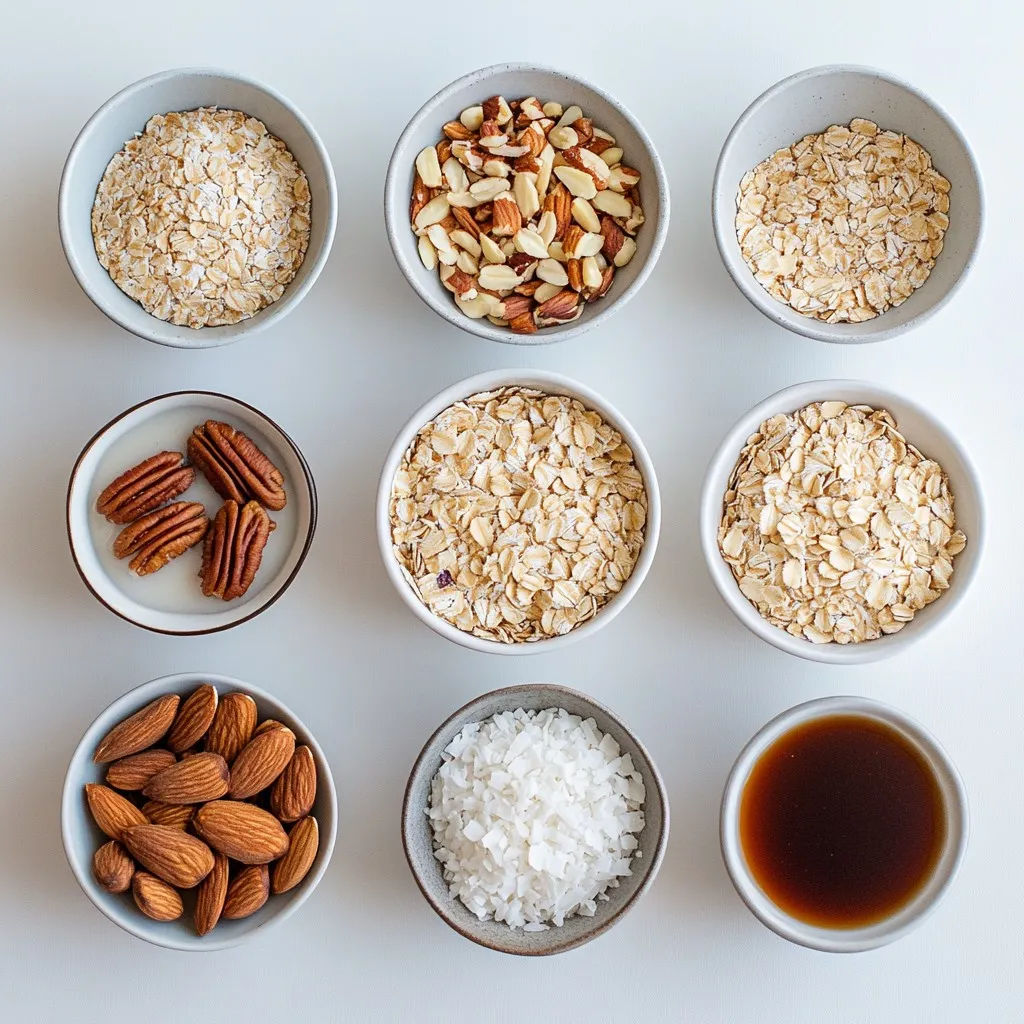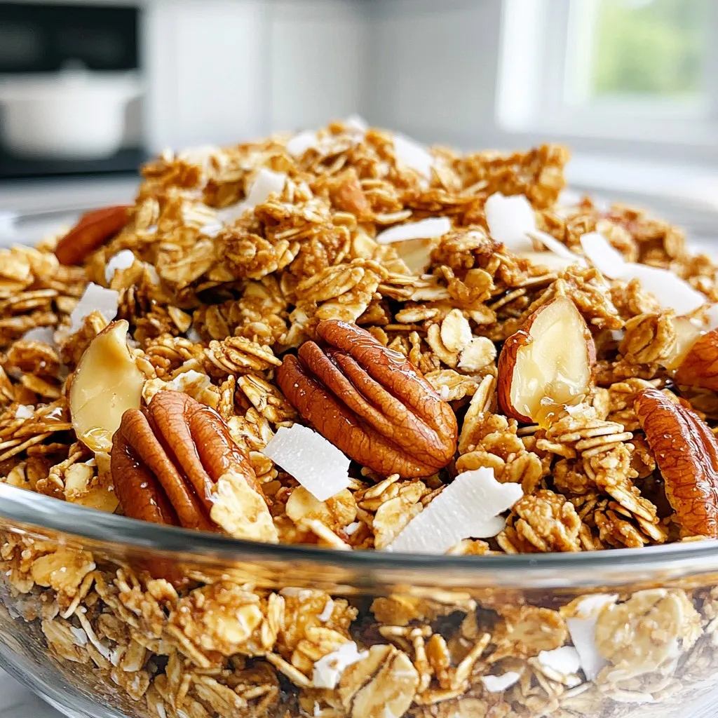 To make this Maple Pecan Granola, gather these key ingredients. You need rolled oats for a great base. The pecans add a nice crunch. Almonds boost flavor and nutrition. Shredded coconut gives a subtle sweetness. Maple syrup sweetens the mix naturally. Melted coconut oil helps bind it all together. Vanilla extract adds depth to the taste. Cinnamon brings warmth, while salt balances the flavors. If you want, add dried cranberries or raisins for extra sweetness. Each ingredient plays a role, making this granola both tasty and healthy.