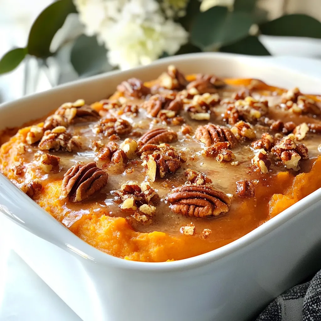 A deliciously sweet and nutty casserole made with mashed sweet potatoes and topped with a crunchy pecan mixture.