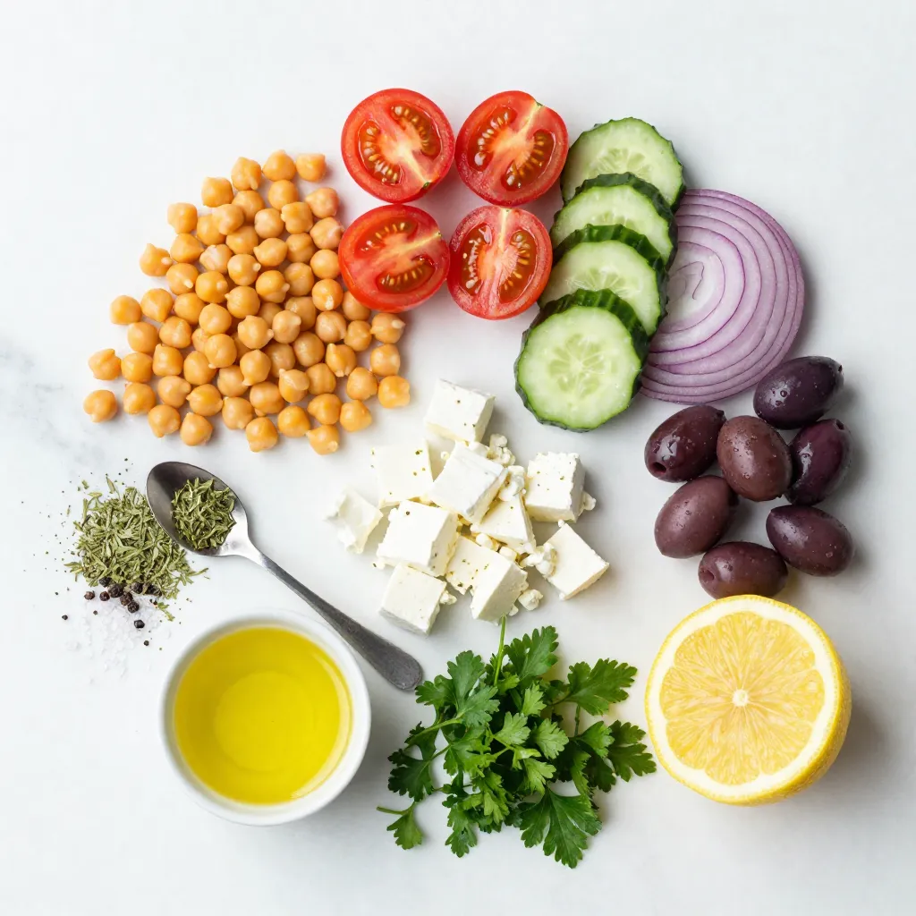 Start with one can of chickpeas. Rinse and drain them well. Next, take one cup of cherry tomatoes and slice them in half. Then, grab one cucumber and dice it into small pieces. For some sharpness, finely chop half a red onion. Slice half a cup of Kalamata olives and set them aside. Finally, crumble half a cup of feta cheese and chop a quarter cup of fresh parsley. Gather all these ingredients for your salad.