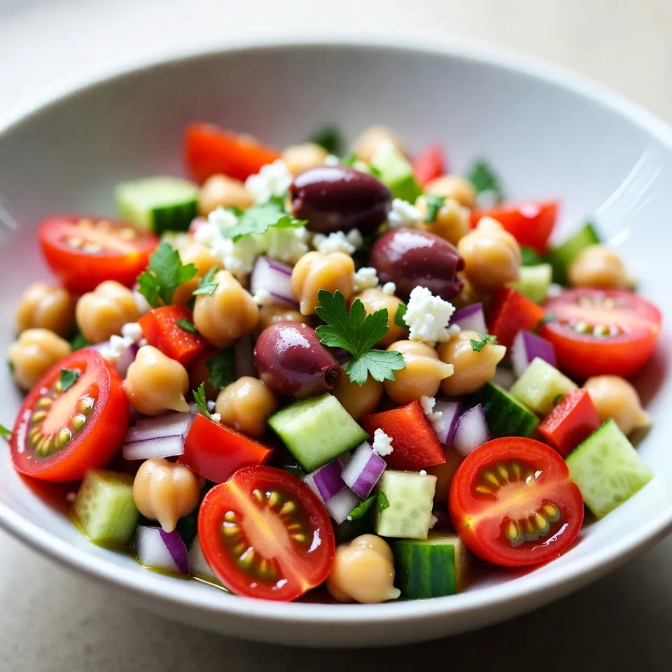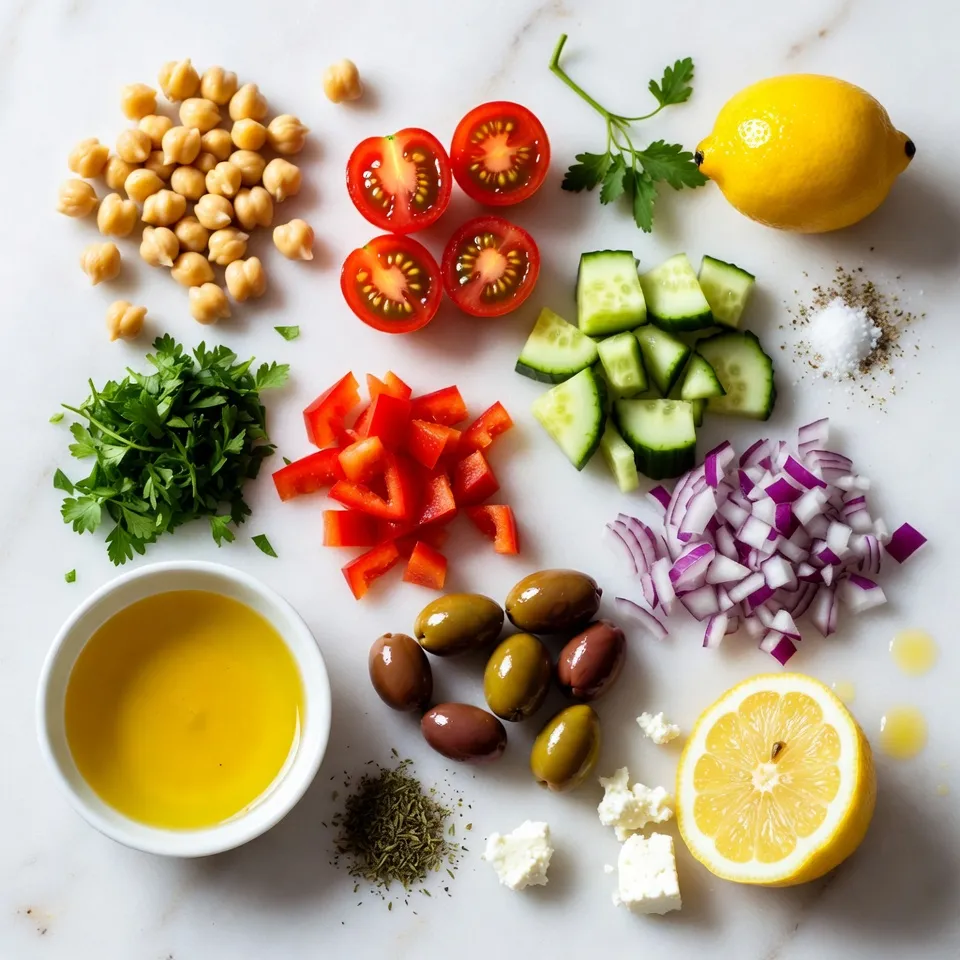 - 1 can (15 oz) chickpeas, rinsed and drained - 1 cup cherry tomatoes, halved - 1 cucumber, diced - 1 red bell pepper, diced - 1/4 red onion, finely chopped - 1/2 cup Kalamata olives, pitted and sliced - 1/4 cup feta cheese, crumbled - 2 tablespoons fresh parsley, chopped Chickpeas are the star of this salad. They add protein and fiber. Rinsing and draining them helps remove excess salt. Fresh vegetables make the dish colorful and crunchy. Cherry tomatoes bring sweetness. Cucumbers add a refreshing bite. Red bell peppers offer a slight crunch and sweetness. Red onions give a mild zing. Kalamata olives add a briny twist, while feta cheese brings creaminess and tang. Finally, parsley adds a fresh touch. - 2 tablespoons olive oil - 2 tablespoons lemon juice - 1 teaspoon dried oregano - Salt and pepper to taste The dressing is simple but flavorful. Olive oil adds richness and a smooth texture. Fresh lemon juice brightens the flavor and balances the oil. Dried oregano gives a hint of earthiness. Salt and pepper enhance all the tastes. Whisking these together creates a tasty dressing that brings the salad to life. With these fresh ingredients, you create a Mediterranean feast on your plate. Each bite is a burst of flavor and texture, making this salad a favorite for any meal. {{ingredient_image_1}} First, grab a large mixing bowl. Add one can of rinsed and drained chickpeas. Next, toss in one cup of halved cherry tomatoes. Then, add one diced cucumber, one diced red bell pepper, and a finely chopped red onion. These fresh veggies give the salad a nice crunch. Now, it's time to add flavor. Toss in half a cup of sliced Kalamata olives and a quarter cup of crumbled feta cheese. The olives add a briny taste, while the feta gives it creaminess. In a small bowl, whisk together two tablespoons of olive oil and two tablespoons of lemon juice. Add one teaspoon of dried oregano to the mix. Season with salt and pepper to taste. Whisk until the dressing is well combined. This simple dressing brings all the flavors together. Pour the dressing over the salad base. Gently toss everything together. Make sure all the ingredients are evenly coated. This step is key for great flavor. Next, sprinkle two tablespoons of chopped parsley on top for added freshness. Finally, taste the salad. Adjust the seasoning by adding more salt, pepper, or lemon juice if you want more flavor. Enjoy your fresh and colorful Mediterranean chickpea salad! - Choosing the Right Chickpeas: Use canned chickpeas for ease. Rinse them well to remove extra salt. If you have time, cook dried chickpeas for better taste. Soak them overnight and boil until tender. - Freshness of Vegetables: Select bright, firm vegetables. Look for plump cherry tomatoes and crisp cucumbers. Fresh herbs like parsley add great flavor. Always wash your veggies before cutting. - Serving Suggestions: Serve your salad in a big bowl for sharing. You can also use individual plates for a nice touch. Keep it colorful to make it eye-catching. - Garnishing Ideas: Add extra parsley on top for color. Place whole Kalamata olives around the salad. A light drizzle of olive oil adds shine and flavor. Pro Tips Fresh Ingredients: Use ripe cherry tomatoes and fresh cucumber for a burst of flavor. The quality of your ingredients can elevate this simple salad. Chill Before Serving: Let the salad sit in the refrigerator for about 30 minutes before serving. This allows the flavors to meld beautifully. Make It Your Own: Feel free to add other vegetables like bell peppers or even avocado. Customize the salad to your taste preferences! Serving Suggestions: This salad pairs wonderfully with grilled meats or can be enjoyed as a light meal on its own. Consider serving with pita bread for a complete Mediterranean experience! {{image_2}} You can switch feta cheese for goat cheese. Goat cheese gives a creamy touch. It has a tangy flavor that pairs well with the salad. You may also try mozzarella for a milder taste. Just remember, each cheese will change the salad's flavor. Feel free to mix in other vegetables. Try adding bell peppers in different colors for more crunch. Zucchini or carrots can also work well. If you like greens, add spinach or kale. Each swap offers a new taste and texture. Want to make the salad heartier? Add proteins like grilled chicken or shrimp. Chickpeas are great, but meats boost the meal. For a plant-based option, toss in some cubed tofu. You’ll get a protein-packed dish that fills you up. For those who love heat, add red pepper flakes or chopped jalapeños. A little spice can make the salad pop with flavor. Alternatively, add fresh herbs like basil or mint for a fresh kick. Each spice or herb gives a new twist to the dish. To keep your Mediterranean chickpea salad fresh, store it in an airtight container. This method helps prevent the salad from drying out or absorbing other fridge smells. You can also cover the bowl tightly with plastic wrap. The shelf life of this salad is about three days in the fridge. After that, the veggies may lose their crunch, and the taste might change. Always check for any signs of spoilage before eating. Can you freeze Mediterranean chickpea salad? I don't recommend it. Freezing can make the vegetables mushy and change the flavors. The texture of the chickpeas can also change. If you still want to freeze it, consider the best practices. First, store only the chickpeas and dressing separately from the veggies. This way, you can keep the salad fresh when you thaw it. Use freezer-safe bags or containers to prevent freezer burn. Chickpeas are a great source of protein. One can of chickpeas has about 15 grams of protein. They are also rich in fiber, which helps you feel full. Each serving has about 12 grams of fiber. This helps with digestion and keeps your heart healthy. Nutritional Profile Chickpeas are low in fat and high in nutrients. They contain vitamins and minerals like iron and magnesium. These nutrients support your body’s functions. 