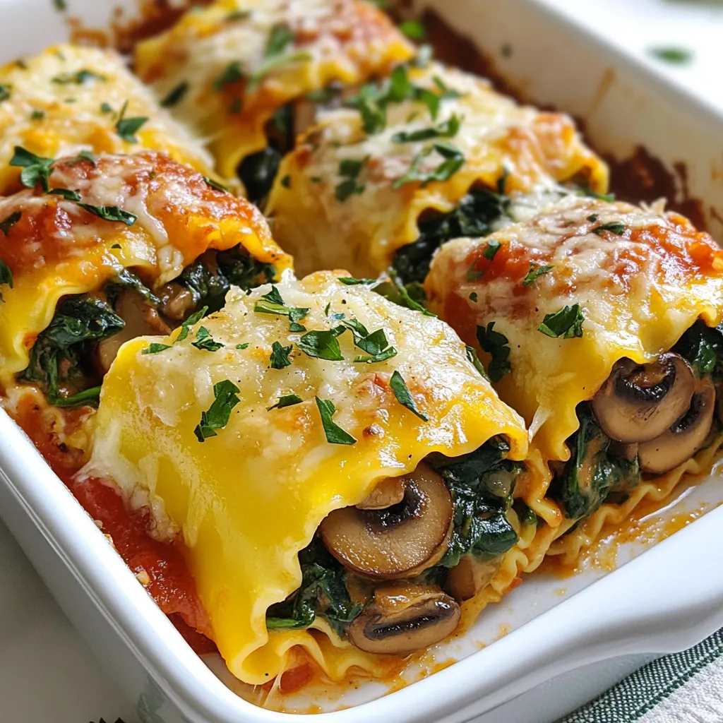 Delicious lasagna rolls filled with a savory mushroom and spinach mixture, topped with marinara and cheese.