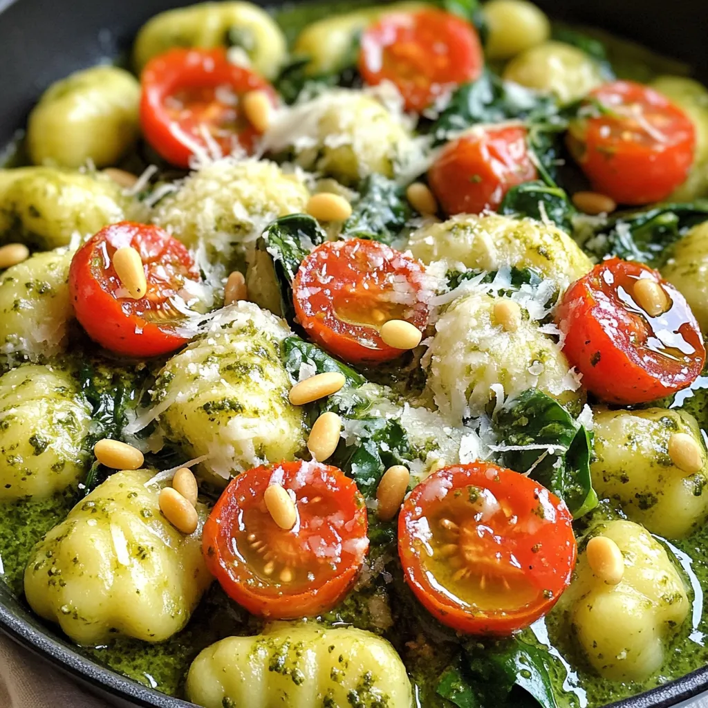 For this tasty dish, gather these simple ingredients: - 1 pound gnocchi (store-bought or homemade) - 1 cup fresh basil pesto - 1 cup heavy cream - 1 cup cherry tomatoes, halved - 1 cup spinach, roughly chopped - 1/2 cup grated Parmesan cheese - 2 cloves garlic, minced - 1 tablespoon olive oil - Salt and pepper to taste - Pine nuts, toasted for garnish (optional) You can use any store-bought gnocchi for this recipe. If you want homemade gnocchi, it’s easy to make from potatoes and flour. Fresh basil pesto gives the best flavor. If you can’t find it, you can use a jarred version. Heavy cream makes the sauce rich and creamy. If you want a lighter option, use half-and-half or a non-dairy cream. Cherry tomatoes add sweetness. You could swap them for diced bell peppers or sun-dried tomatoes. Spinach adds color and nutrition. Kale or arugula works well too. Parmesan cheese brings a salty, nutty flavor. You can use Pecorino Romano for a sharper taste. Garnishing with toasted pine nuts adds a nice crunch. You could also sprinkle more Parmesan cheese on top. Fresh basil leaves make it look pretty and add extra flavor. For a kick, try a dash of red pepper flakes. Start by gathering all your ingredients. You need: - 1 pound gnocchi (store-bought or homemade) - 1 cup fresh basil pesto - 1 cup heavy cream - 1 cup cherry tomatoes, halved - 1 cup spinach, roughly chopped - 1/2 cup grated Parmesan cheese - 2 cloves garlic, minced - 1 tablespoon olive oil - Salt and pepper to taste - Pine nuts, toasted for garnish (optional) Next, wash the cherry tomatoes and spinach. Halve the tomatoes and chop the spinach. Mince the garlic. This prep makes cooking smooth and easy. Heat a large pot or deep skillet over medium heat. Add the olive oil. Once it's hot, toss in the minced garlic. Sauté it for about a minute. You want it fragrant, not brown. Then, add the halved cherry tomatoes. Cook them for 2-3 minutes. They should soften but not fall apart. Pour in the heavy cream. Stir it well and let it simmer for a couple of minutes. Now, it's time for the gnocchi. Add it to the pot. Make sure it gets coated with the creamy mix. Cook according to the package instructions, usually 2-3 minutes. After cooking, mix in the fresh basil pesto and chopped spinach. Stir until the spinach wilts. Add the grated Parmesan cheese. Stir until it melts and blends in. Season with salt and pepper to your taste. If you want a thicker sauce, let it simmer for another minute. To make sure your gnocchi is perfect, watch the cooking time closely. Overcooking can make it mushy. Use heavy cream for a rich texture. If you want it lighter, you can use half-and-half. Make sure to stir gently when mixing in the pesto and spinach. This helps keep the gnocchi intact. Finally, if you like a bit of crunch, sprinkle toasted pine nuts on top before serving. They add a nice texture and flavor. Enjoy your meal! When cooking One Pot Creamy Pesto Gnocchi, some errors can ruin your dish. Here are some to watch out for: - Overcooking the gnocchi: Gnocchi cooks fast, usually in 2-3 minutes. Keep an eye on it! - Burning the garlic: Sauté garlic for only a minute. If it turns brown, it will taste bitter. - Not stirring enough: Stir the gnocchi well. It helps mix the flavors and prevents sticking. You can change the taste of this dish easily. Here are some ideas: - Add protein: Cook chicken, shrimp, or sausage in the pot for extra heartiness. - Switch up the greens: Try kale or arugula instead of spinach. They add different flavors. - Use different nuts: Swap pine nuts for walnuts or almonds for a new crunch. Having the right tools makes cooking easier. Here’s what you need: - Large pot or deep skillet: This allows enough space for cooking and mixing. - Wooden spoon or spatula: Use this for stirring gently without scratching your pot. - Measuring cups: Accurate measurements help you get the right flavors. These tips will help you create a tasty and creamy gnocchi dish that impresses! {{image_2}} You can easily make One Pot Creamy Pesto Gnocchi vegetarian. Just skip the Parmesan cheese, or use a plant-based cheese. For a vegan version, swap heavy cream for coconut cream or a nut-based cream. These options keep the dish rich and creamy while catering to plant-based diets. To make this dish gluten-free, choose gluten-free gnocchi. Many brands offer tasty alternatives made from potato or rice flour. Just check the label to ensure it meets your needs. The rest of the ingredients are naturally gluten-free, so you can enjoy this creamy dish without worry. You can add extra ingredients to make this dish even better. Consider adding cooked chicken or shrimp for a protein boost. You can also toss in some sautéed mushrooms or bell peppers for added texture. For a kick, sprinkle in red pepper flakes or a squeeze of lemon juice. Each of these options brings a new layer of flavor to the table, making your meal even more delightful. To store leftovers, place them in an airtight container. Make sure the dish cools down first. You can keep it in the fridge for up to three days. If you want to enjoy it later, consider freezing it. When you reheat your gnocchi, do it gently. Use a skillet over low heat. Add a splash of cream or water to keep it moist. Stir often to prevent sticking. You can also use the microwave. Heat it in short bursts, stirring in between. To freeze One Pot Creamy Pesto Gnocchi, let it cool completely. Place portions in freezer-safe bags. Squeeze out any air before sealing. Label with the date. You can freeze it for up to three months. When ready to eat, thaw it in the fridge overnight before reheating. Yes, you can use homemade pesto. Fresh pesto gives a bright flavor. If you make it yourself, you can control the taste. Use fresh basil, garlic, nuts, and oil for a great mix. Make sure it is smooth and well-blended for the best result. Cooking gnocchi takes about 2 to 3 minutes. Fresh gnocchi cooks quickly in boiling water. You'll know it's done when it f