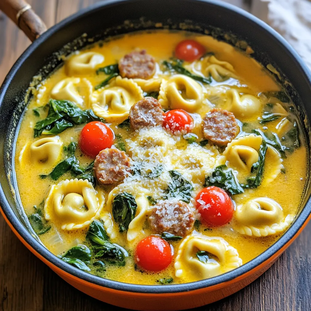 - 1 tablespoon olive oil - 1 pound Italian sausage (mild or spicy, casing removed) - 1 medium onion, diced - 3 cloves garlic, minced - 4 cups vegetable broth - 1 (9-ounce) package refrigerated cheese tortellini - 4 cups fresh spinach, roughly chopped - 1 cup cherry tomatoes, halved - 1 teaspoon dried Italian herbs (oregano and basil) - ½ teaspoon red pepper flakes (optional for heat) - Salt and pepper to taste - Grated Parmesan cheese for serving I love using fresh ingredients in this dish. The Italian sausage adds great flavor. You can pick mild or spicy based on your taste. The cheese tortellini gives a creamy texture that kids enjoy. Fresh spinach adds color and nutrition. Cherry tomatoes burst with sweetness, making every bite delightful. When you visit the store, look for bright green spinach. Avoid wilted or yellow leaves. Choose firm, plump cherry tomatoes. They should feel heavy for their size. For sausage, check the sell-by date. A fresh product has better taste. Always smell the broth before using it. It should smell rich and savory. To start, heat 1 tablespoon of olive oil in a large pot over medium heat. Add 1 pound of Italian sausage, breaking it apart with a wooden spoon. Cook until the sausage is browned, which takes about 5 to 7 minutes. Next, add 1 medium diced onion and 3 cloves of minced garlic to the pot. Sauté them until the onion turns translucent and fragrant, which should be around 3 to 4 minutes. Now, pour in 4 cups of vegetable broth and stir well. Bring the broth to a gentle simmer. Once it starts simmering, add a 9-ounce package of refrigerated cheese tortellini. Cook the tortellini according to the package instructions, usually about 3 to 5 minutes, until they are tender and floating. Stir in 4 cups of roughly chopped fresh spinach and 1 cup of halved cherry tomatoes. Cook for another 2 to 3 minutes, until the spinach wilts and the tomatoes soften. Season the dish with 1 teaspoon of dried Italian herbs, ½ teaspoon of red pepper flakes (if you like heat), salt, and pepper to taste. Mix everything until well combined. - Heating oil and cooking sausage: 5-7 minutes - Sautéing onion and garlic: 3-4 minutes - Simmering broth: 1 minute (just to reach a simmer) - Cooking tortellini: 3-5 minutes - Adding spinach and tomatoes: 2-3 minutes This brings the total cooking time to about 30 minutes, perfect for a quick dinner. While I can't show pictures, I can share tips. When cooking the sausage, look for a nice brown color to ensure it’s done. The onion should be clear, and you should smell the garlic. When the tortellini floats, it's ready! Finally, the spinach should be bright green and wilted, and the tomatoes should look soft. These visual cues help you know your dish is coming along perfectly! To boost the taste of your One-Pot Sausage Spinach Tortellini, try these tips: - Use fresh herbs like basil or parsley for a bright finish. - Add a splash of lemon juice before serving for zest. - Incorporate a dash of balsamic vinegar for depth. These additions will make your dish pop with flavor. You can also experiment with different types of cheese. A mix of Parmesan and mozzarella adds a creamy texture that everyone will love. Even simple recipes can have pitfalls. To avoid common mistakes: - Don’t overcook the tortellini. They should be tender but not mushy. - Use enough salt to enhance the flavors. Taste as you go! - Don’t skip the red pepper flakes if you like heat. They add a nice kick. These steps will help you create a balanced and tasty meal. Having the right tools can speed up your cooking time. Here are some must-haves: - A large pot or Dutch oven for even cooking. - A wooden spoon for stirring and breaking up sausage. - A sharp knife for chopping vegetables quickly. These tools make the process smooth and enjoyable. With the right setup, you can whip up this dish in no time! {{image_2}} You can easily swap ingredients to fit your diet. For a gluten-free option, use gluten-free tortellini. If you're watching your fat intake, lean turkey sausage works well too. You can also replace the olive oil with vegetable broth to cut down on calories. Use low-sodium broth if you need less salt. These changes keep the dish tasty while meeting your needs. Feel free to pack in more veggies for a healthy twist. Bell peppers, zucchini, or mushrooms blend well with this dish. You can add them when you sauté the onion and garlic. For extra protein, toss in beans or cooked chicken. This keeps the meal balanced and filling. Each added ingredient boosts flavor and nutrition. To make this dish vegetarian, skip the sausage. Use mushrooms or lentils for a hearty texture. You can also add more beans like chickpeas for protein. For a vegan version, replace cheese tortellini with a vegan option. Check your broth to ensure it’s plant-based. Add nutritional yeast for a cheesy flavor without dairy. These swaps let everyone enjoy a delicious meal. After you enjoy your meal, let the leftovers cool. Place them in an airtight container. Store the container in the fridge. They will stay fresh for about three days. Make sure to label it with the date. This helps you know when to eat it. When you're ready to eat again, take the leftovers out. You can reheat them on the stove or in the microwave. If using the stove, add a splash of broth or water. This keeps the dish moist. Heat on medium until warm. If using the microwave, cover the bowl with a lid. Heat for 1-2 minutes, stirring halfway. Check that it's hot all the way through. If you want to freeze the dish, use a freezer-safe container. Let it cool completely before sealing. This avoids ice crystals forming. You can freeze it for up to three months. When ready to eat, thaw it in the fridge overnight. Reheat as mentioned above. Enjoy a quick, tasty meal anytime! Yes, you can use frozen tortellini. Just add them to the pot as you would the fresh ones. They may need a few extra minutes to cook. Follow the package instructions for the bes